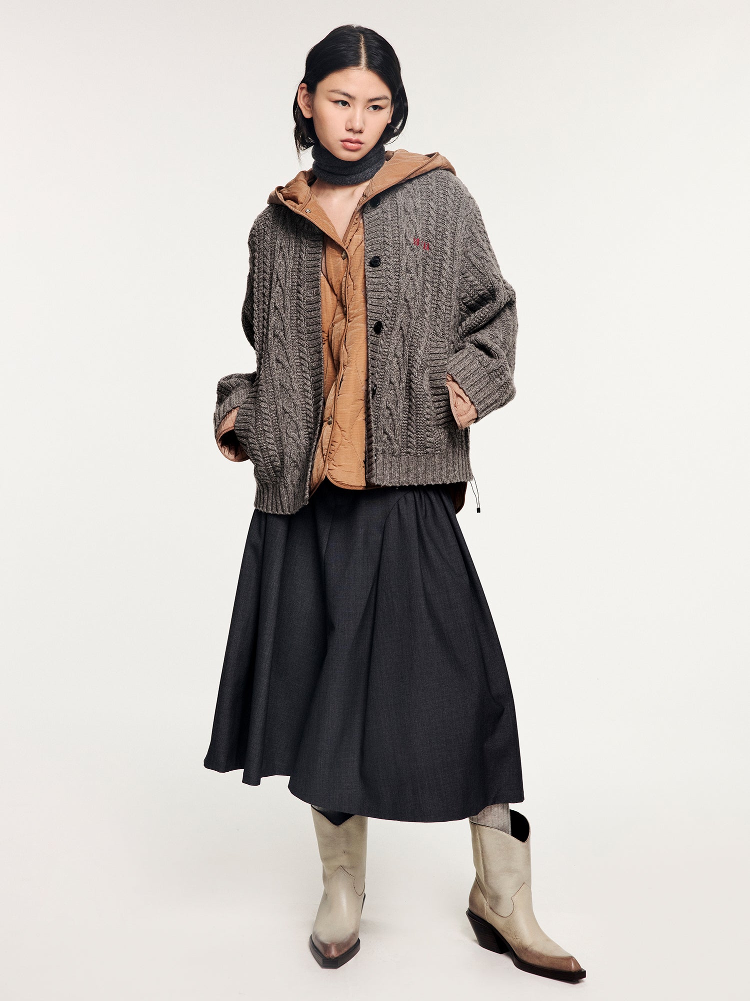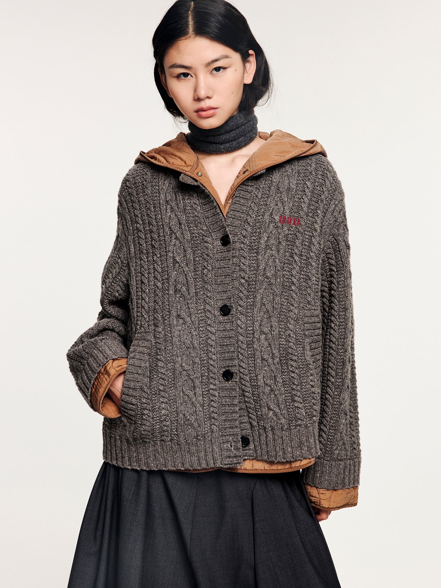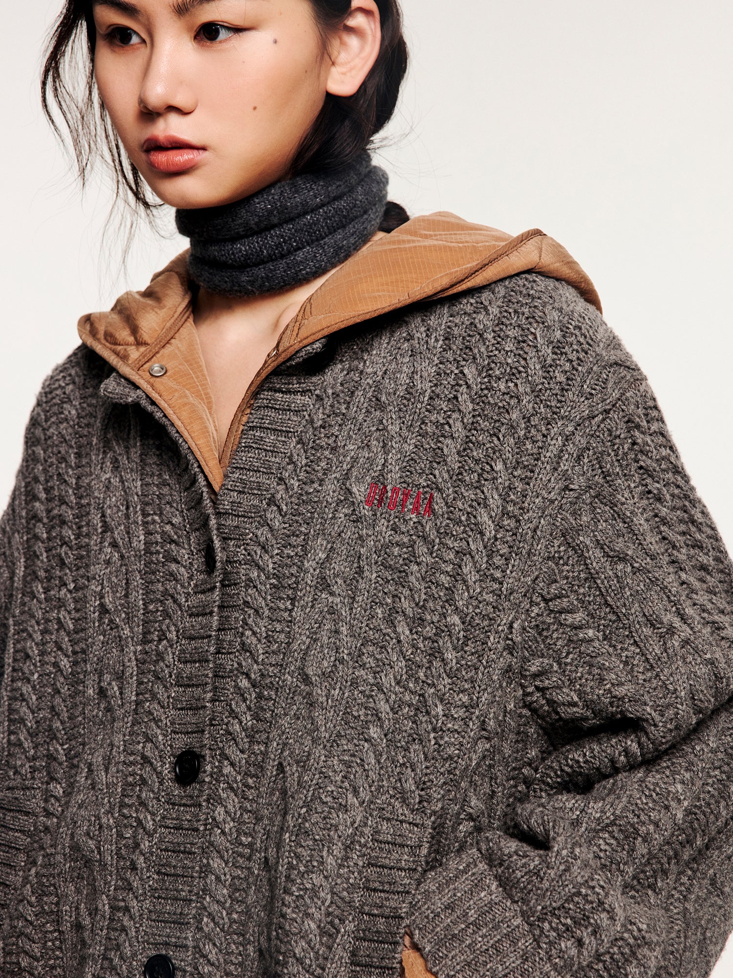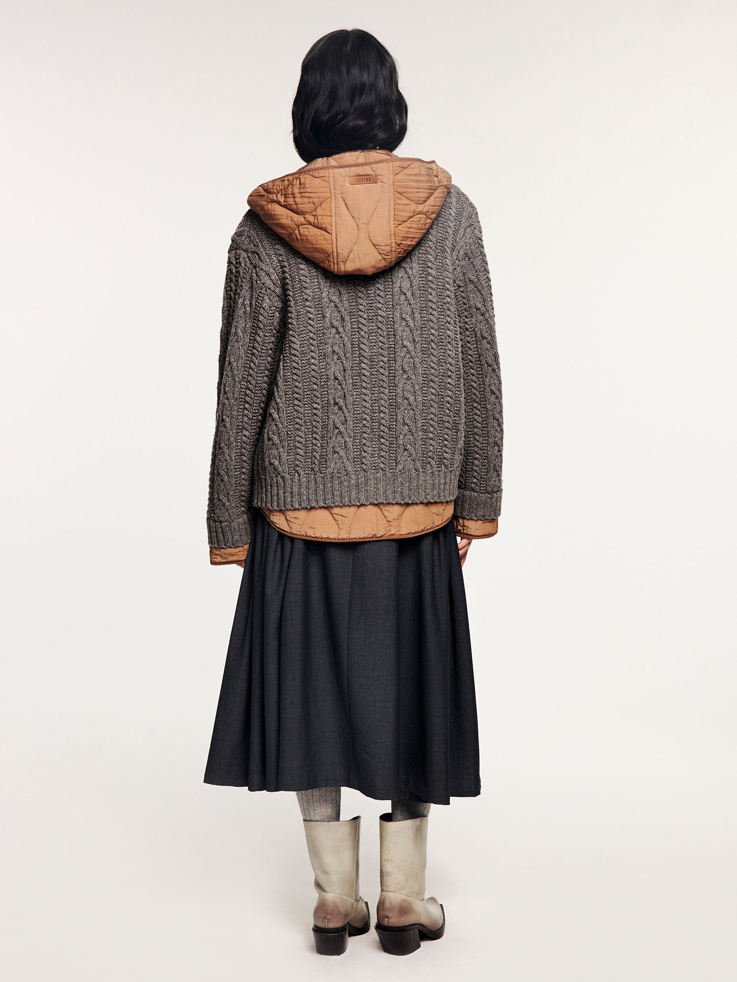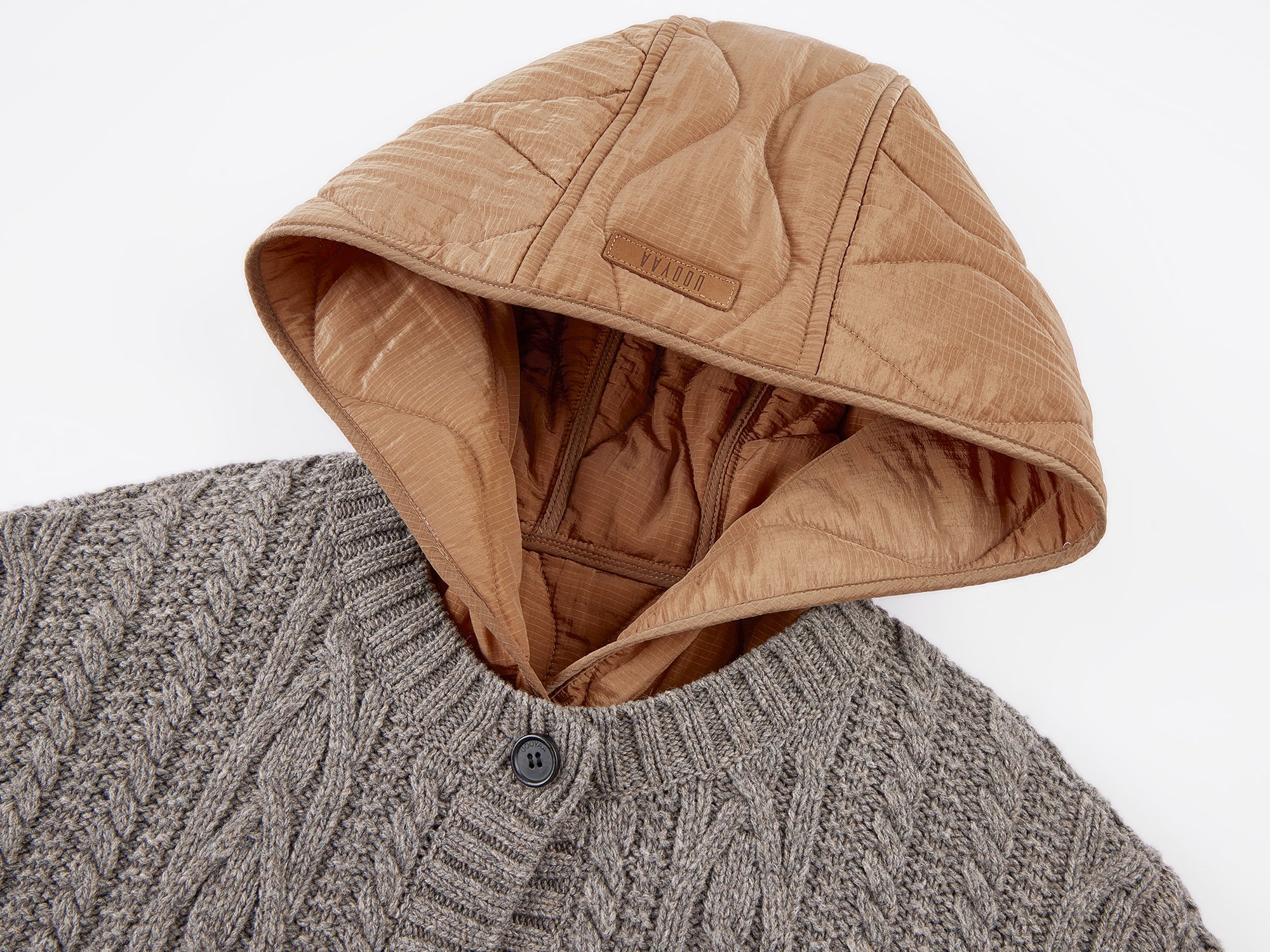 Simulates the look of layering a cable-knit cardigan over a hooded puffer, blending retro warmth with modern ease in a practical two-in-one piece.
