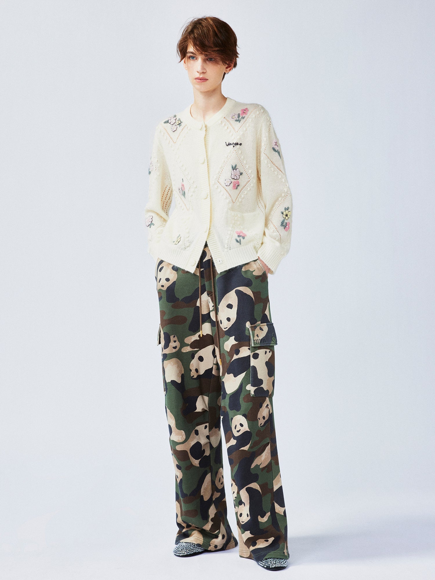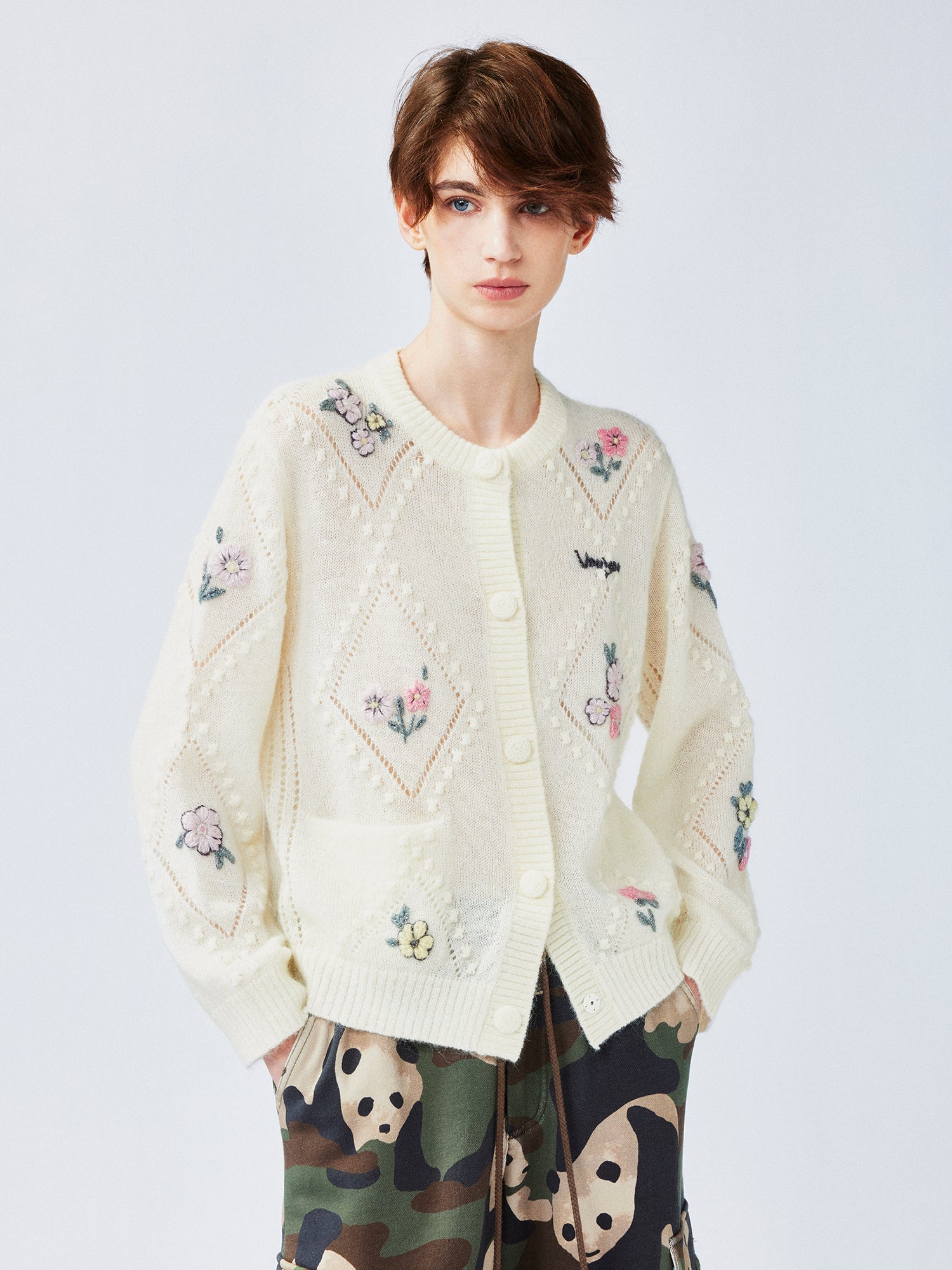 Reinterpreting the diamond-patterned knit cardigan with intricate craftsmanship and soft color combinations, infusing a sweet touch for spring. The relaxed fit adds a casual yet refined style.