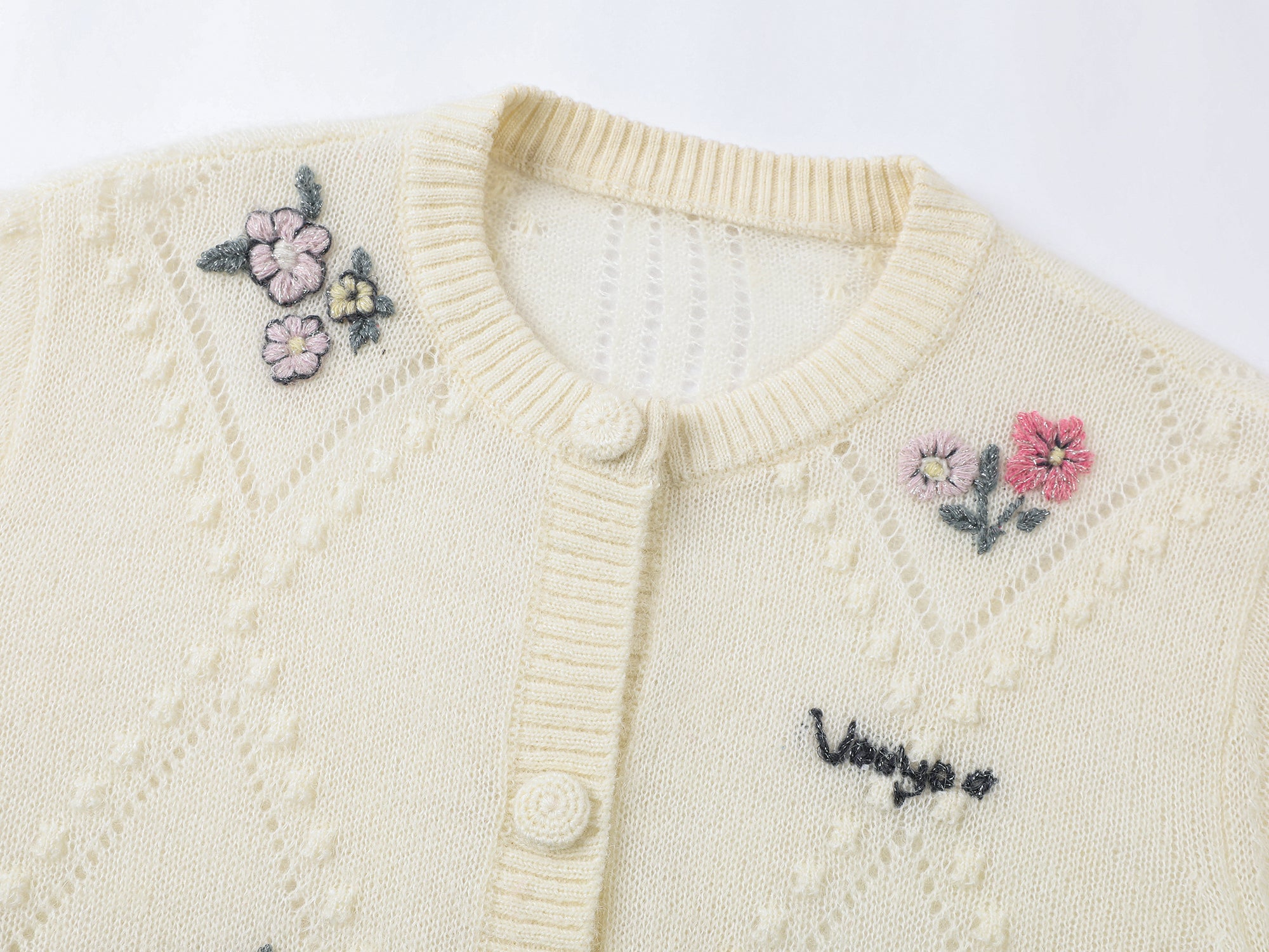 Openwork details combined with textured beads, hand-embroidered flowers for a delicate touch, and a blend of metallic yarn and mohair showcase exquisite craftsmanship, radiating a vibrant springtime vibe.