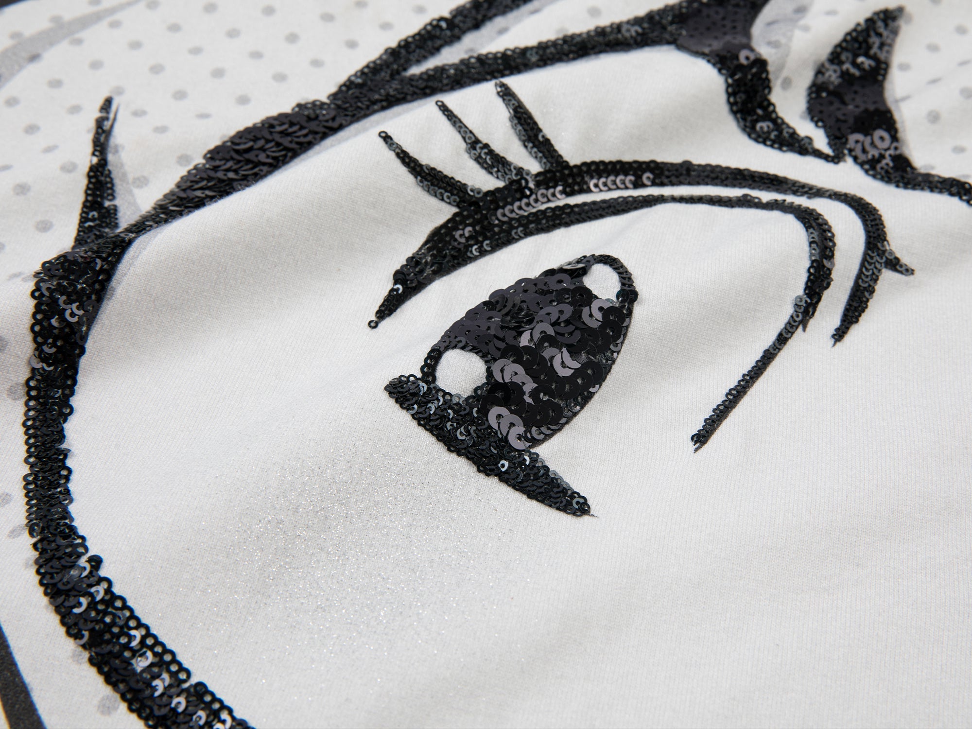 Utilizing pop art techniques like dots, lines, and contrasting colors, enhanced with sequin embellishments, this design magnifies the comic girl's expressions, exuding a vibrant and youthful energy.