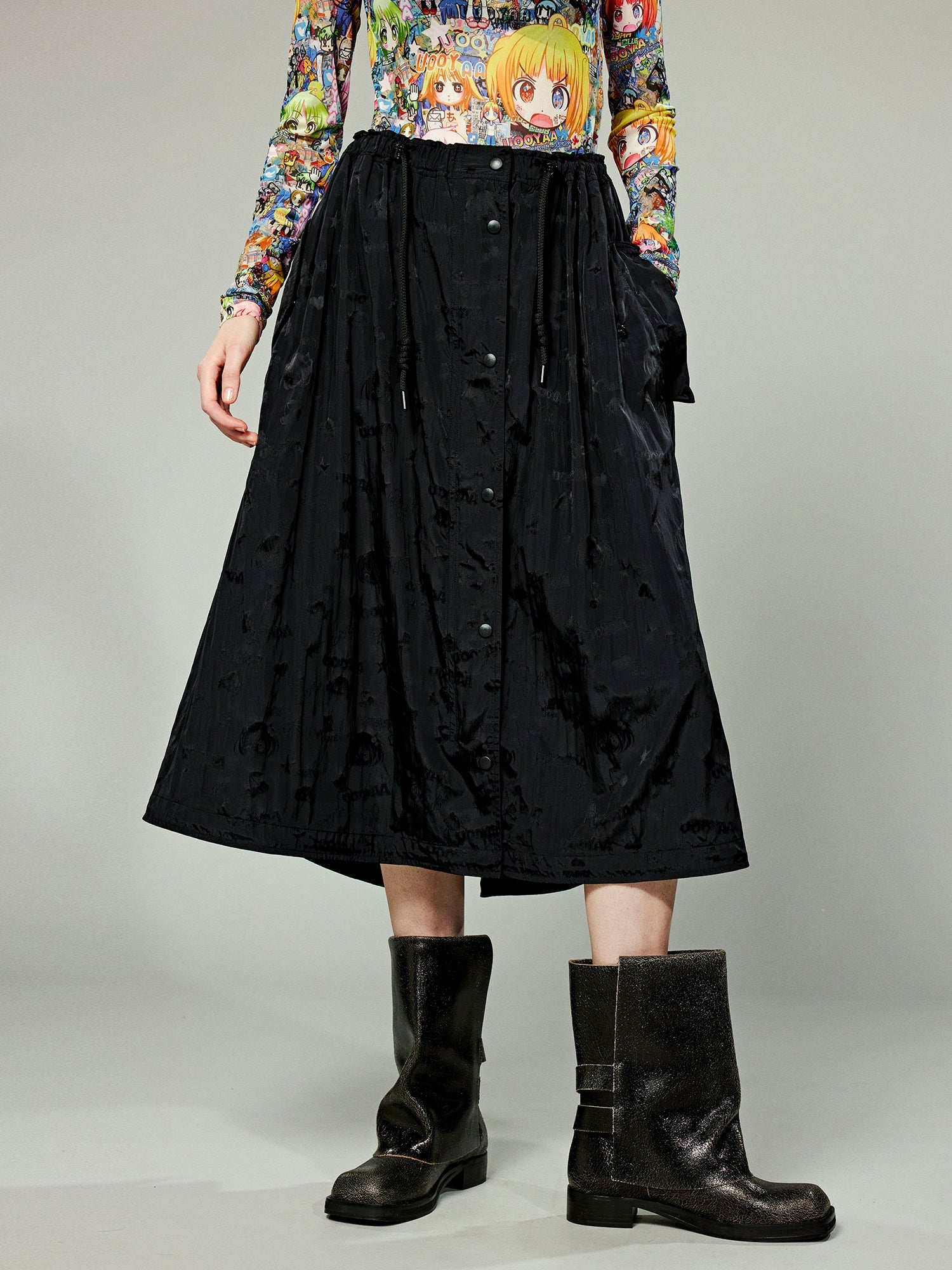 Transforming the whimsical beauty stickers of childhood into a sporty, functional skirt, this piece features nylon jacquard fabric, combining a playful and stylish look.