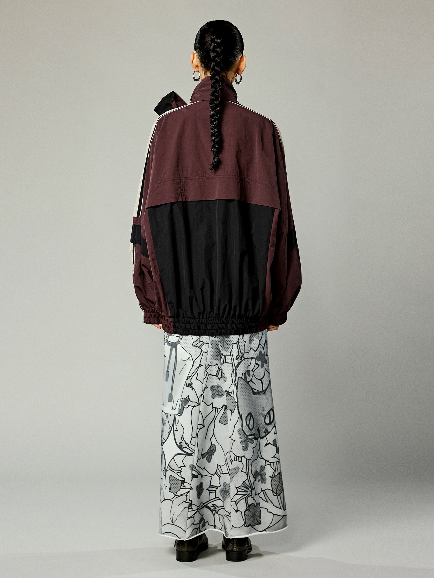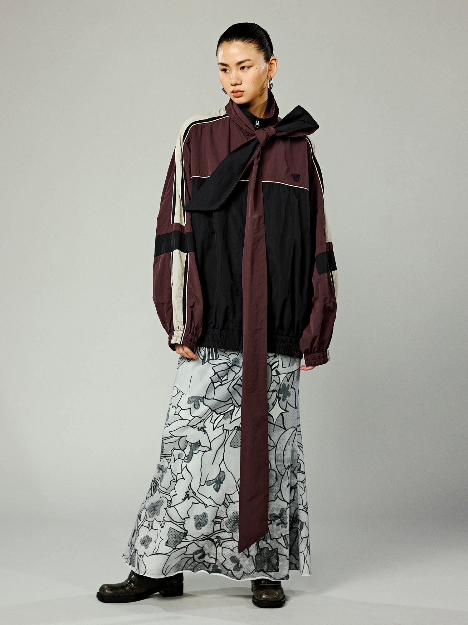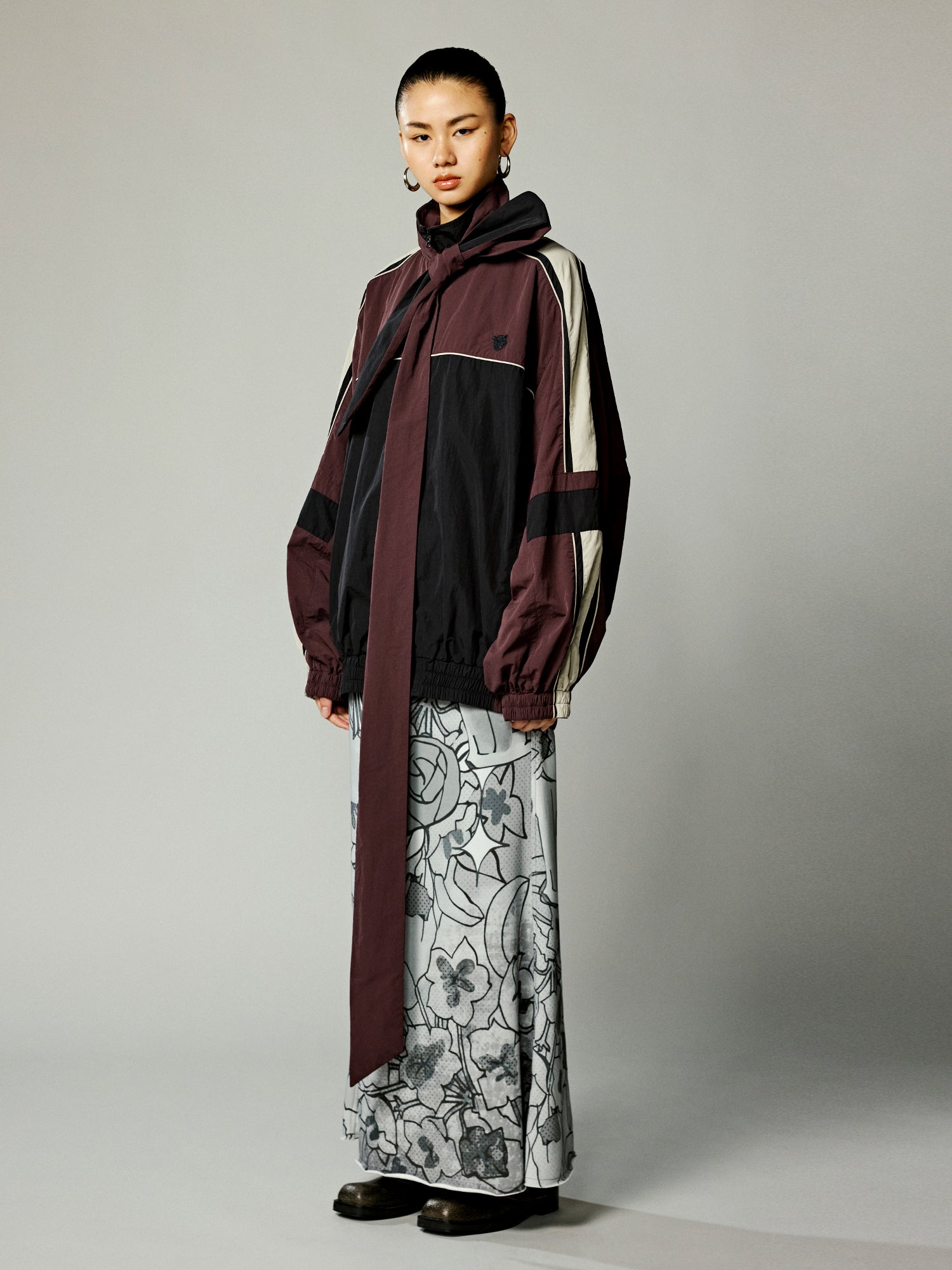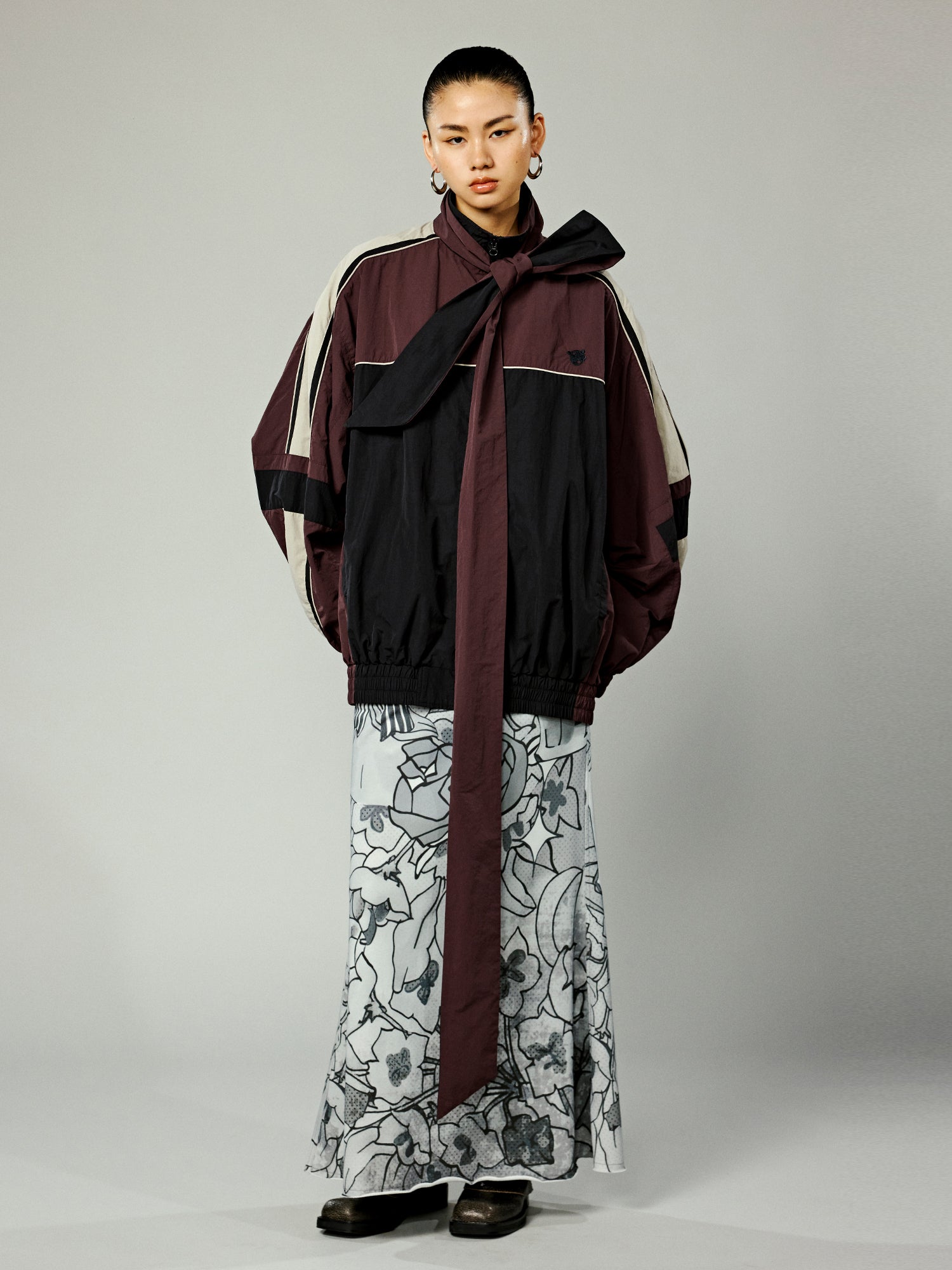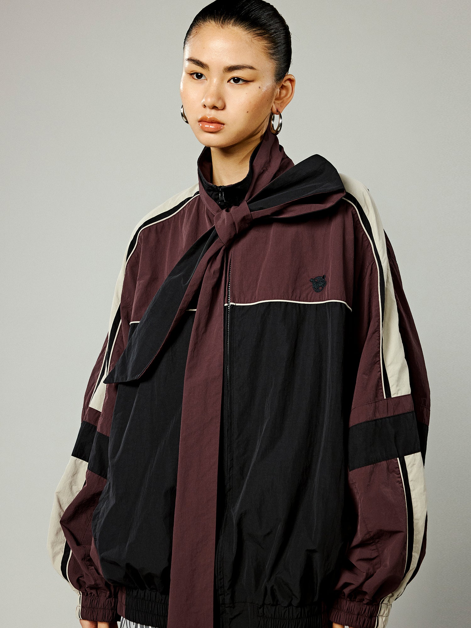 A vintage-inspired sports jacket featuring a long, flowing tie at the collar that can be styled into a bow, seamlessly blending retro color-blocking with a touch of elegance.