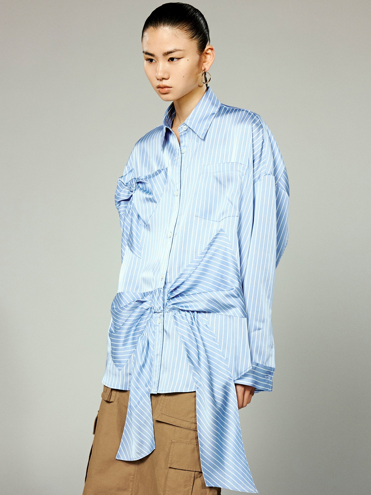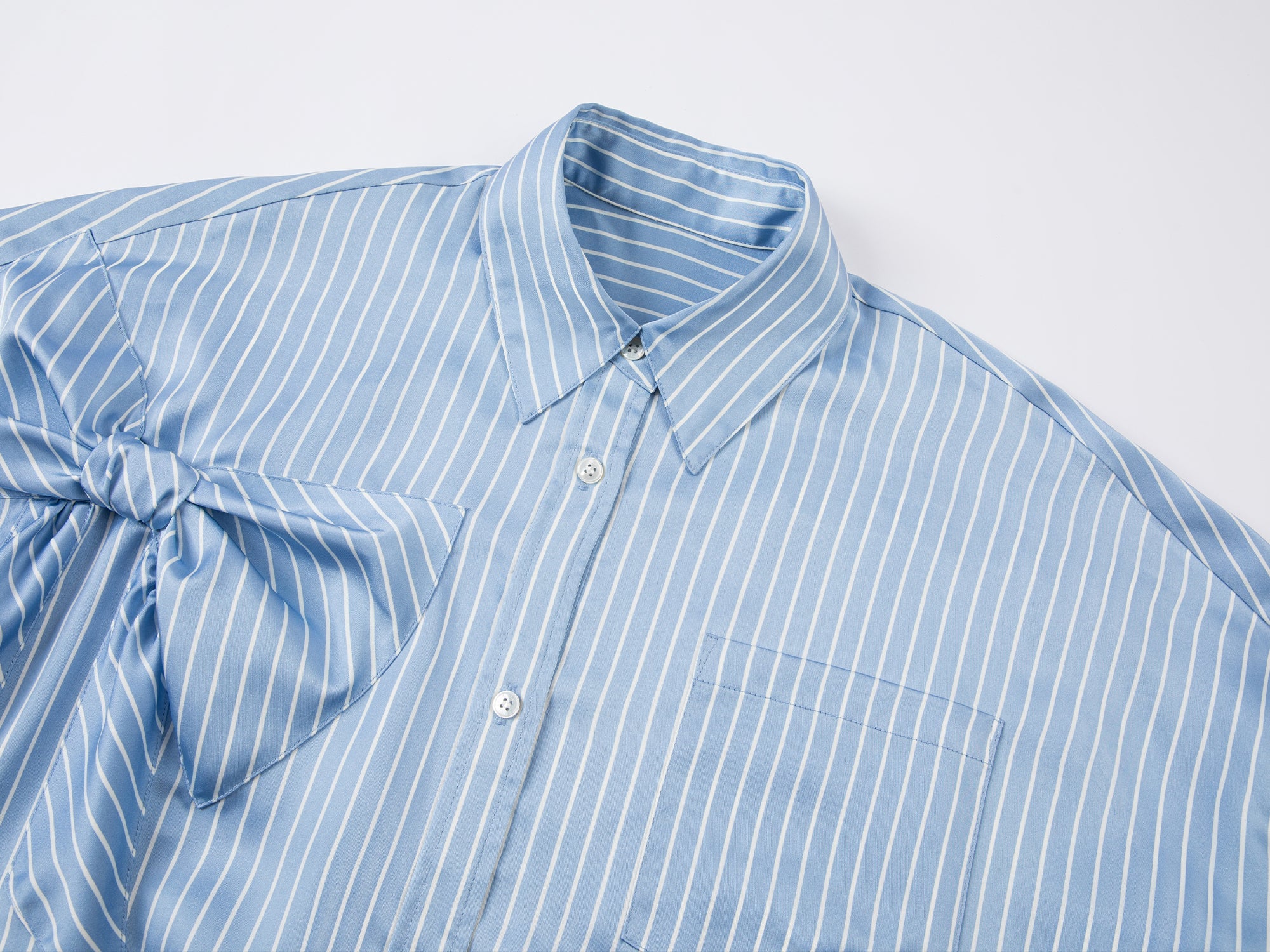 Classic men's shirt in blue and white stripes, featuring 3D bow structures on the shoulders and hem, adding a feminine touch of empowerment.