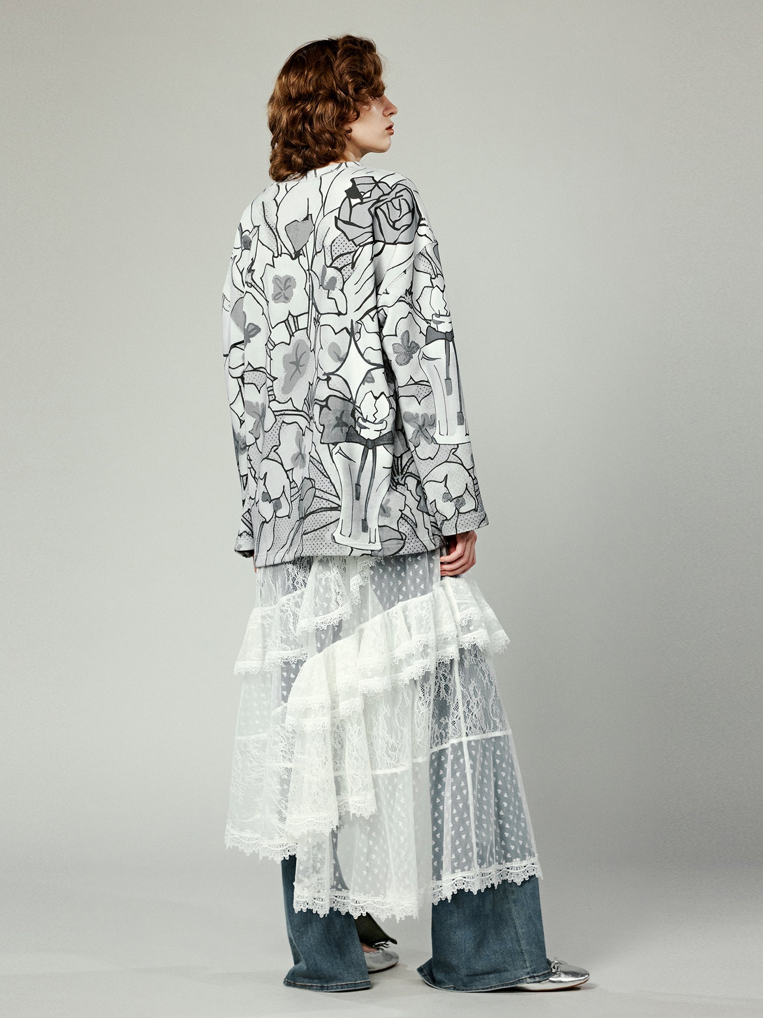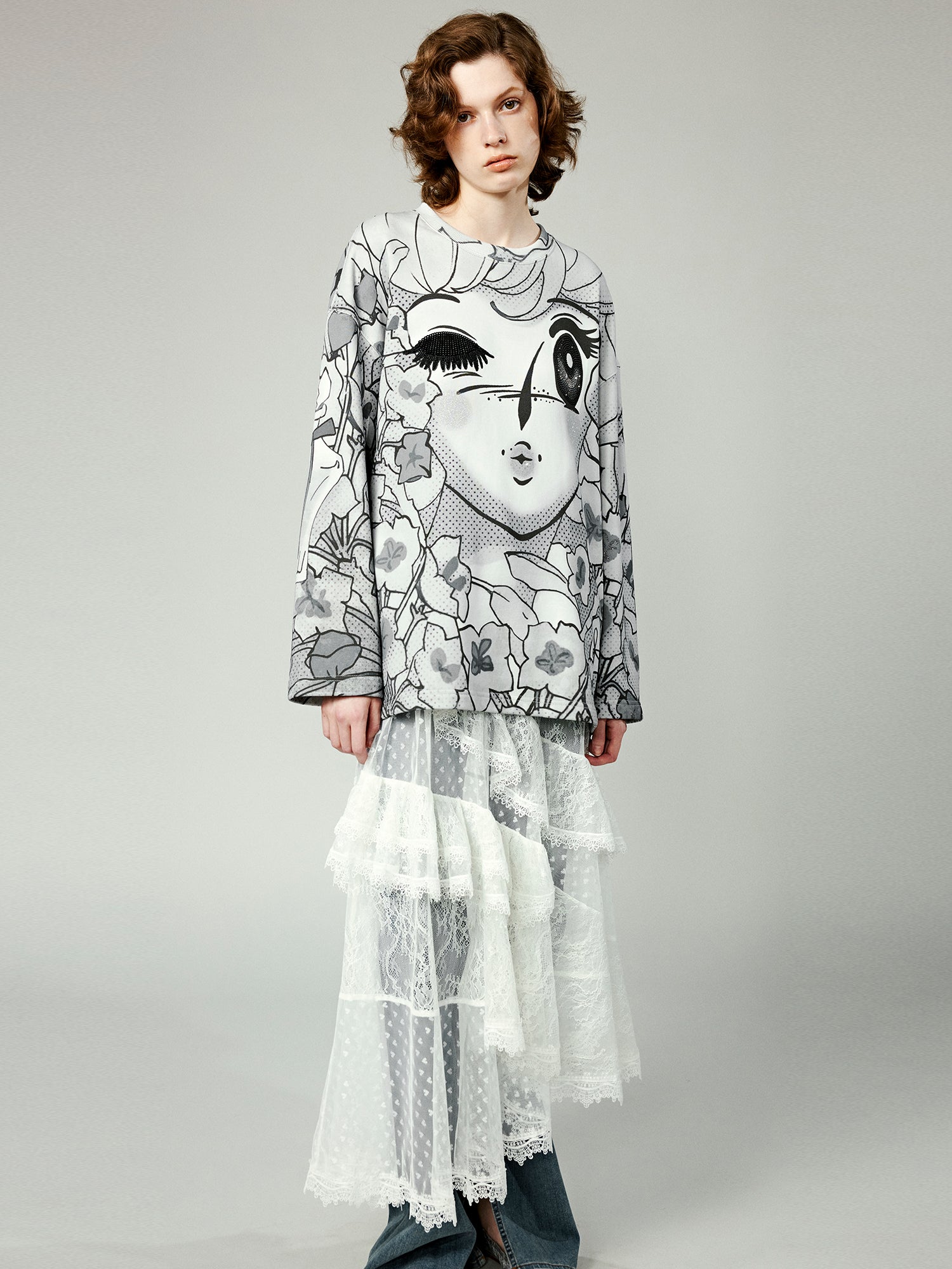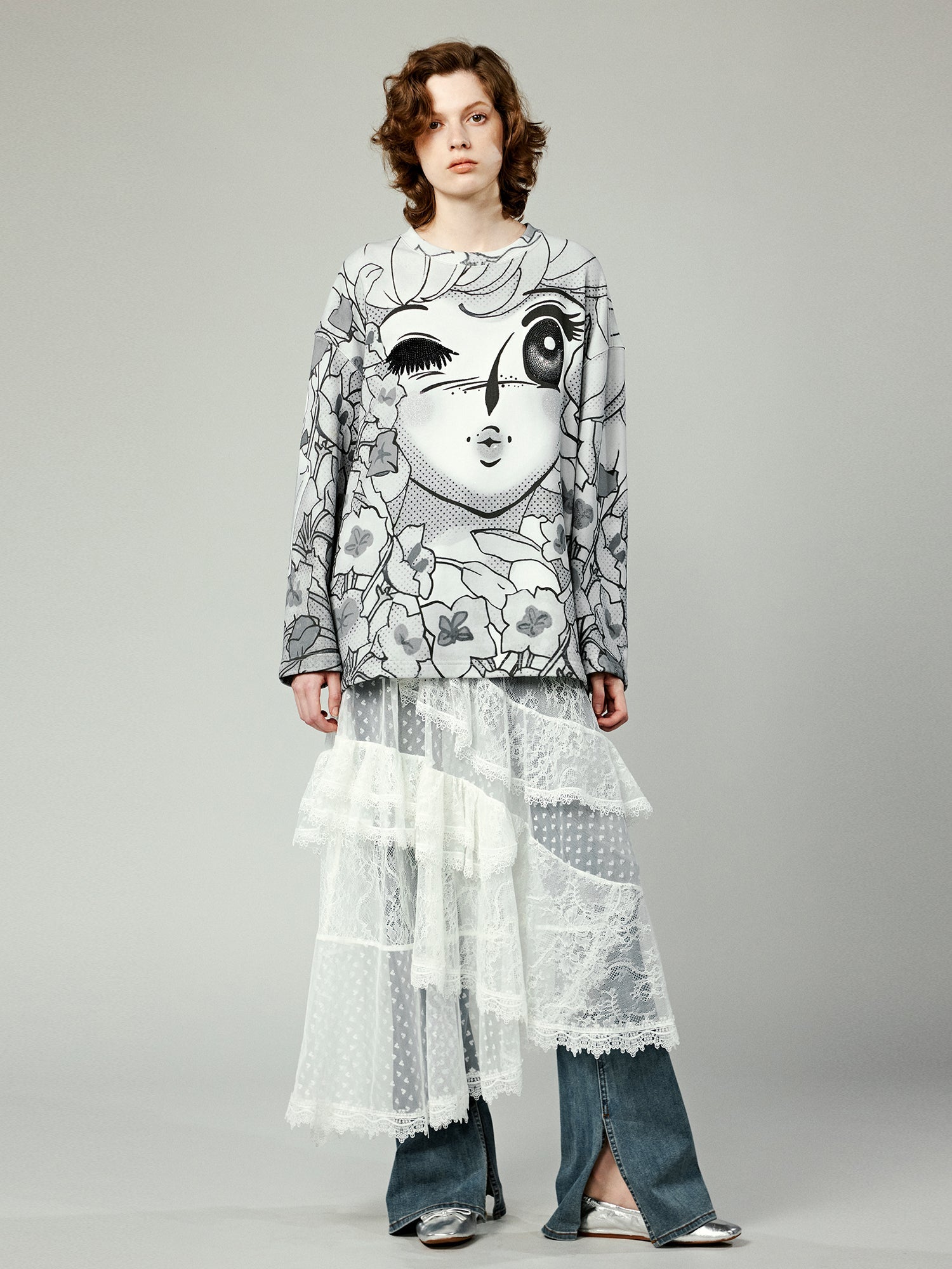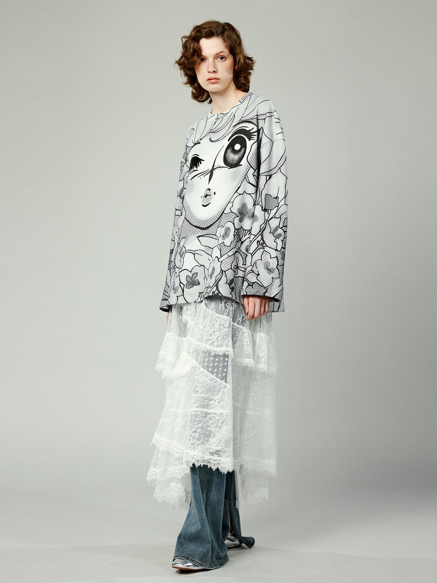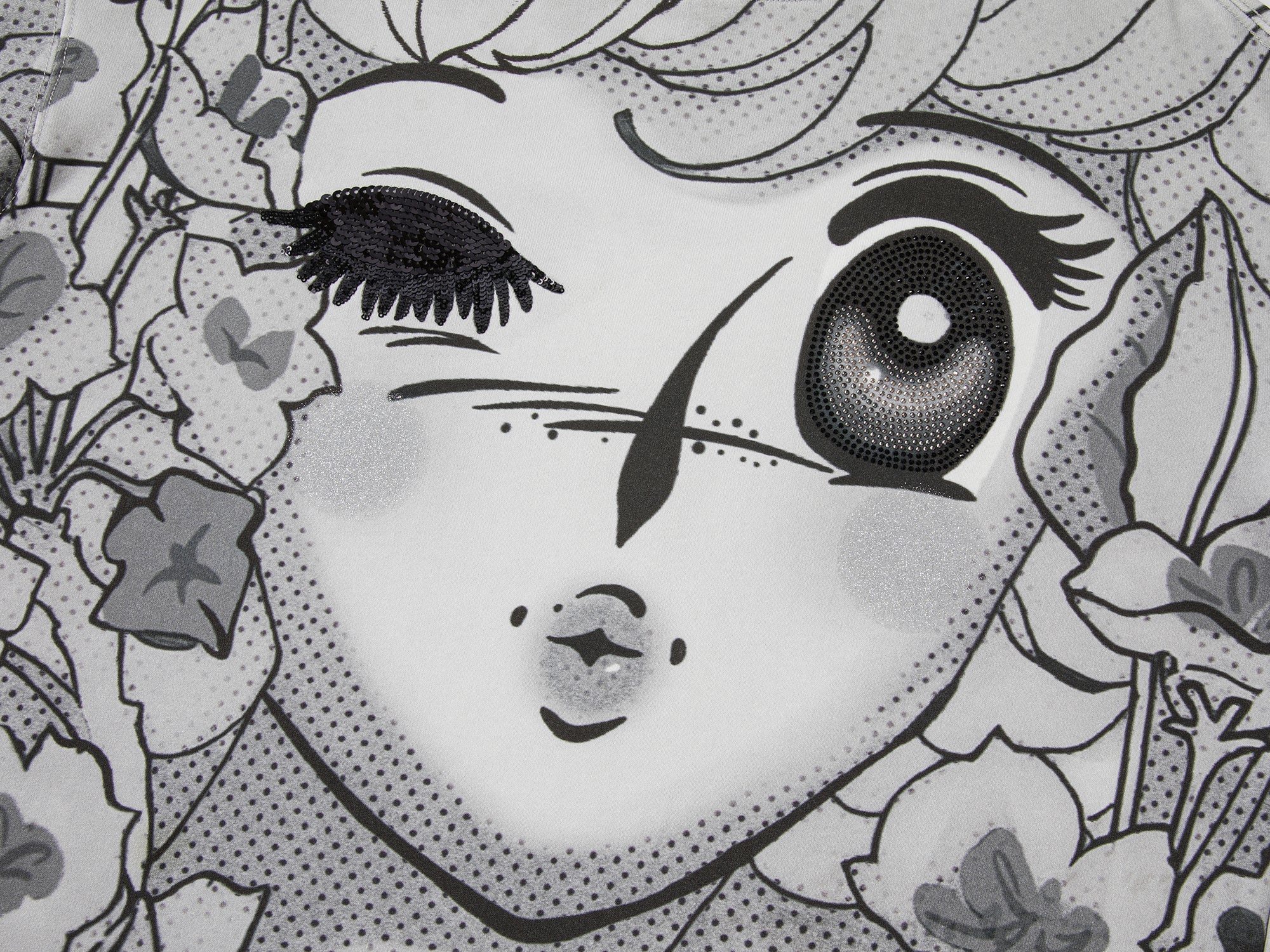 This T-shirt highlights a winking comic girl among flowers, full of youthful energy and vitality.