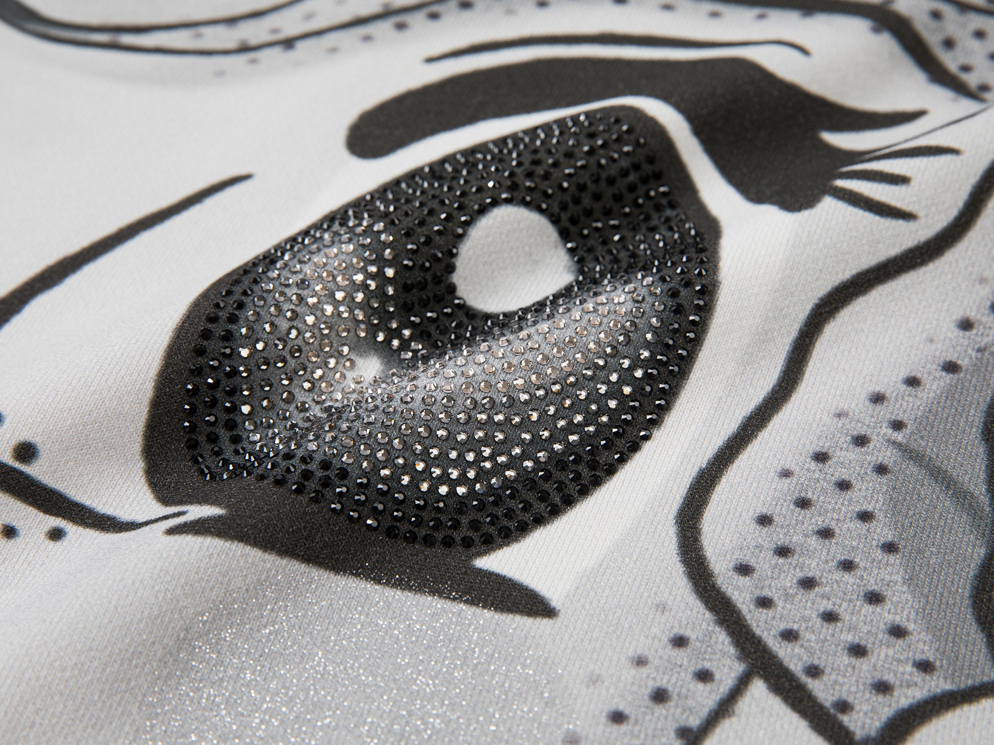 Details include sequined embroidered eyelashes, rhinestone eyes, and glittery blush, creating a delicate yet eye-catching look.