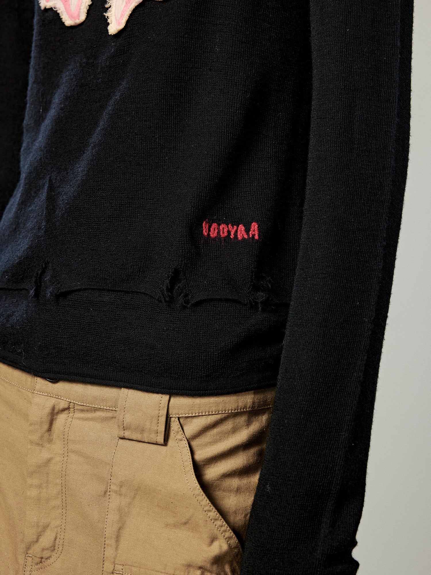 The 3D pink bow, combined with distressed and frayed details, creates a playful yet effortlessly casual look.