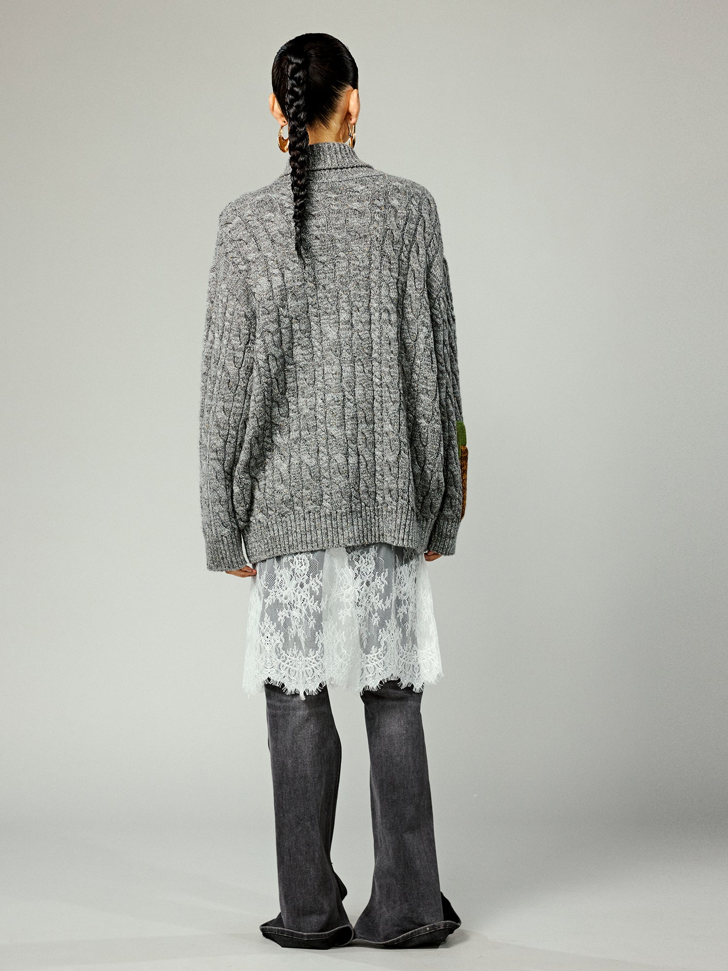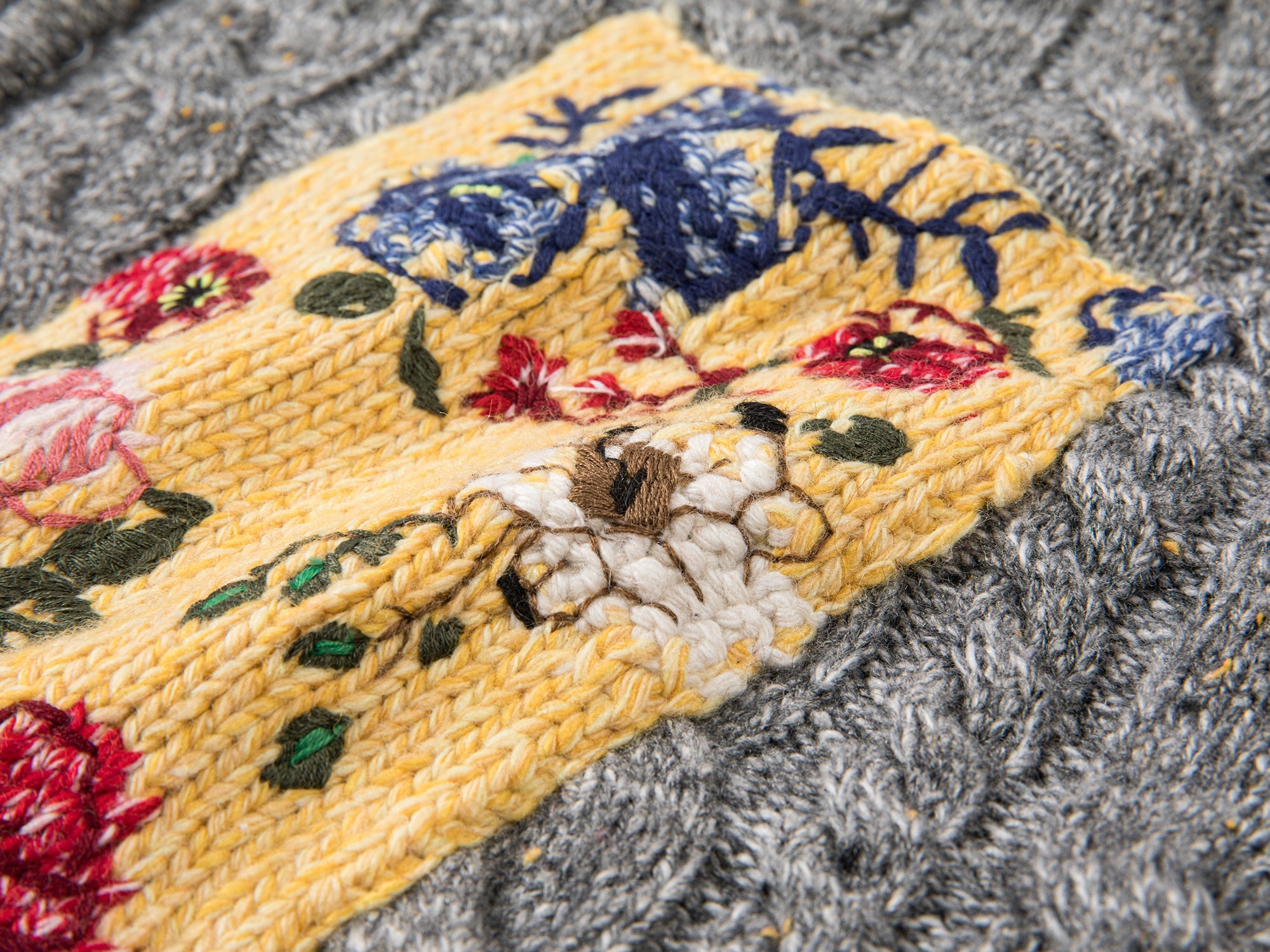 A cozy and comfortable wool-cotton blend with speckled yarn. The design features knitted inlays combined with intricate hand embroidery, adding a refined and delicate touch.