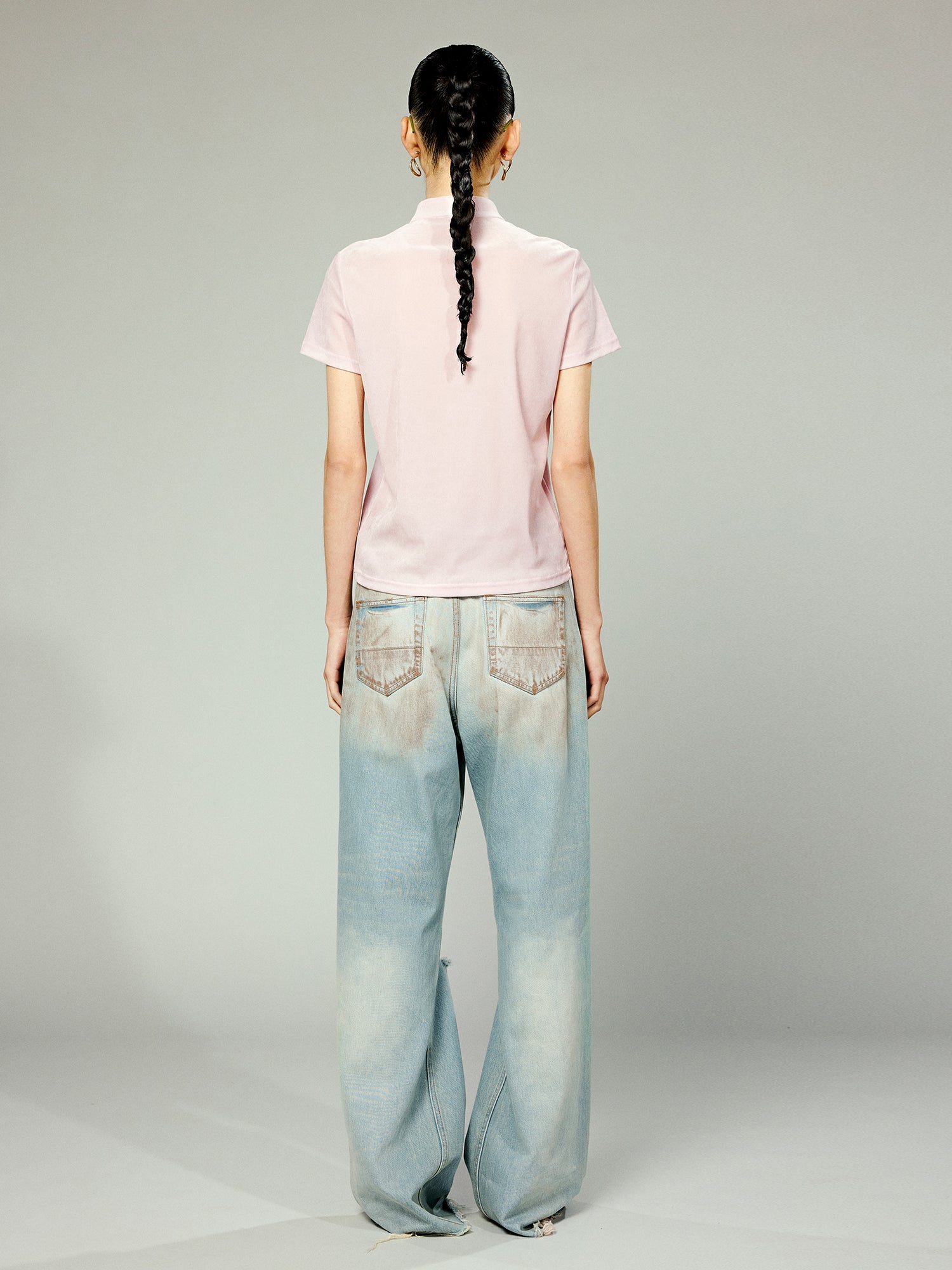 Fitted Chinese collar T-shirt featuring a cure graffiti panda motif with embroidered eyes, and a hand-embroidered logo.
