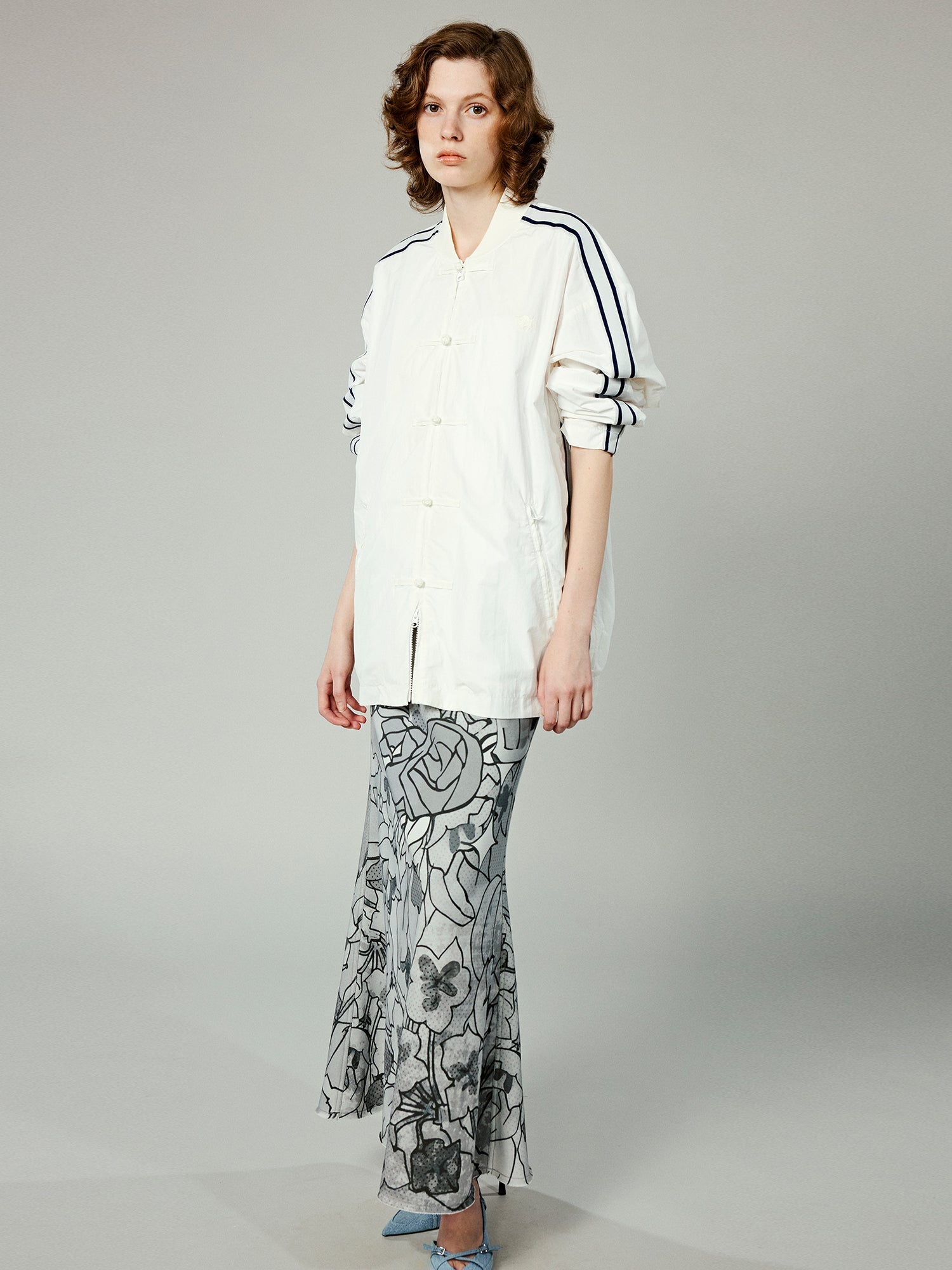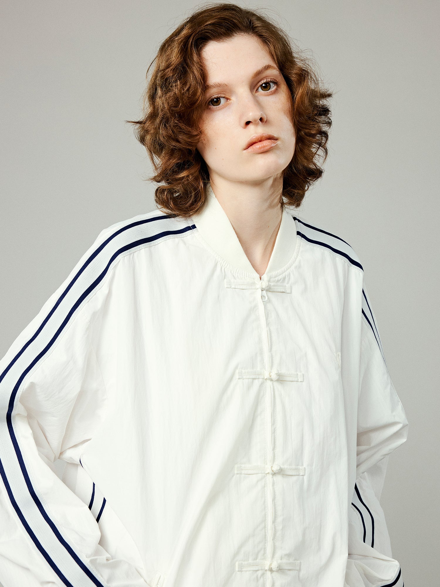 The button-up design is seamlessly integrated into a sports jacket, infusing a Modern Chinese-Style with a casual and relaxed vibe.