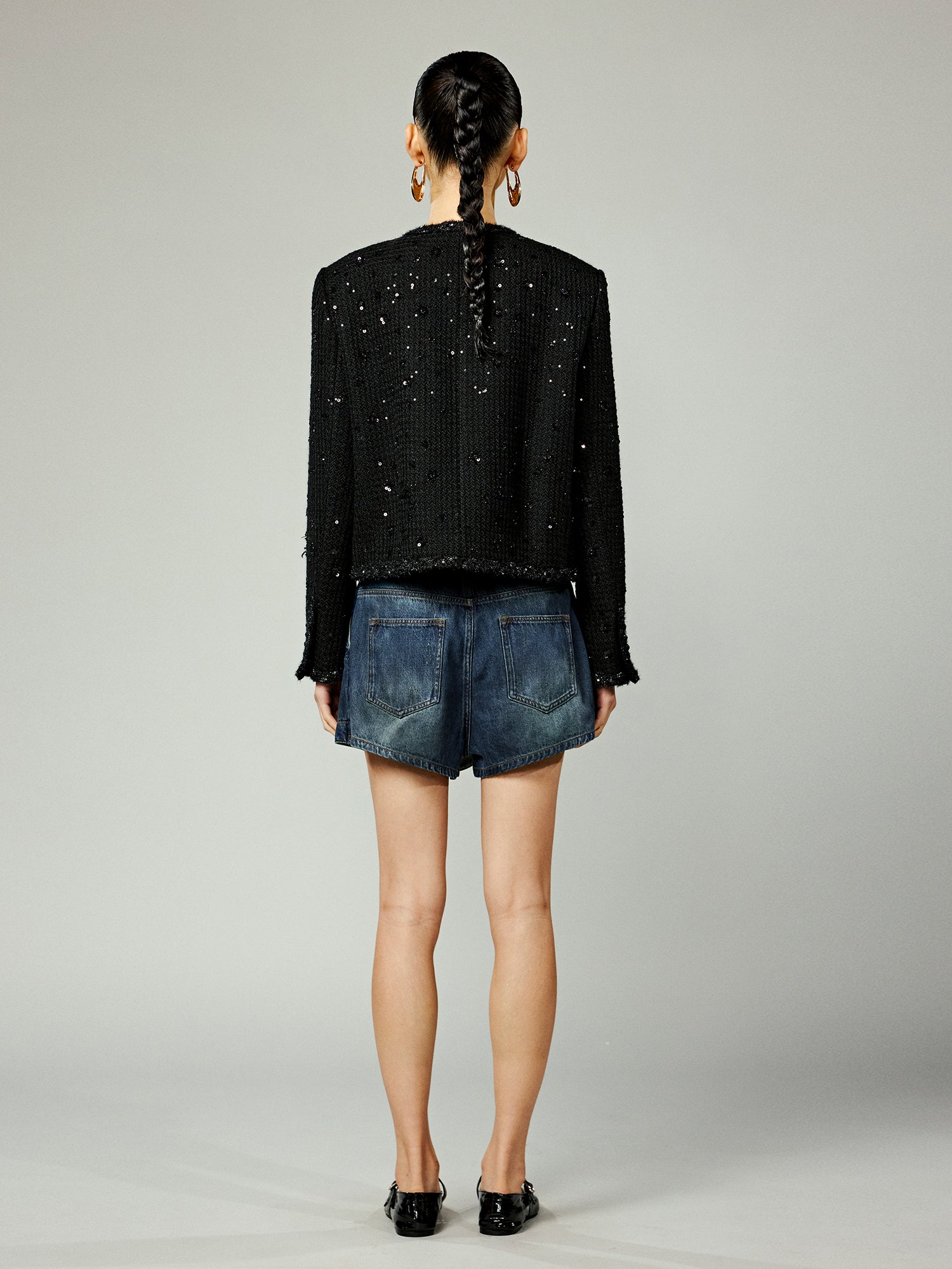 Hand-embellished sequins create intricate floral shapes, layered with distressed detailing to craft a glamorous yet youthful and free-spirited collarless jacket.