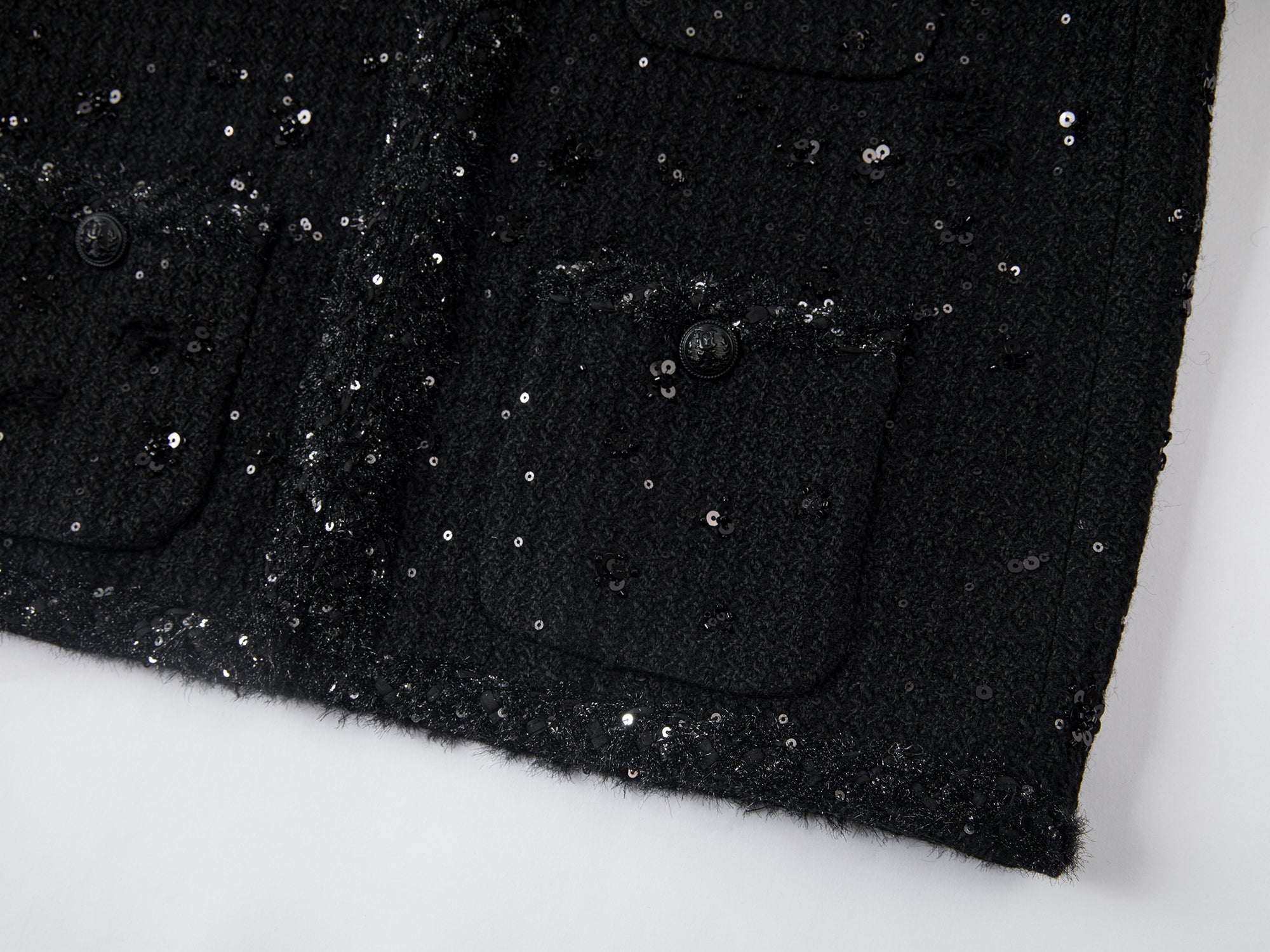 Tweed fabric with hand-embellished sequins, featuring a delicate and even weave for a rich and glamorous visual effect.