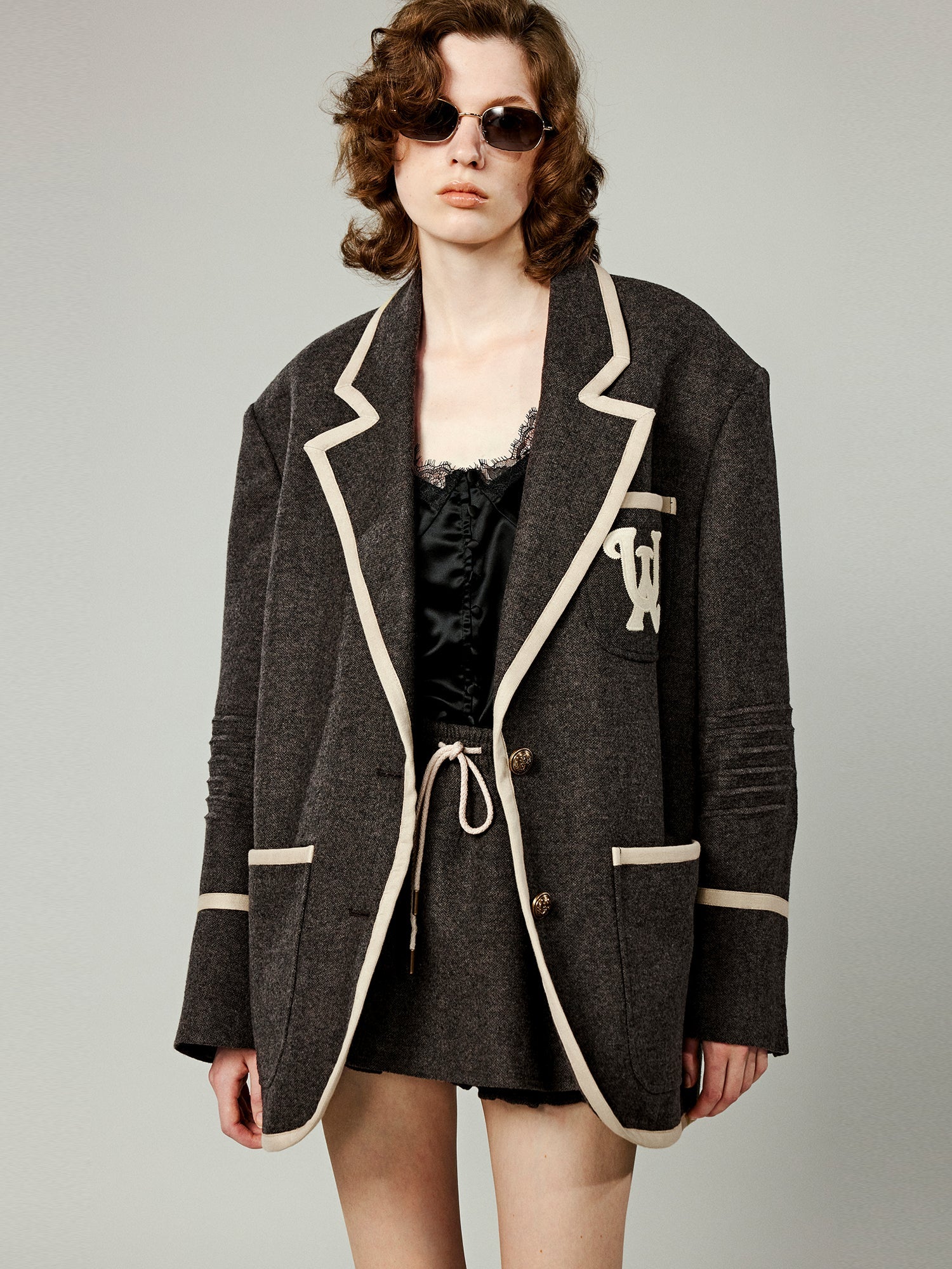 Inspired by classic 90s collegiate blazers, this design features contrast trim and an embroidered badge on the chest pocket, blending vintage charm with vibrant energy.