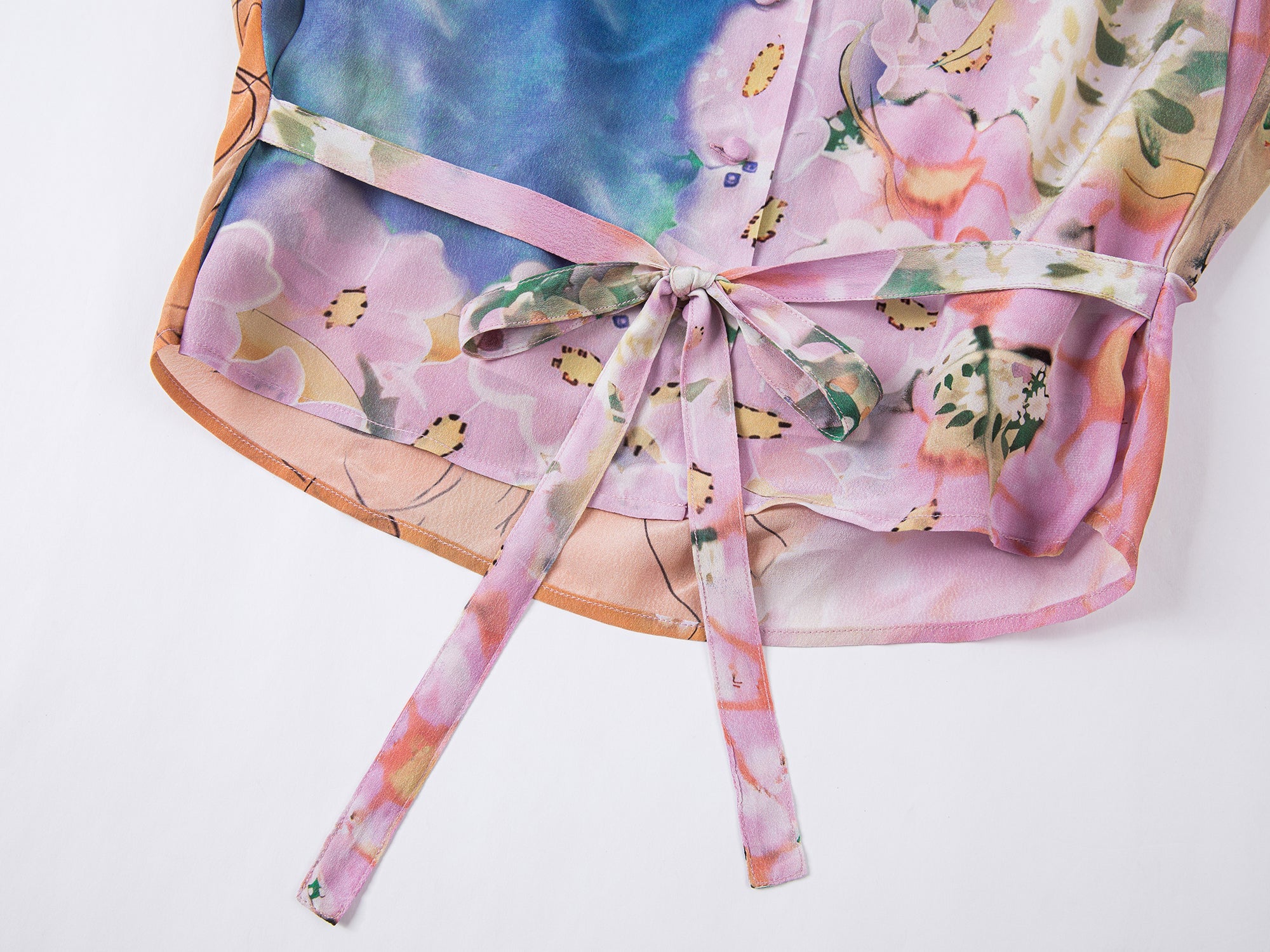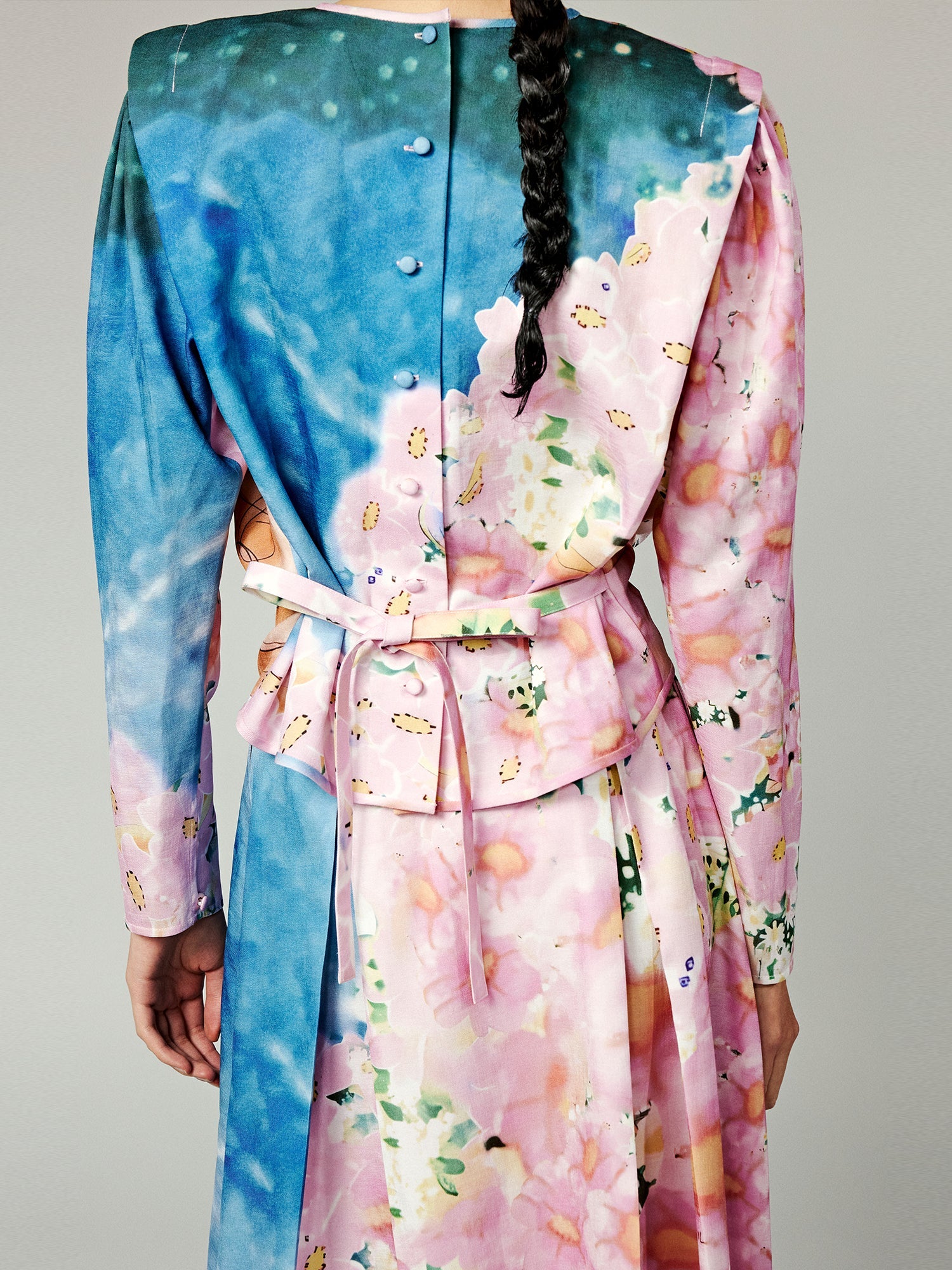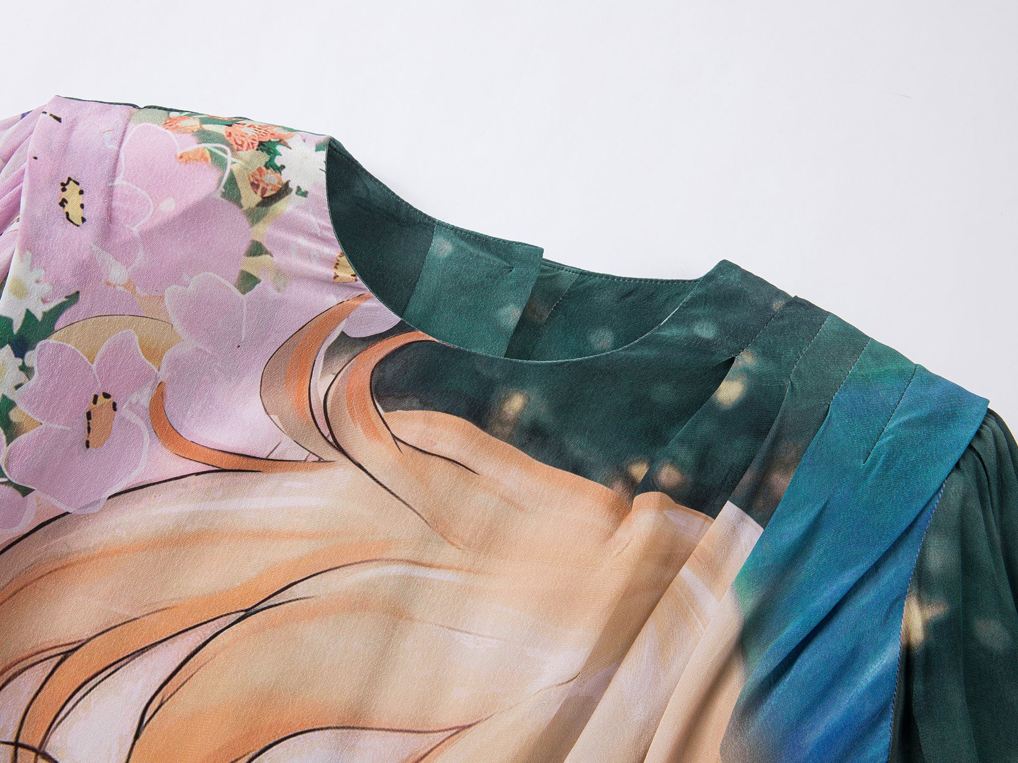Rayon chiffon fabric, lightweight, soft, with excellent drape. Detailed pleating at the shoulders enhances its three-dimensional shape.