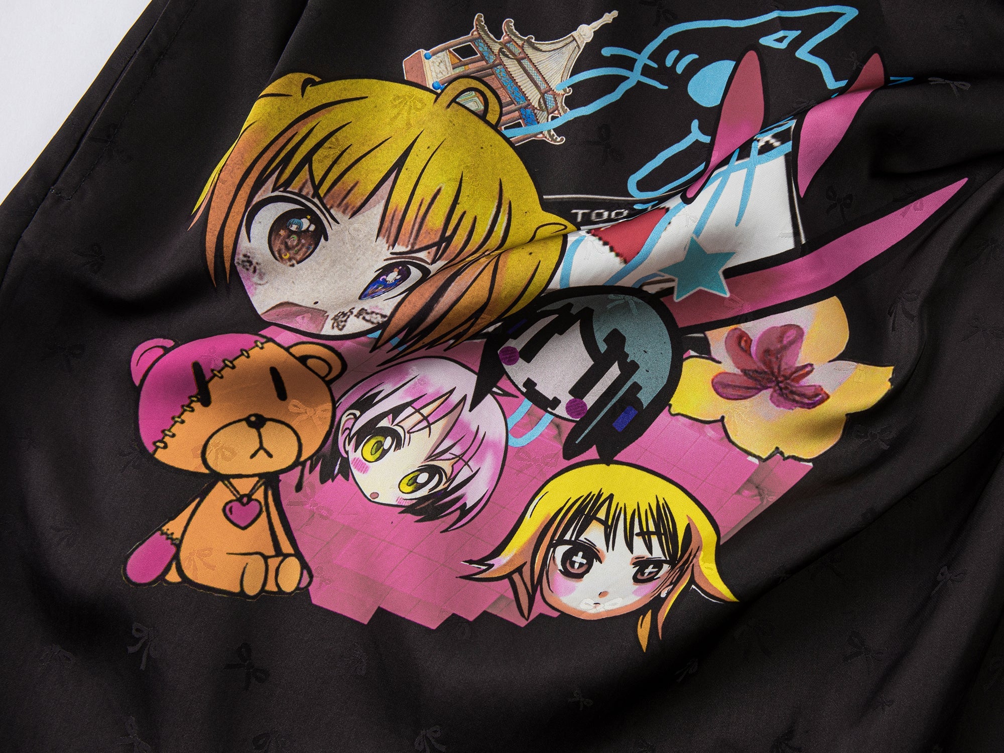 Wrap style dress combining comic girl patterns with playful bow embellishments on satin fabric, offering an elegant yet youthful charm.