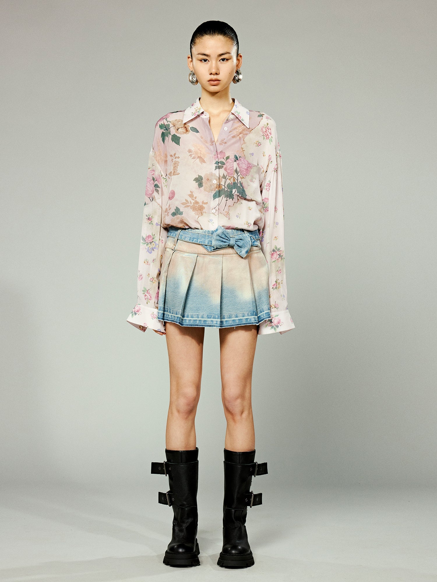 The gradient-washed denim fabric gives a vintage and structured look. The skirt features precisely pressed pleats, a gradient wash throughout, and a frayed hem. The adjustable bow waistband adds a playful touch, and the built-in safety shorts provide extra comfort and coverage.