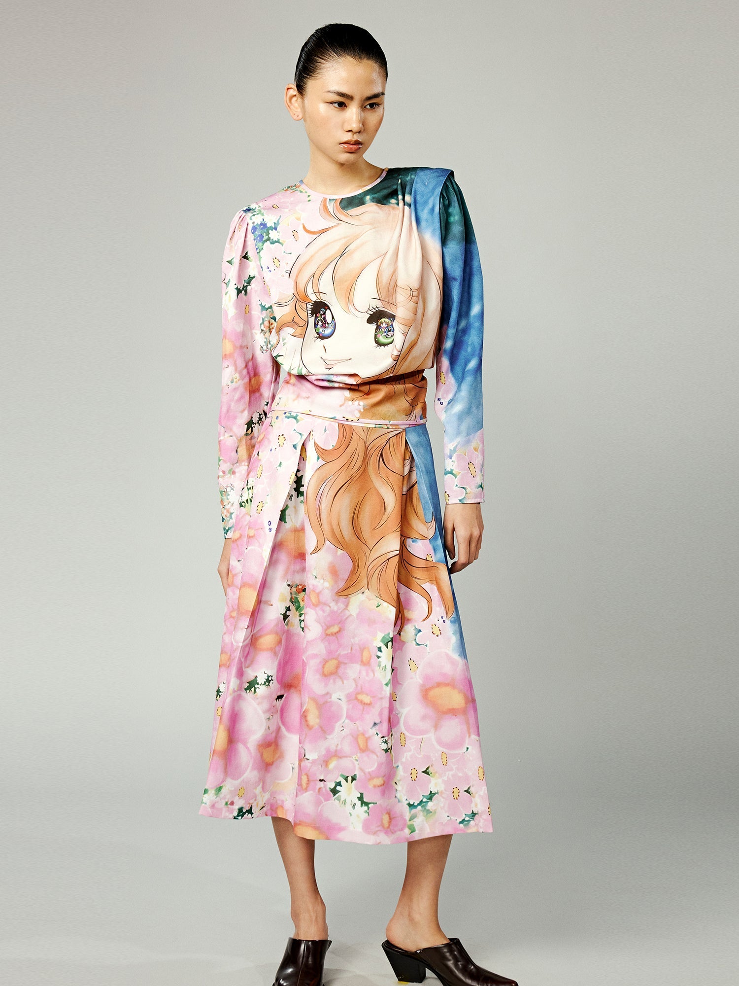 This A-line circle skirt combines dreamy colors with comic girl motifs and romantic flowers, creating a stylish clash of styles.