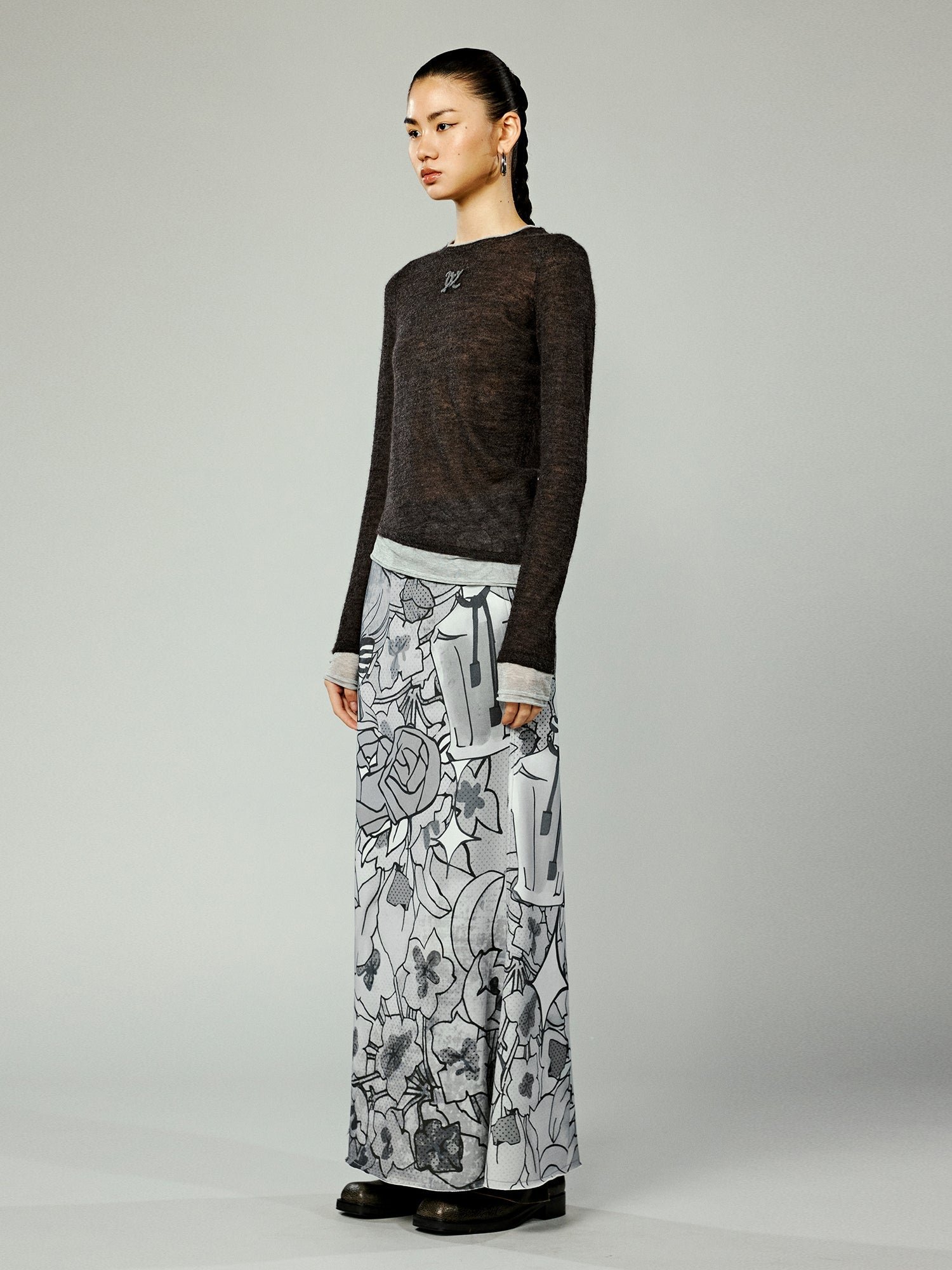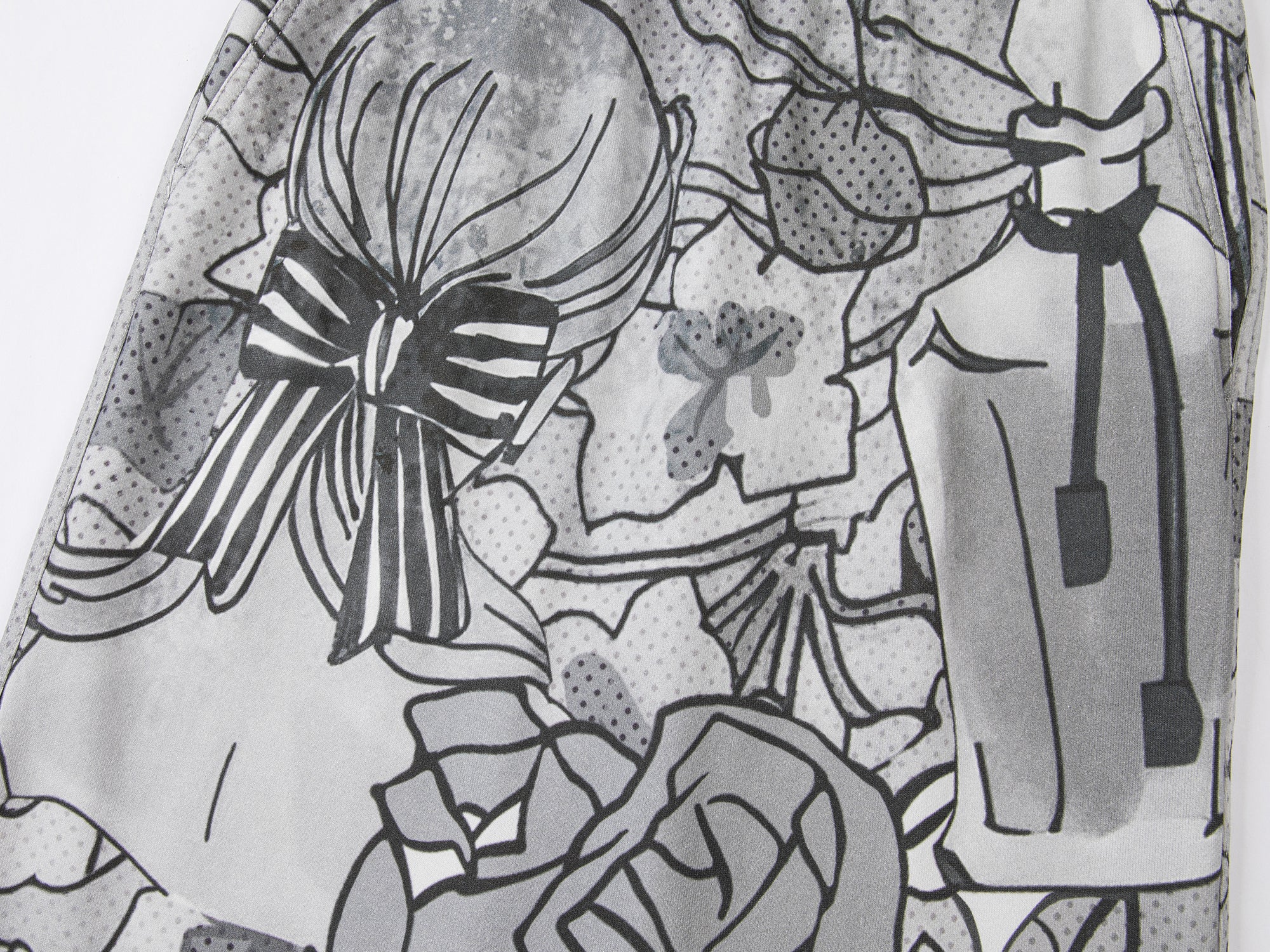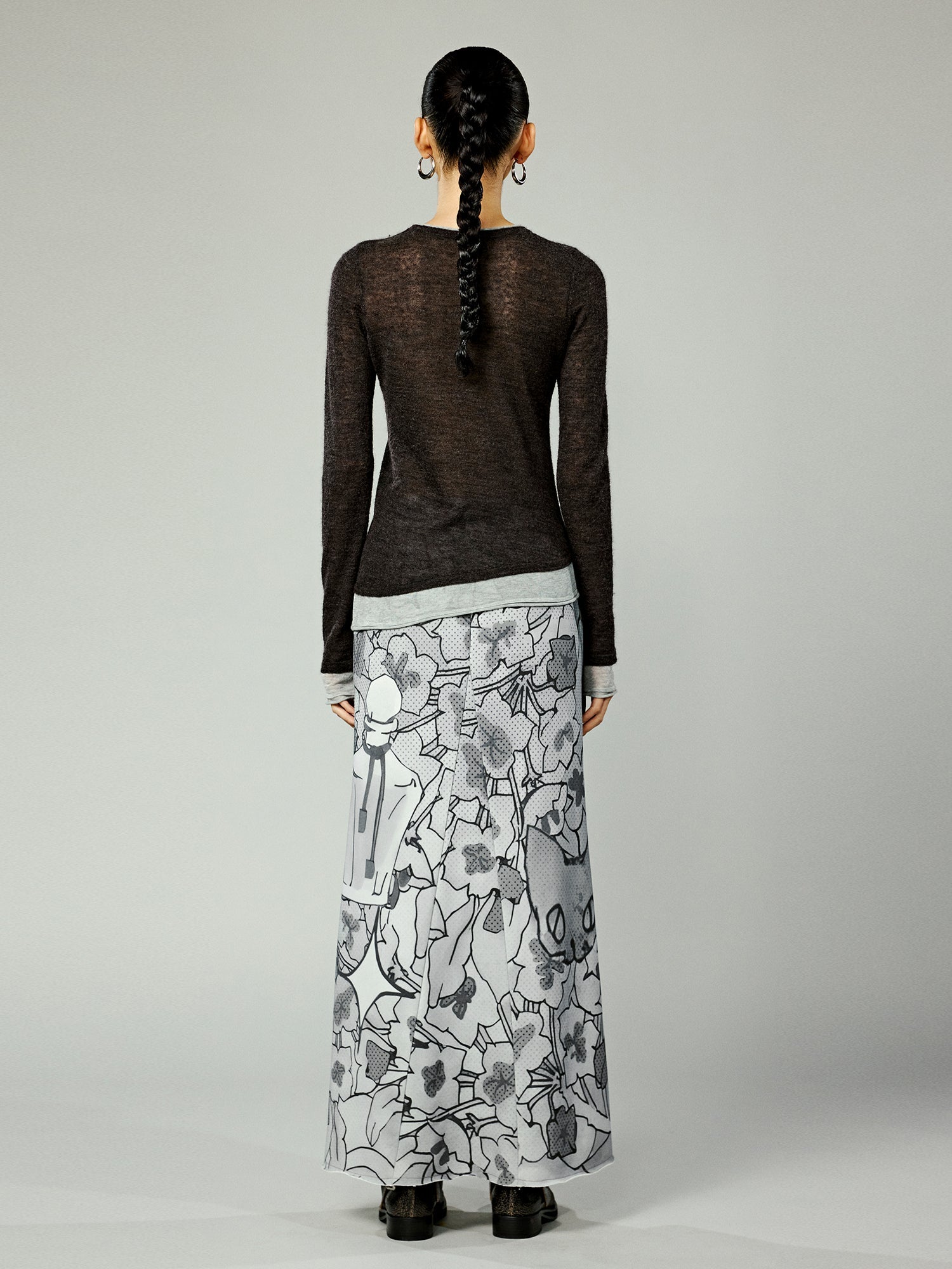 A charming midi skirt adorned with a playful comic girl print and featuring a whimsical mermaid hem.