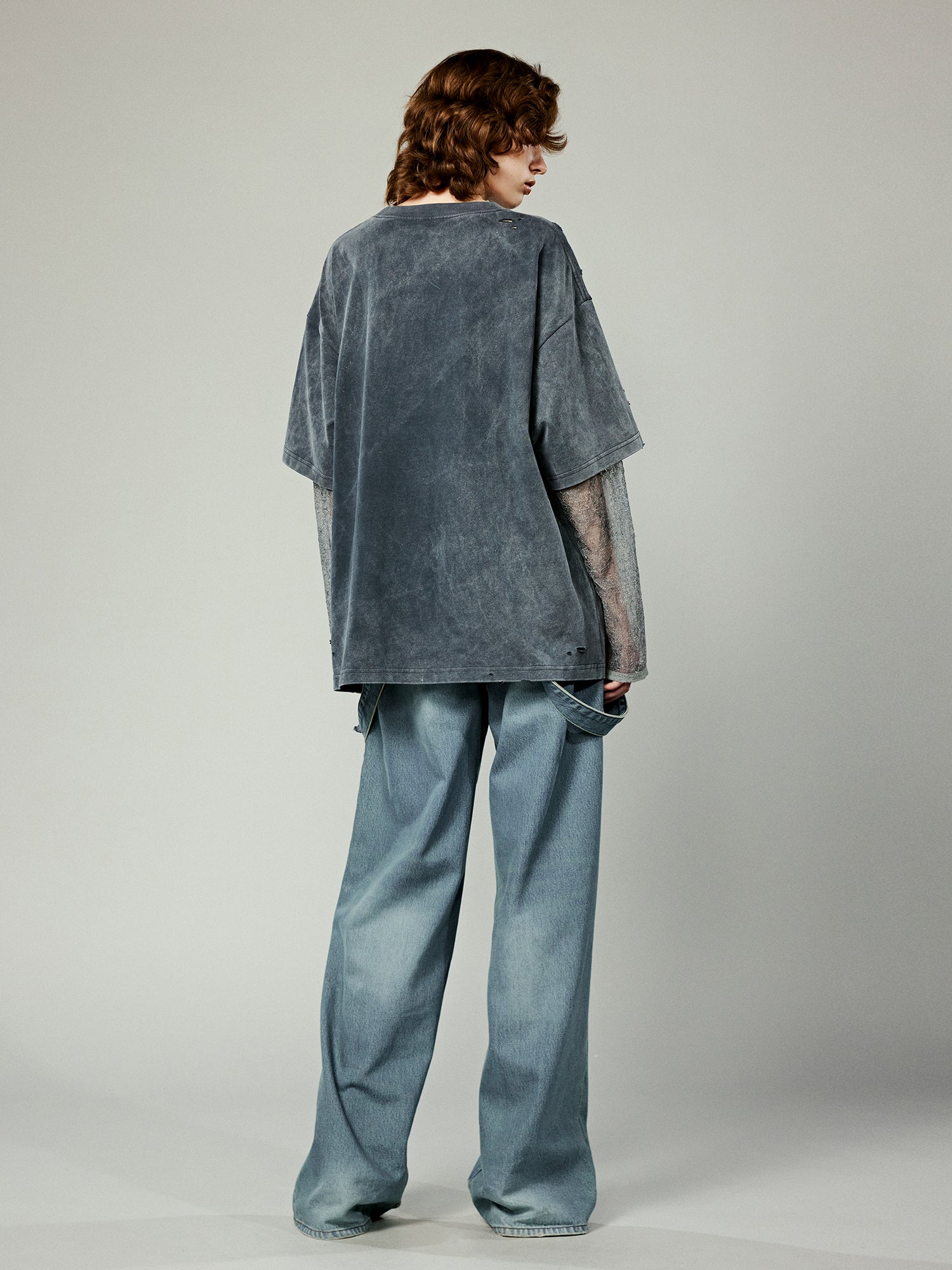 Distressed washed print combined with handcrafted three-dimensional lace flower appliqués, creating a detailed and refined look.