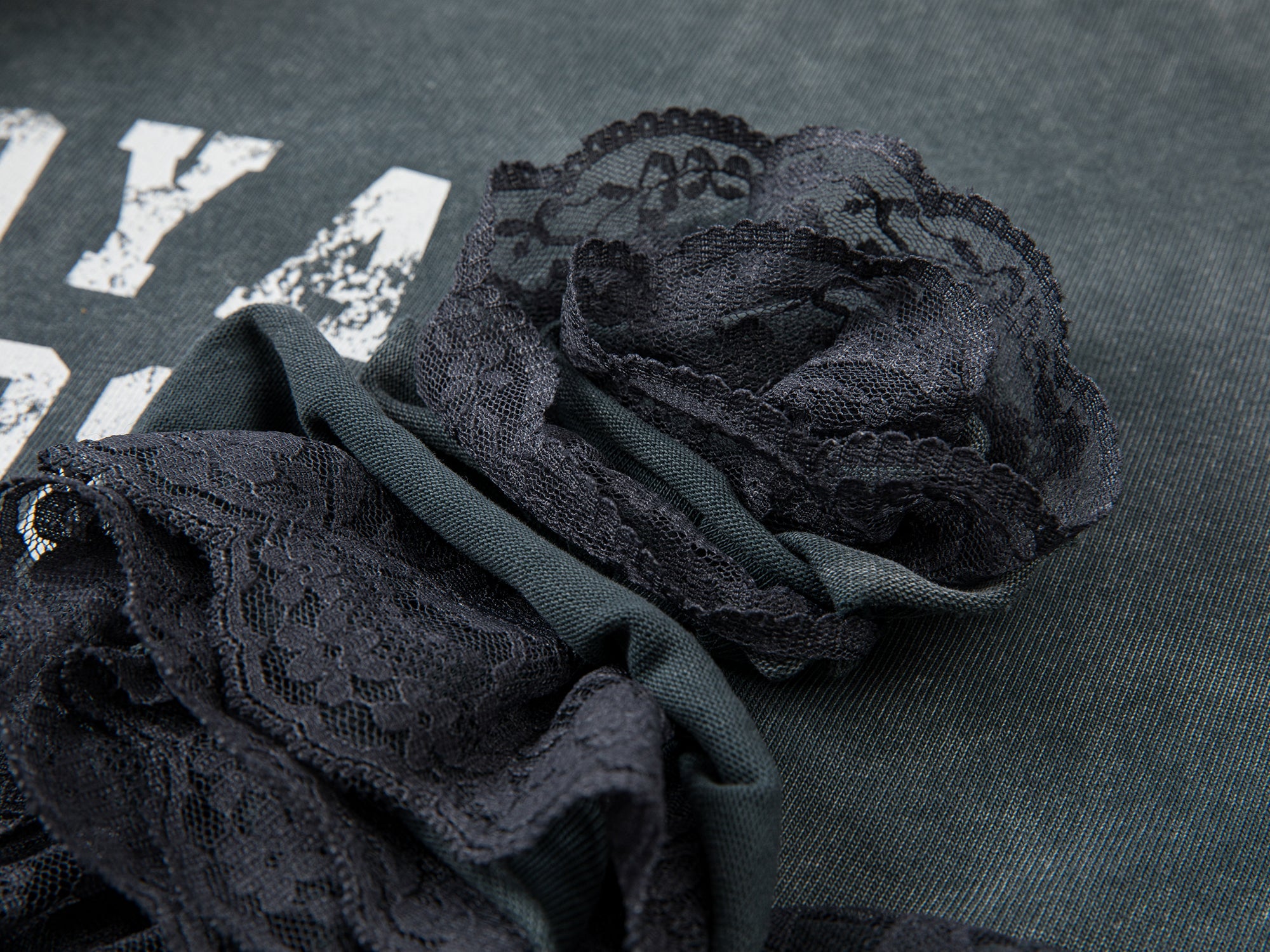Varsity T-shirt with a distressed finish, featuring romantic lace flower appliqués for a look that's both retro and effortlessly cool.