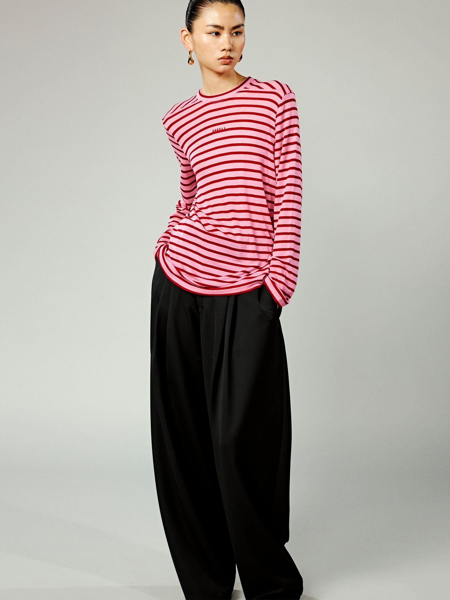 Relaxed wide-leg trousers crafted from fine wool fabric with double pleats, featuring smooth lines for an effortlessly casual style.