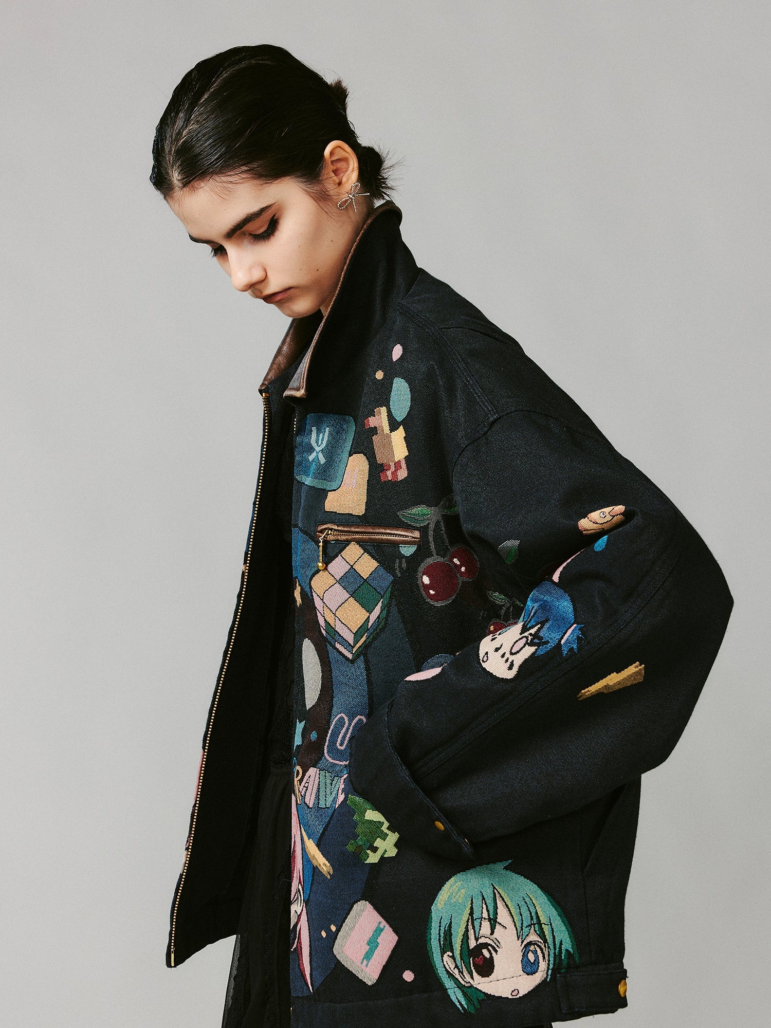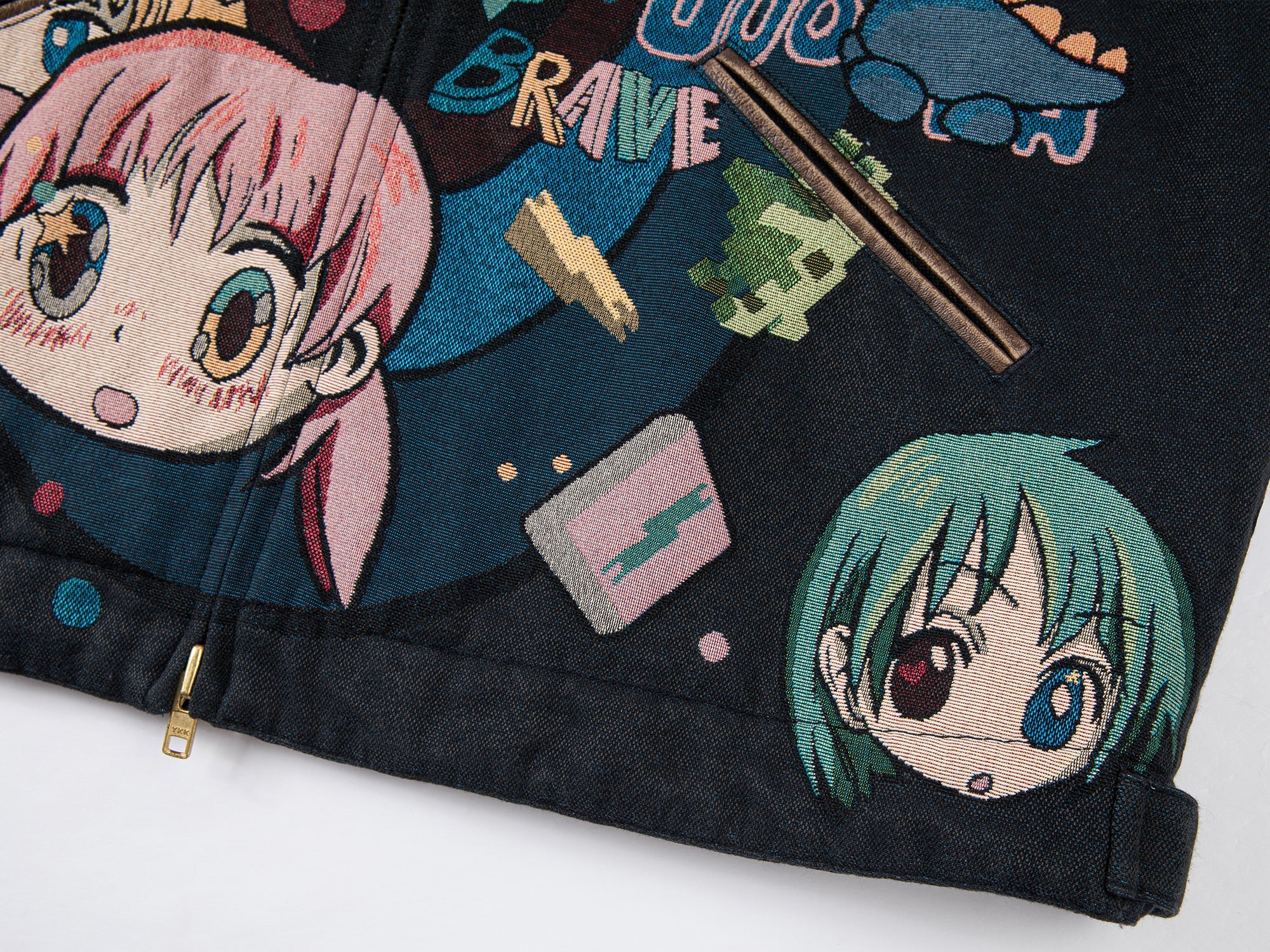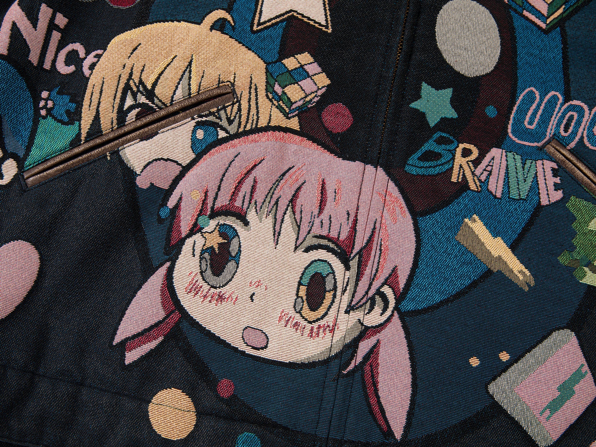 A workwear jacket crafted from tapestry fabric, featuring colorful anime girl motifs.