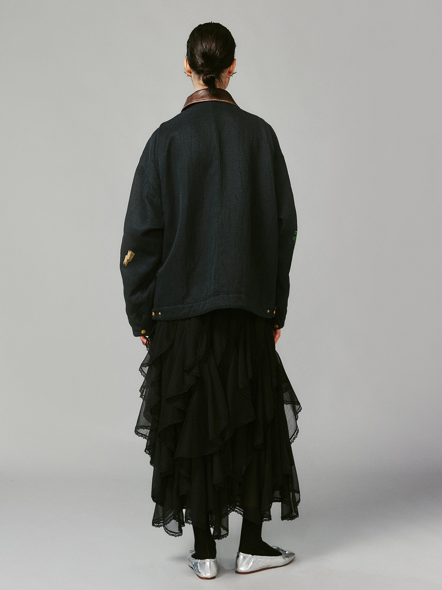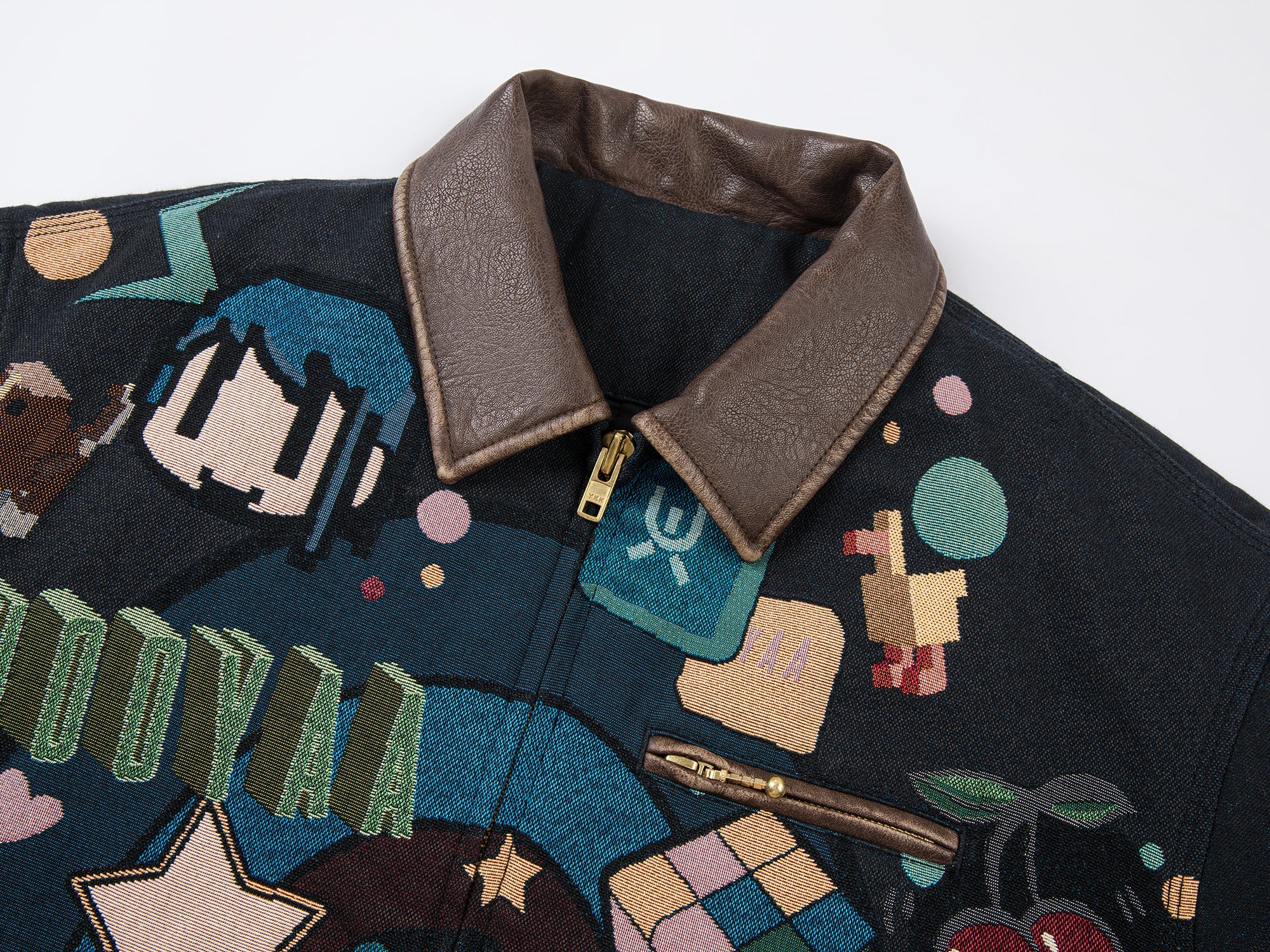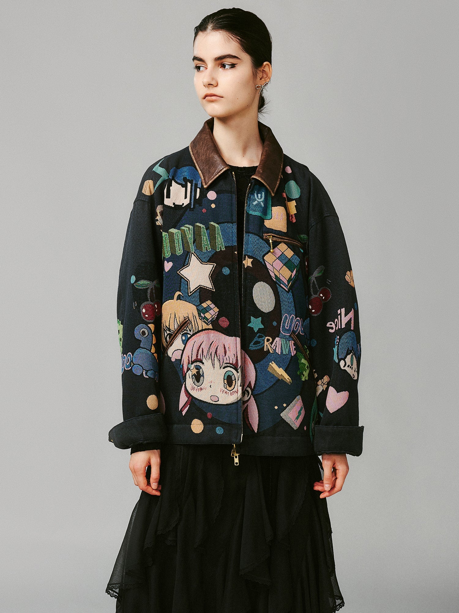 A workwear jacket crafted from tapestry fabric, featuring colorful anime girl motifs.
