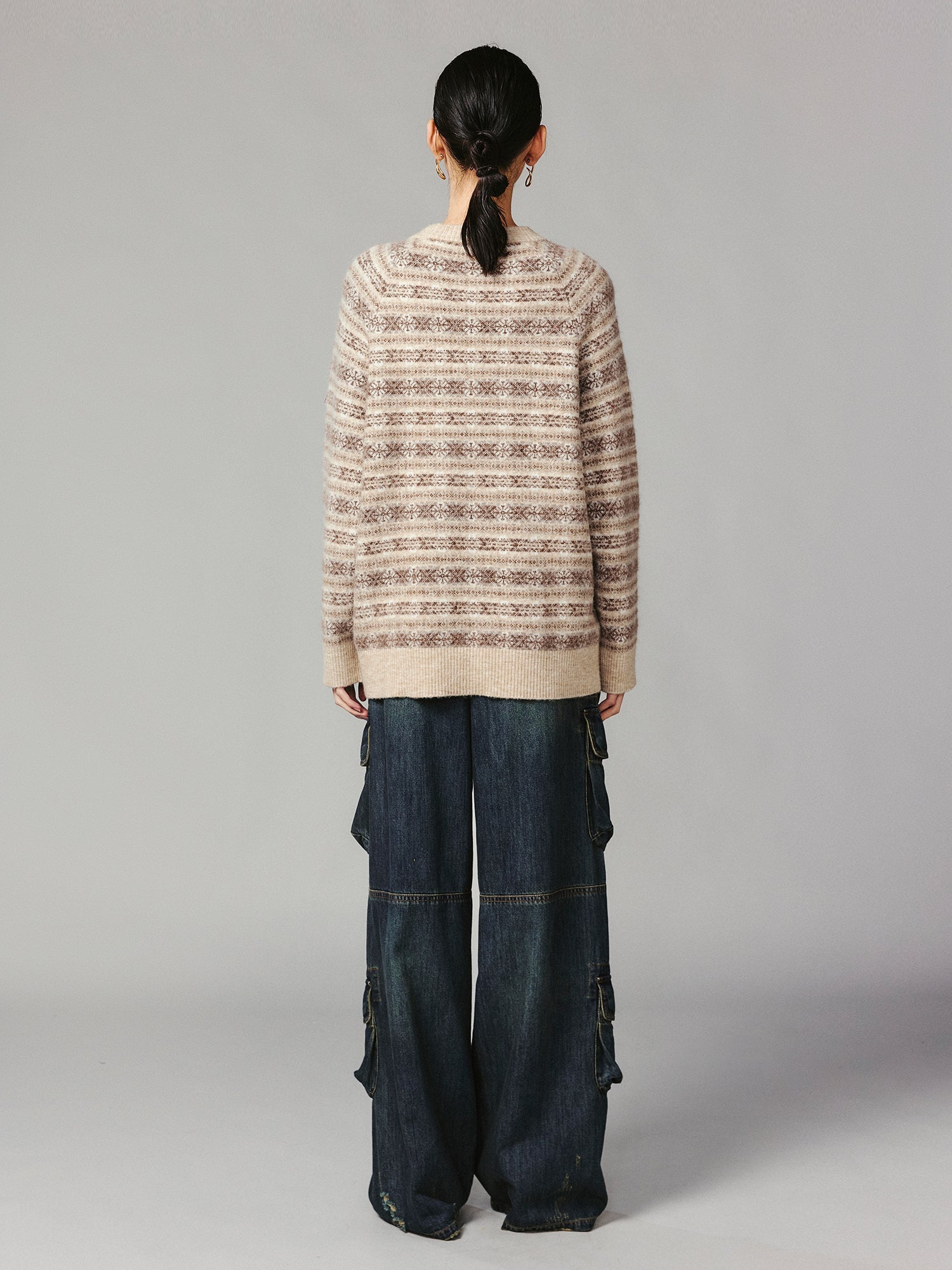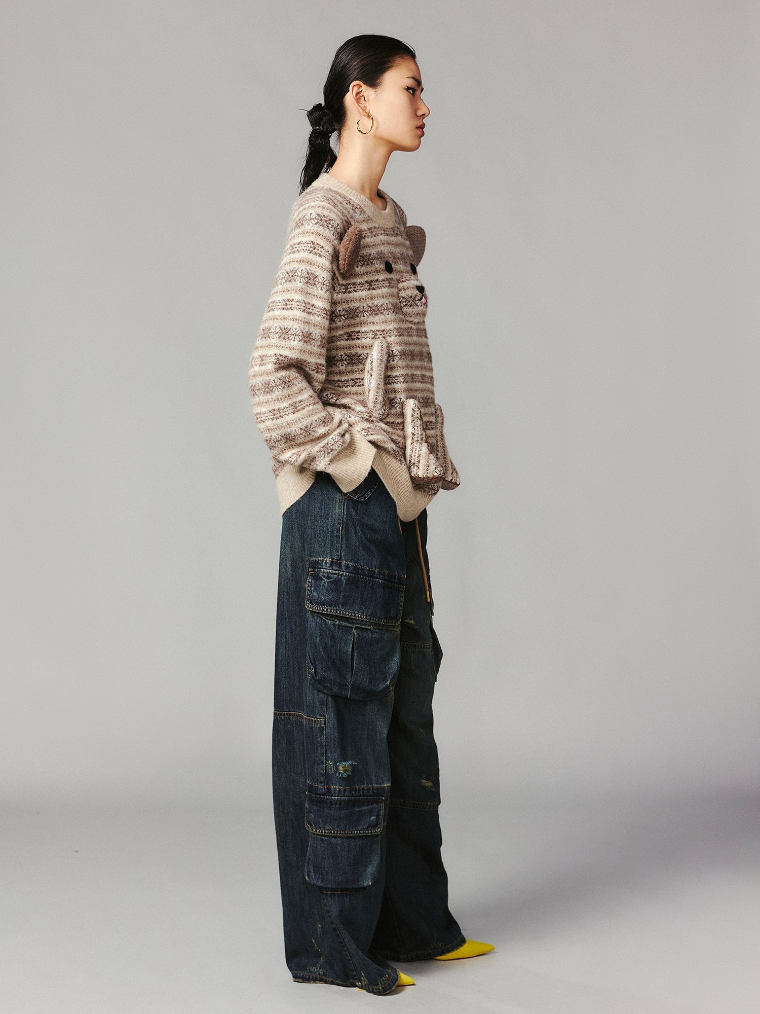 A Fairisle pullover sweater that captures a wintery atmosphere, featuring a cute 3D teddy bear that conveys warmth and joyful emotions.