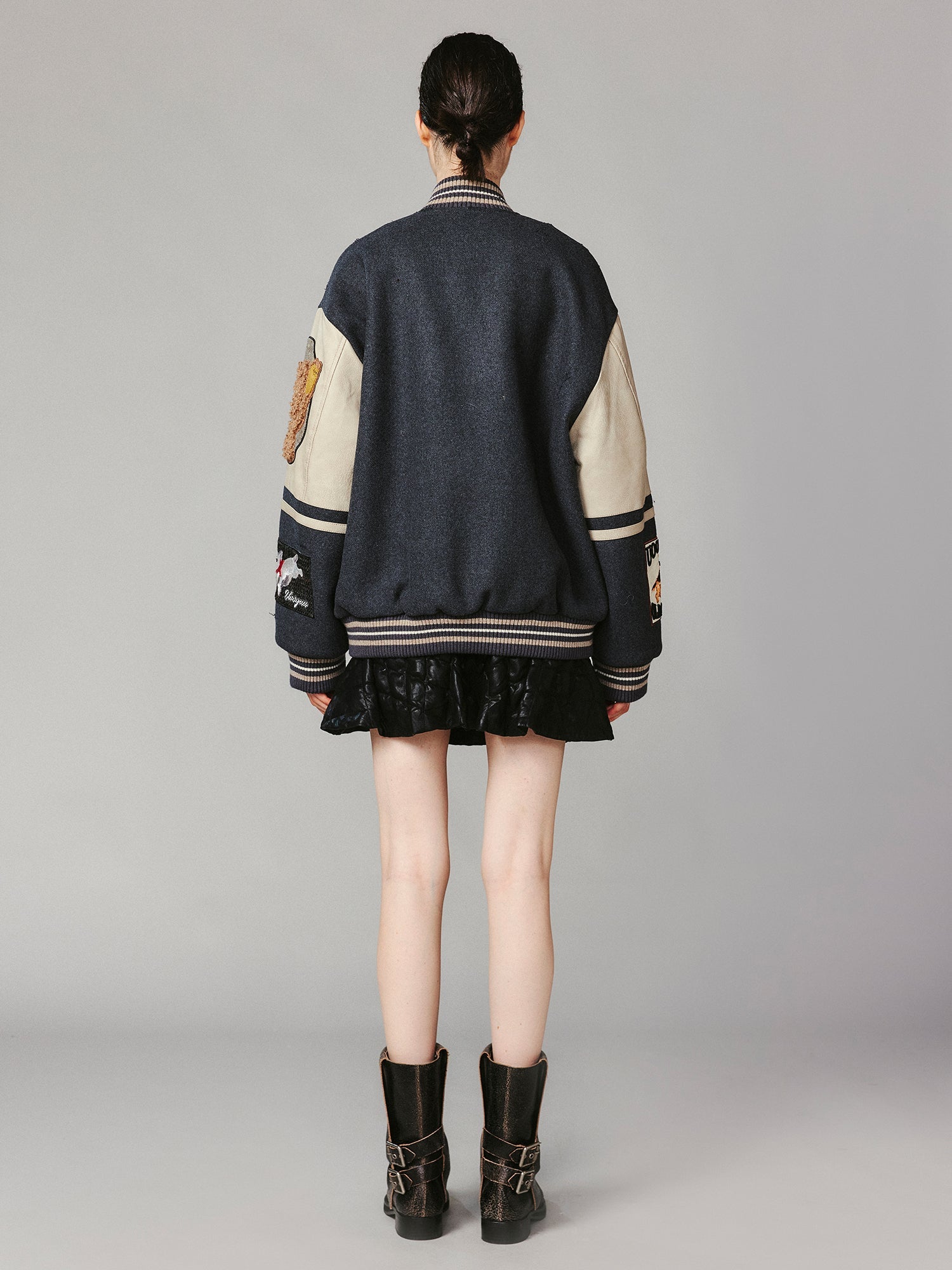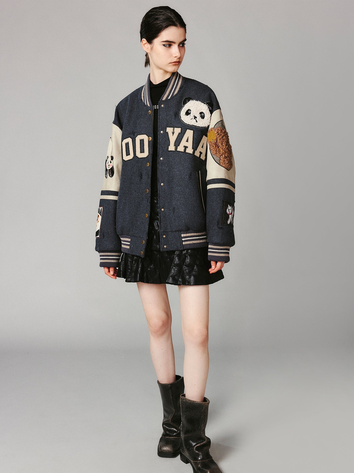 Remaking playful bears, pandas, and cute pets on a classic baseball jacket using 3D patches and embroidery, resulting in a vintage yet playful design.
