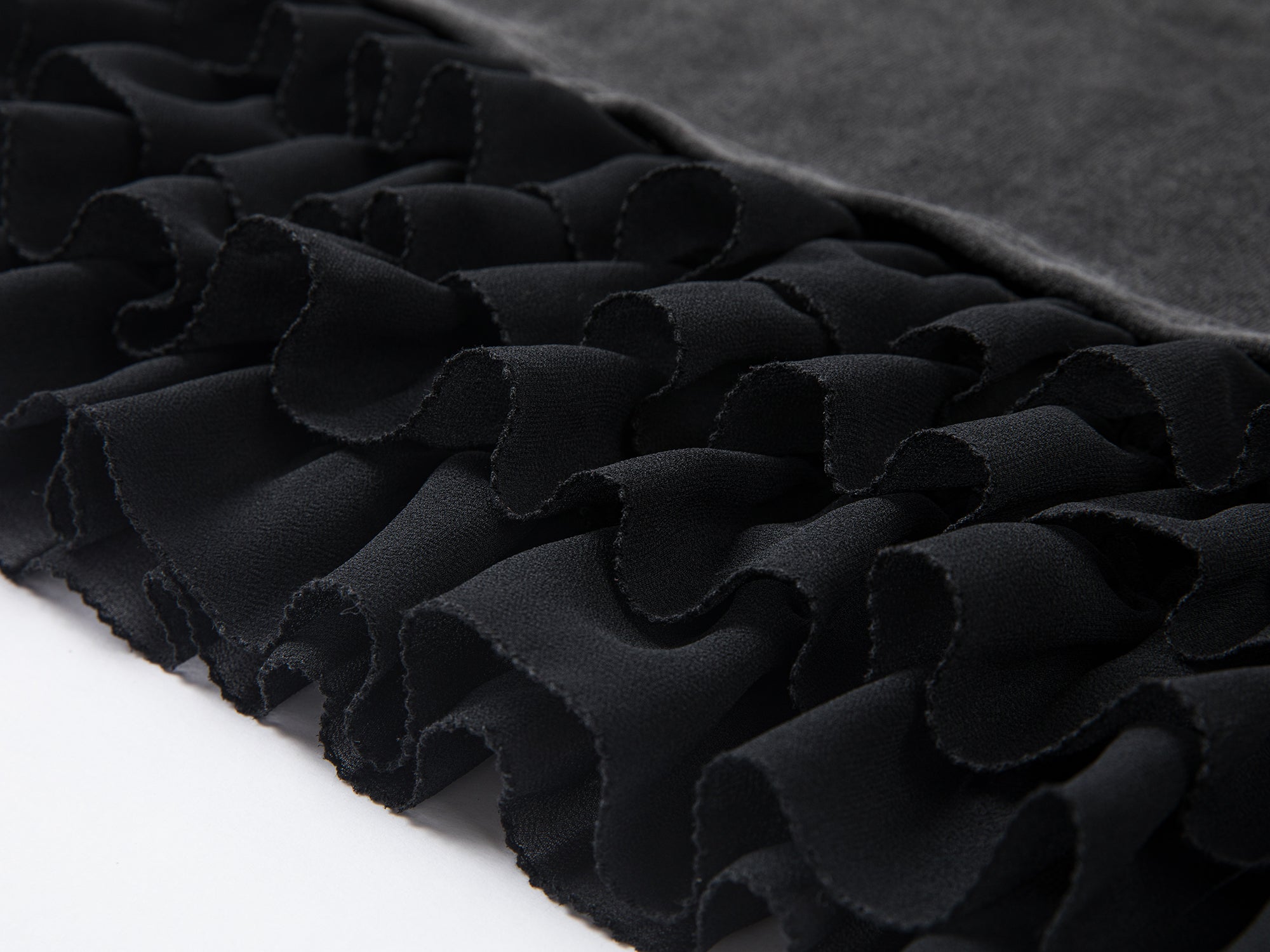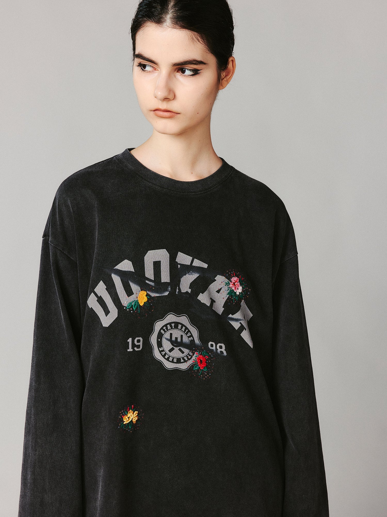 A vintage-washed collegiate cracked print long-sleeve T-shirt paired with a tiered cake skirt, featuring blossoming embroidered beaded flowers. The design combines retro elegance with youthful fun.