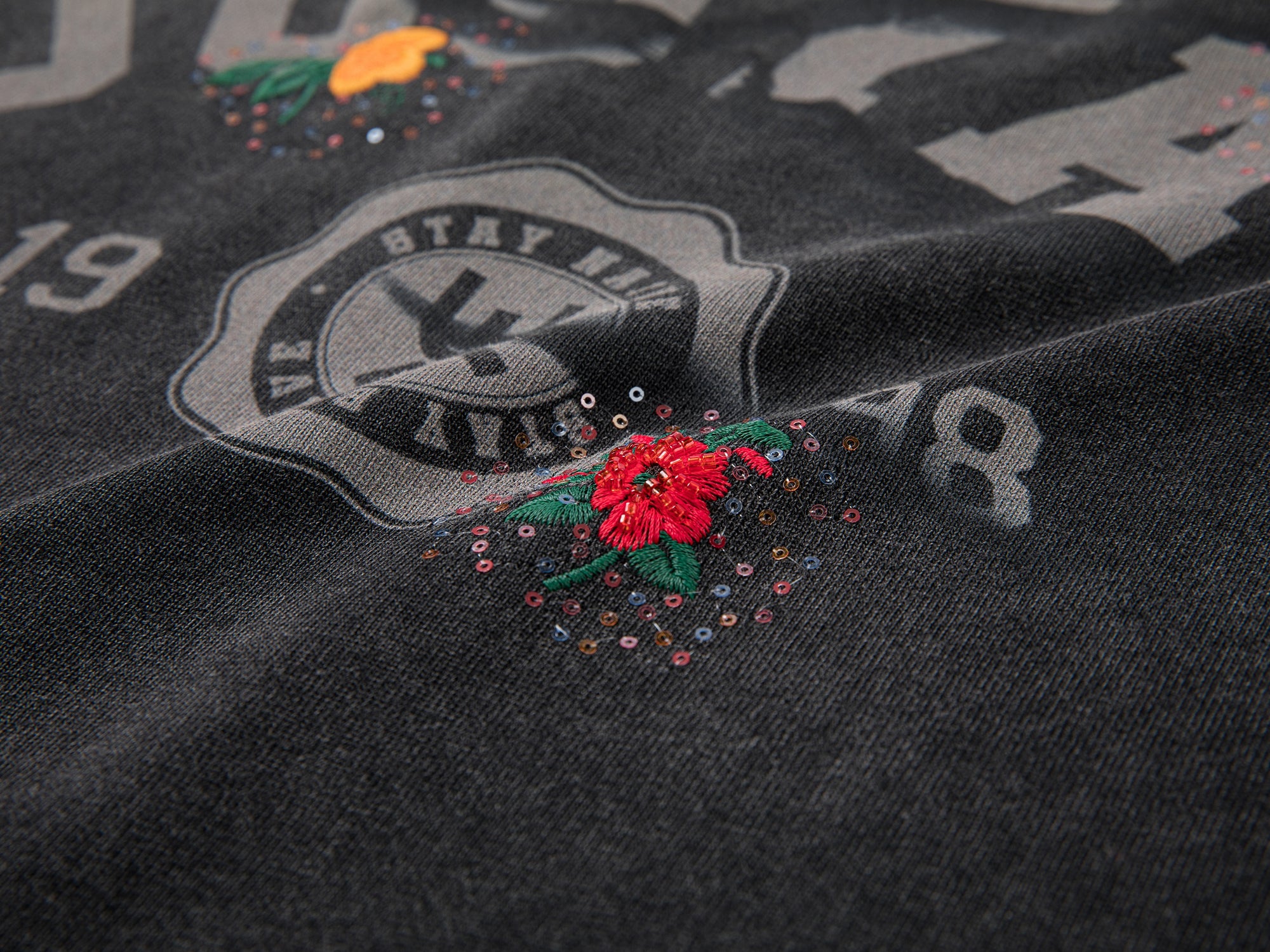 Wax-dyed terry fabric with clear textures, offering a relaxed and free-spirited feel. The white ink digital print is layered with multicolored embroidered flowers, creating a playful and dynamic look with exquisite and intricate details.