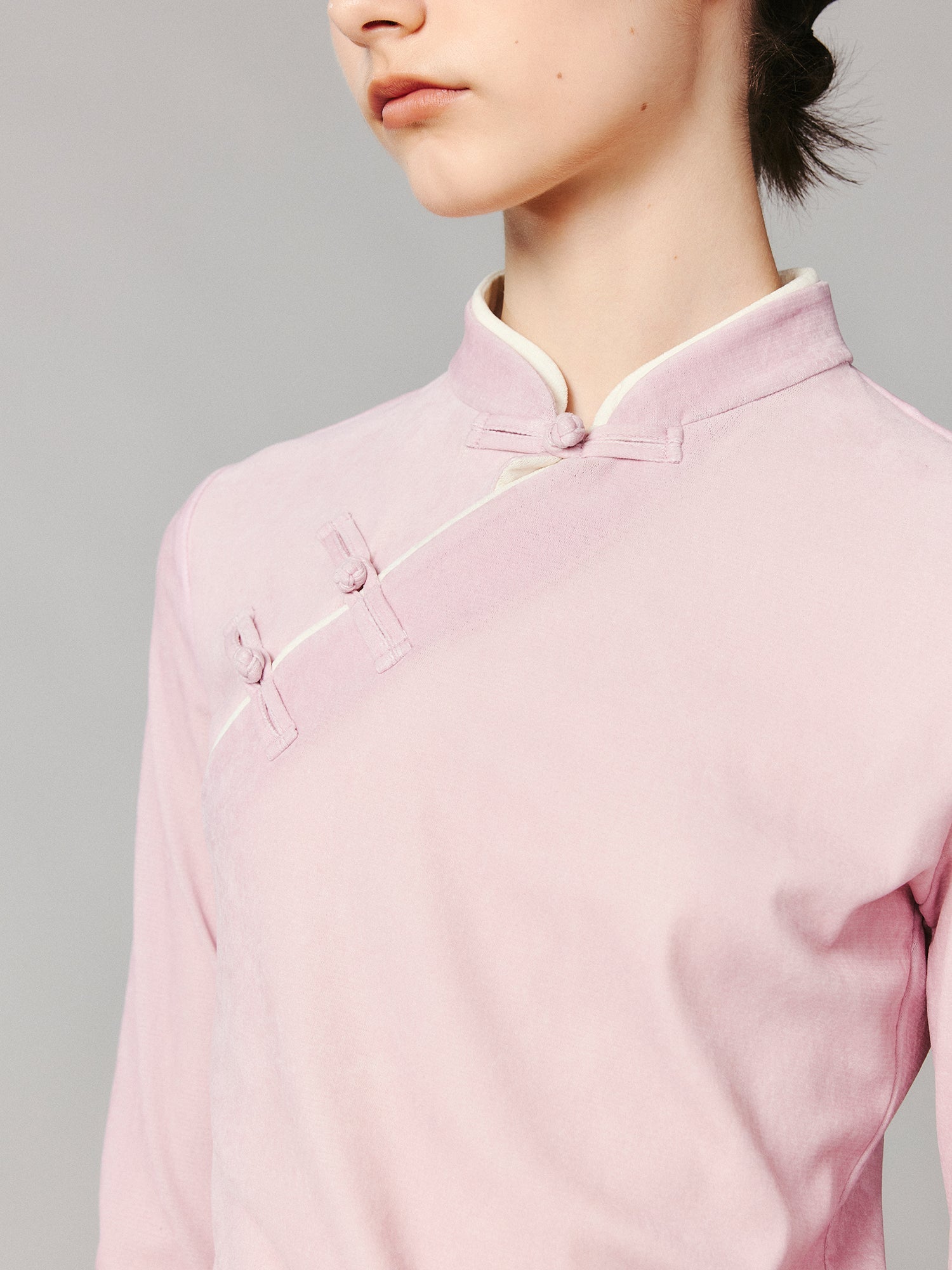 A youthful pink mandarin-collar top with an asymmetrical placket and frog buttons, featuring an angled hem and contrasting faux layered design for an easygoing, playful, and versatile look.