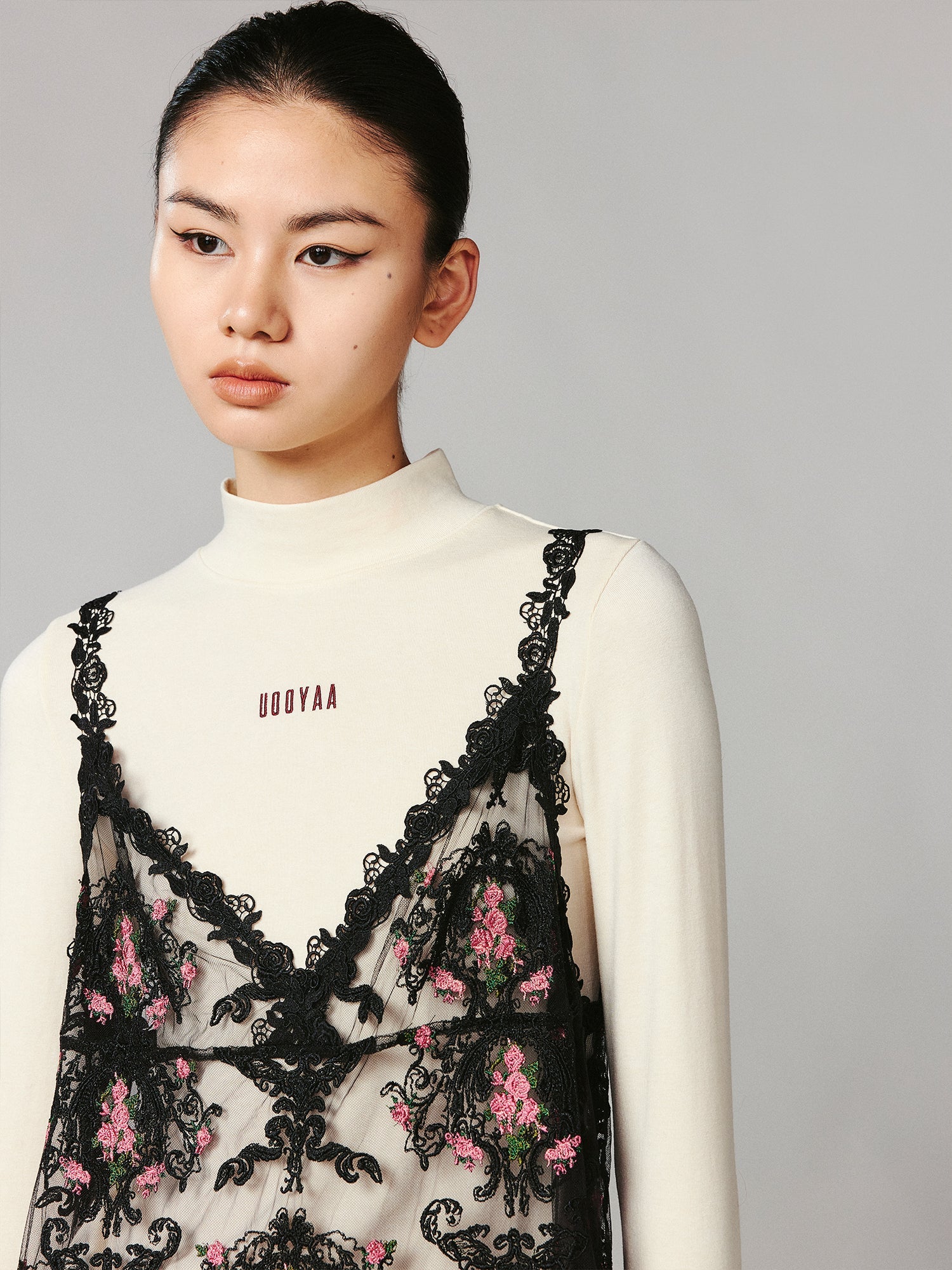 An A-line lace mesh camisole dress adorned with intricate wallpaper floral embroidery all over, romantic and playful, relaxed and versatile.