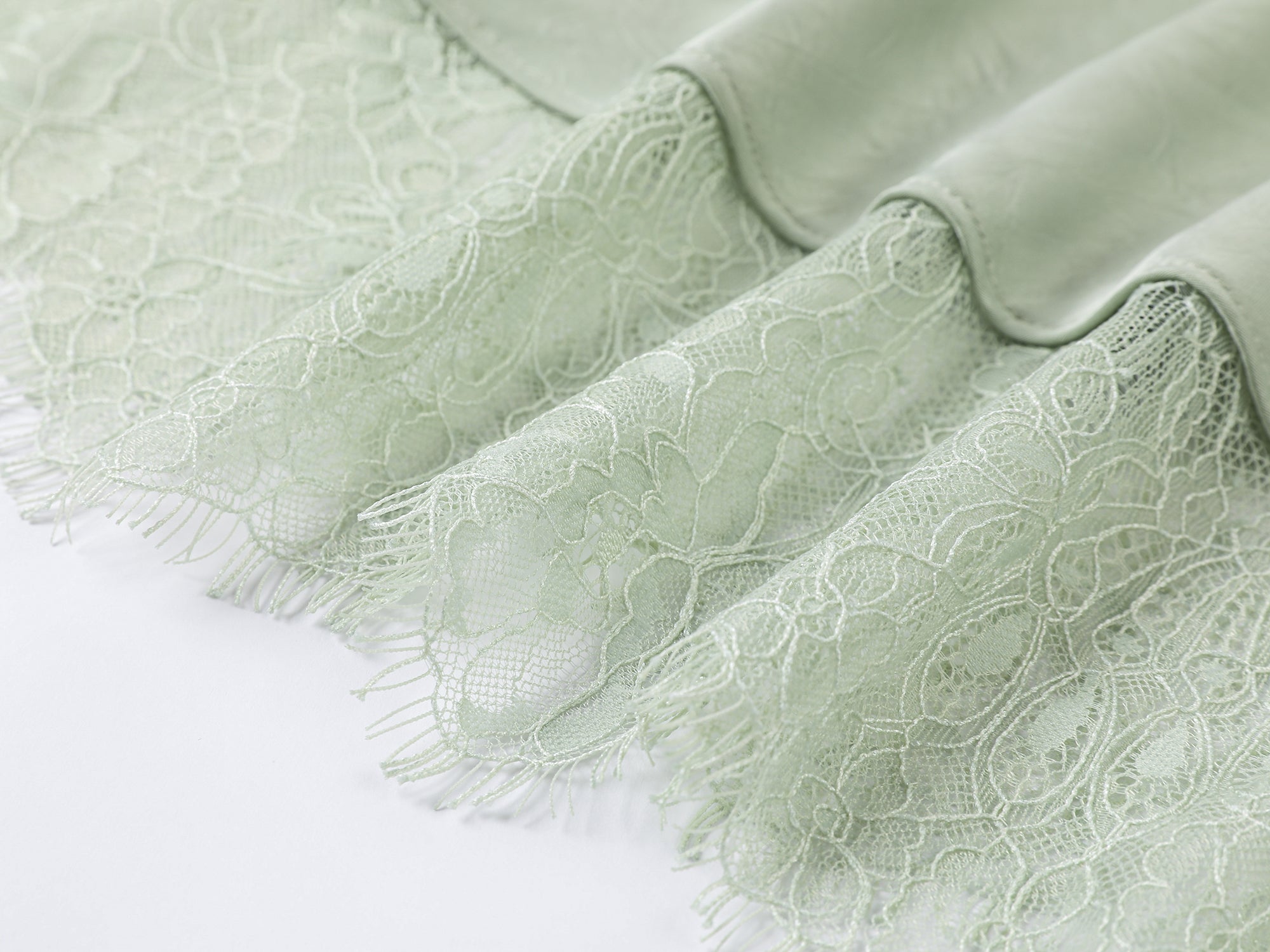 Satin fabric with a lustrous finish, offering a smooth and comfortable feel, featuring irregular pleating combined with lace panels for a free-spirited and effortless look.