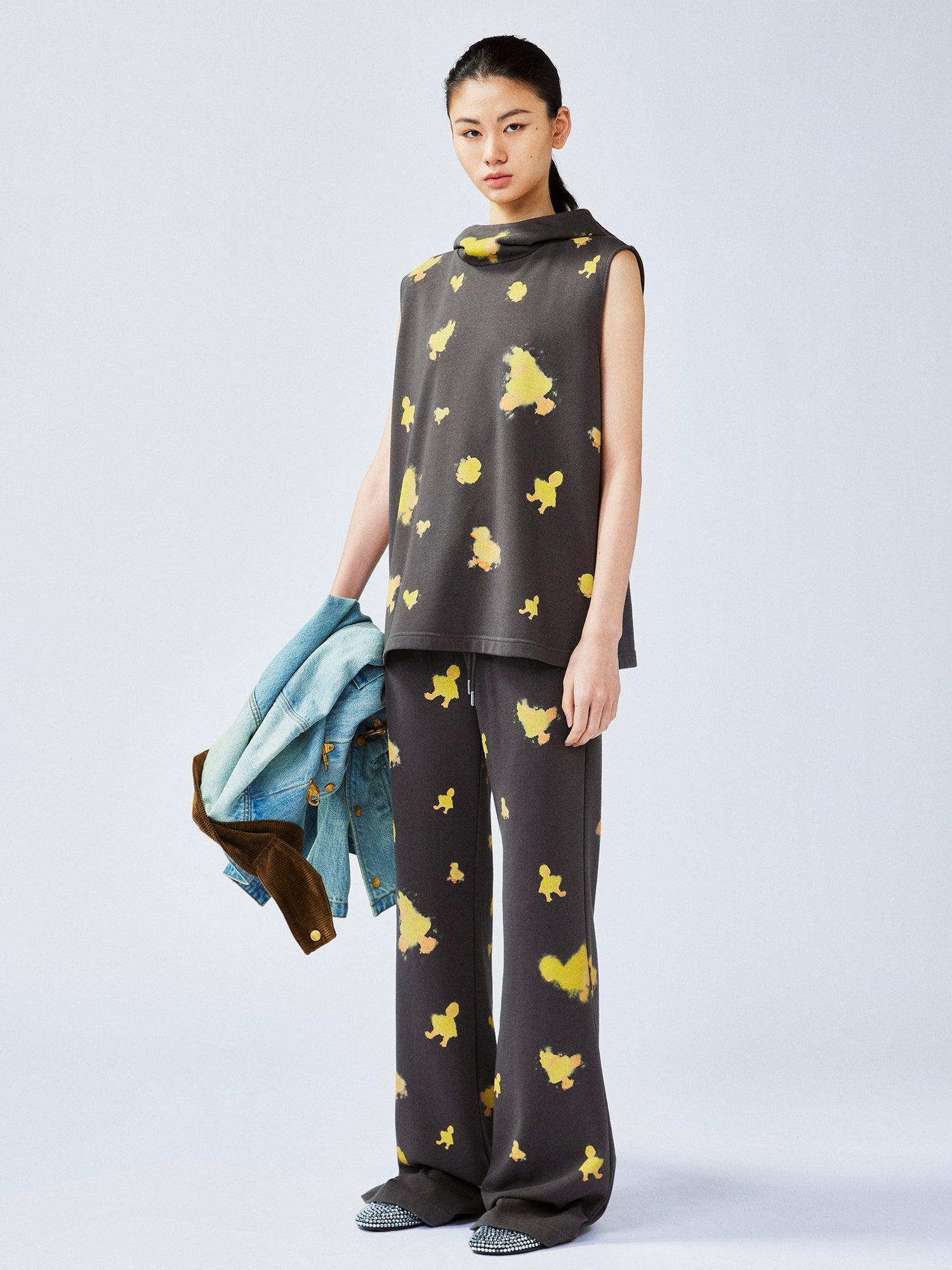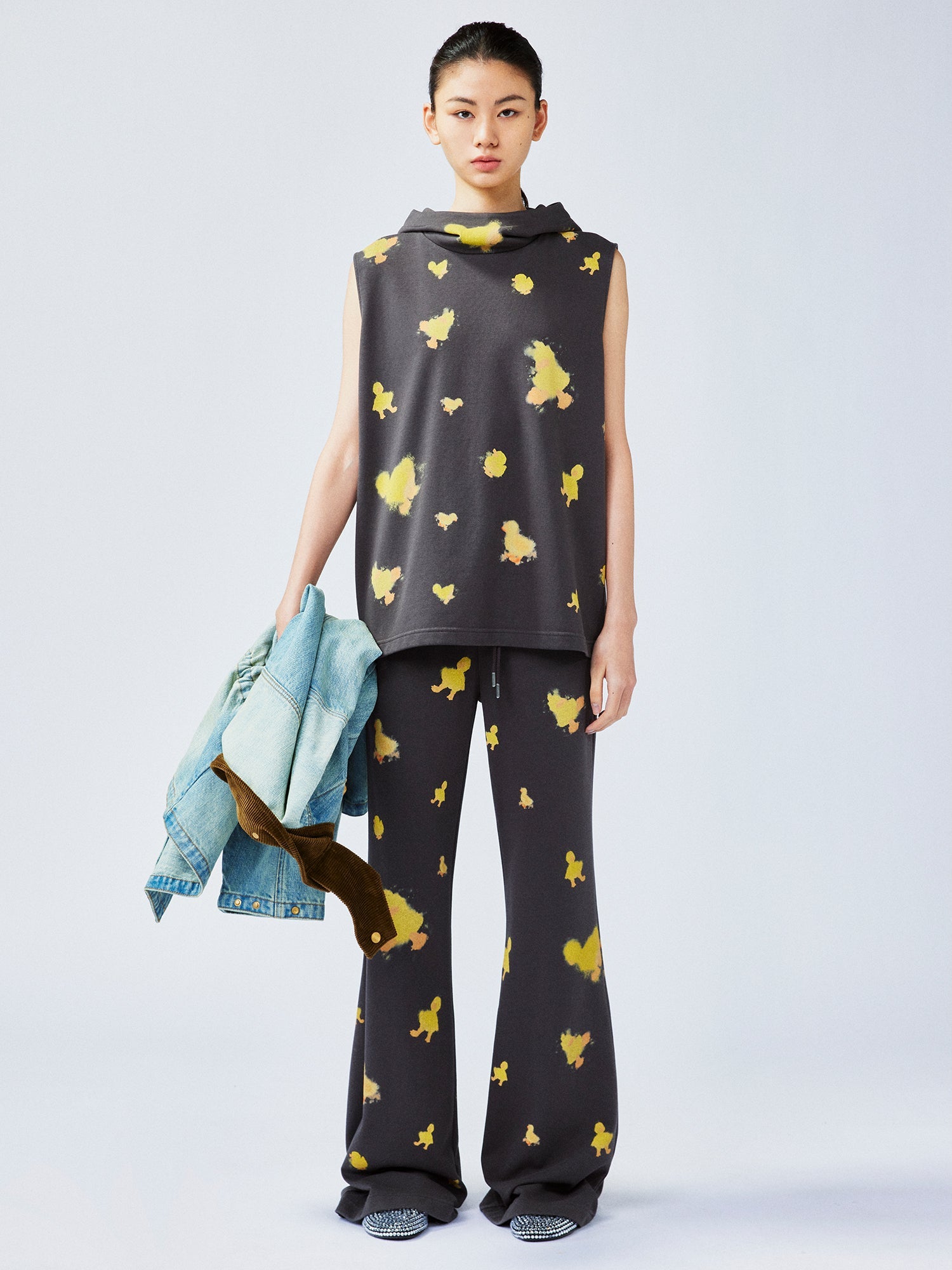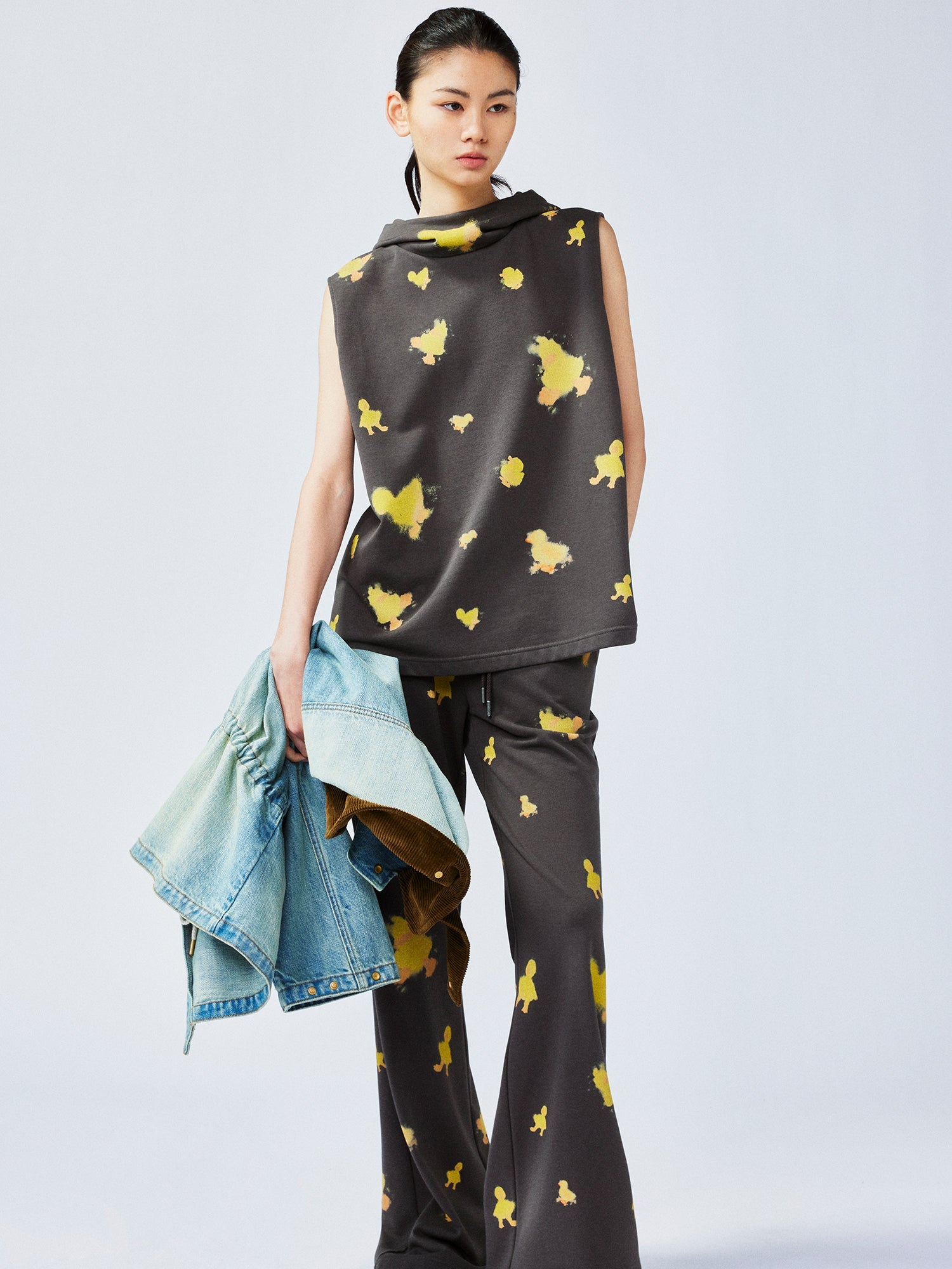 The "I" duck in various sizes and poses is featured on the hoodie vest, creating a youthful and fun vibe.