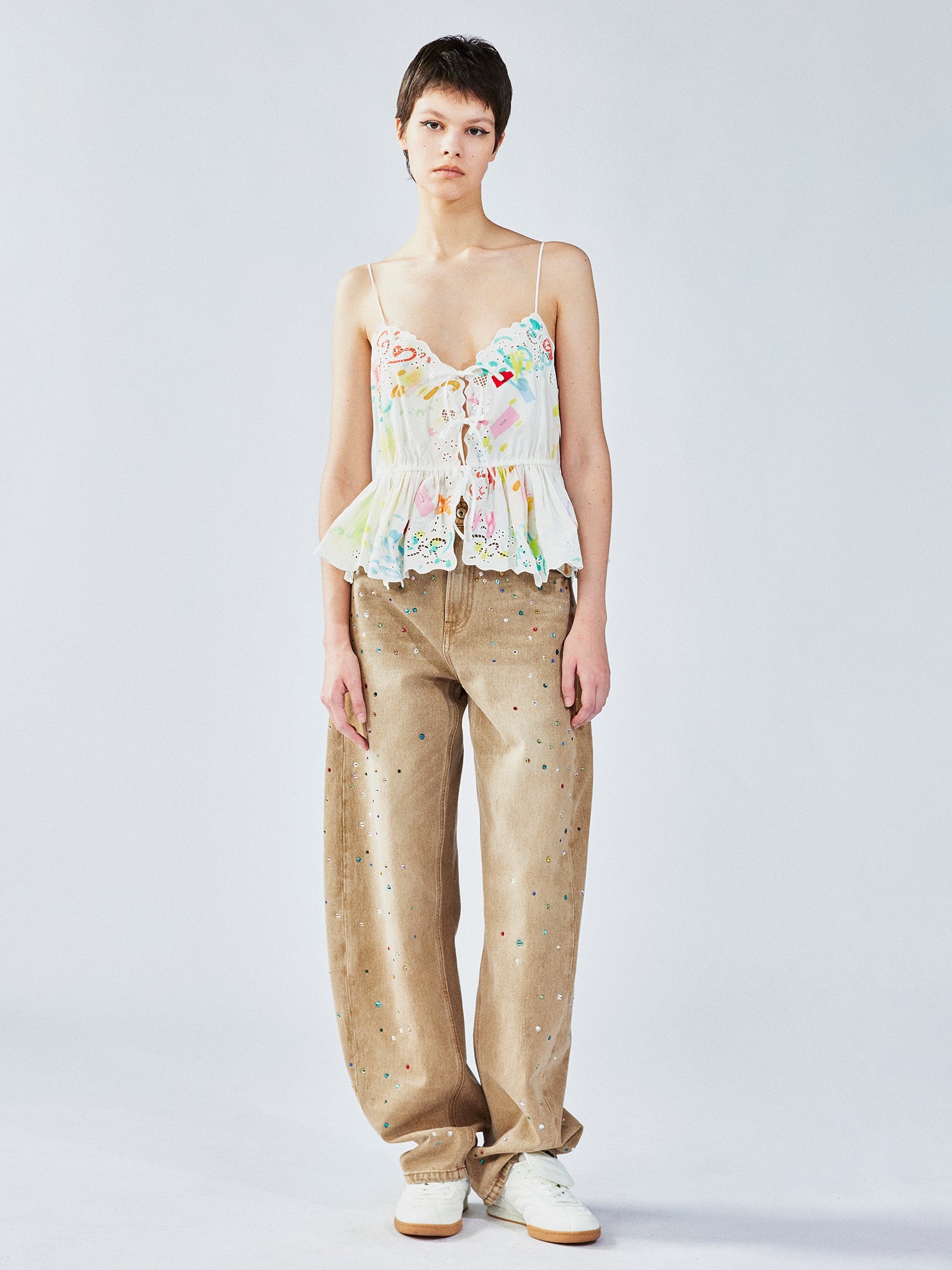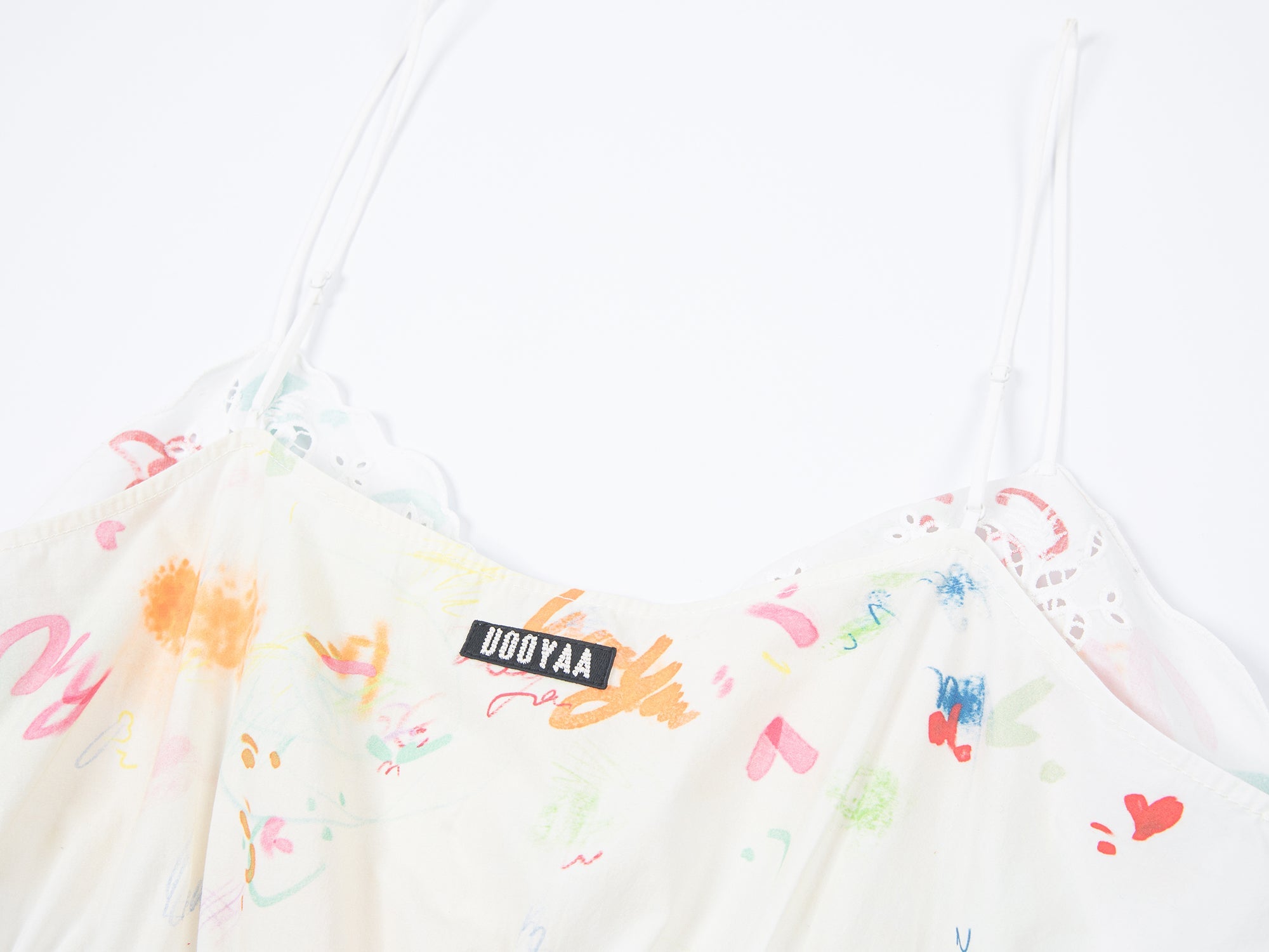 Graffiti prints and stapled fabric scraps collide in this free-spirited remake. The result is a fun, playful camisole full of character.