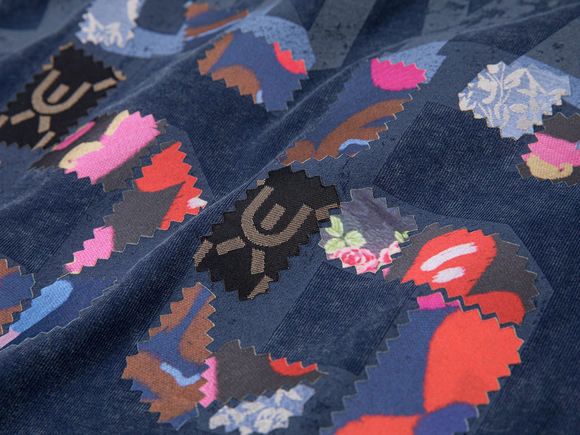 Dynamic cherries are remade through freestyle floral patchwork, adding a playful and cheeky twist to the classic tee.