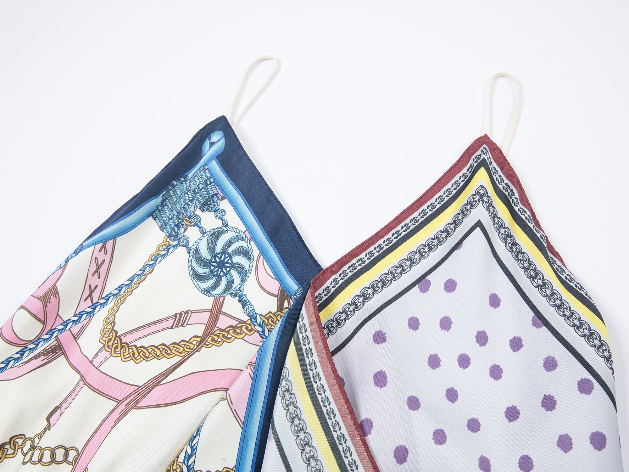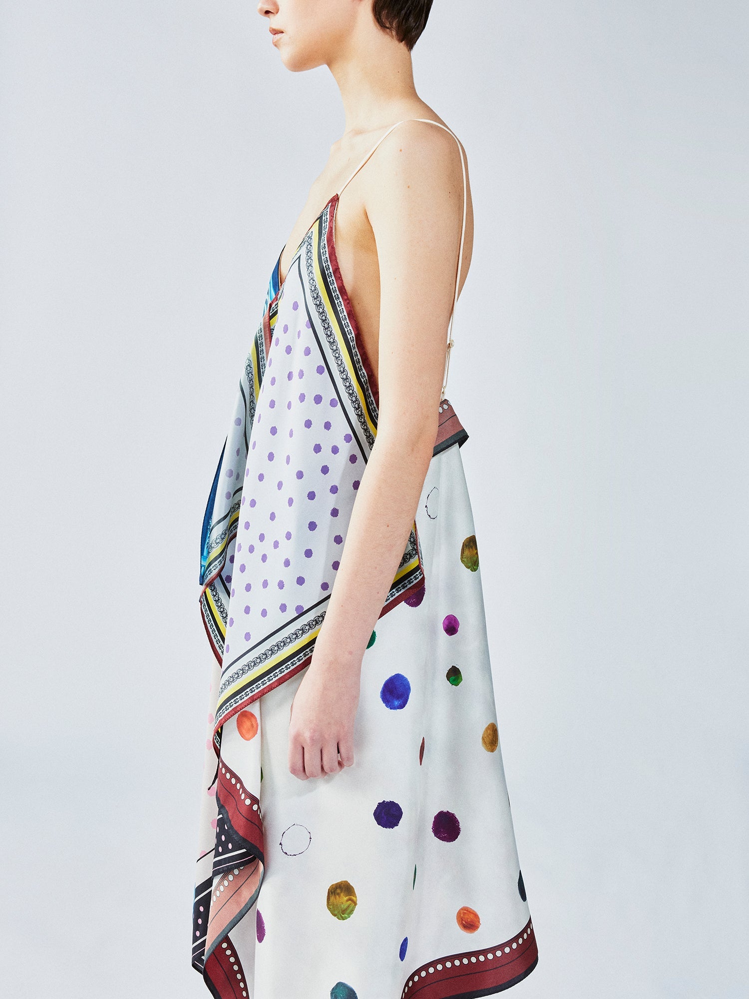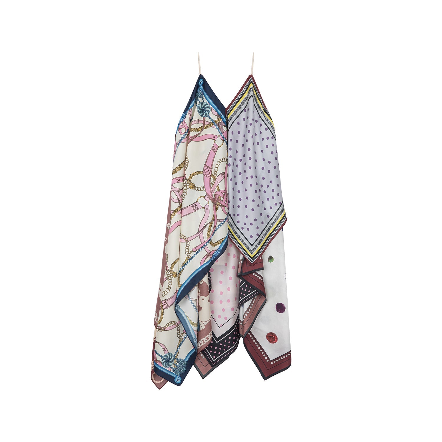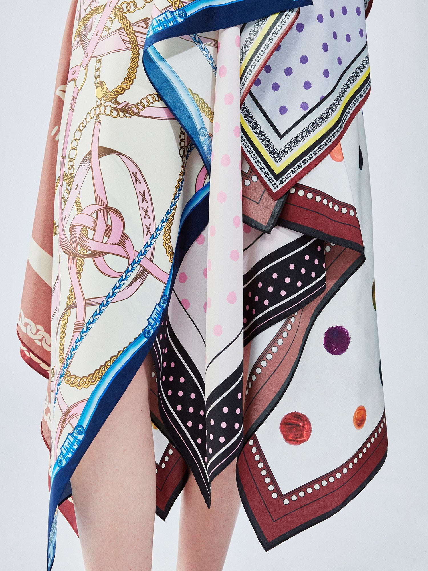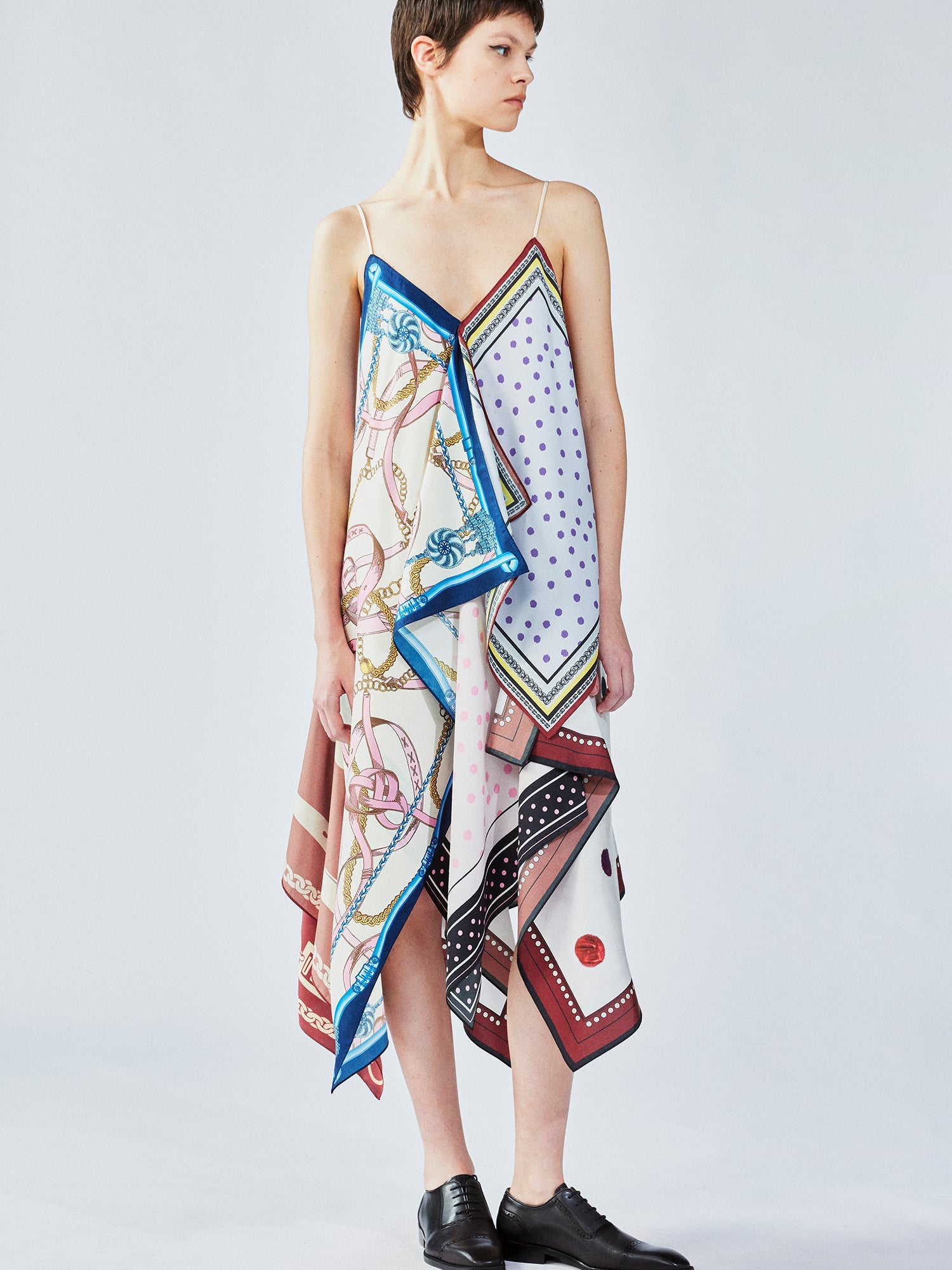 This dress uses irregular scarf patchwork to channel an effortless vacation feel.