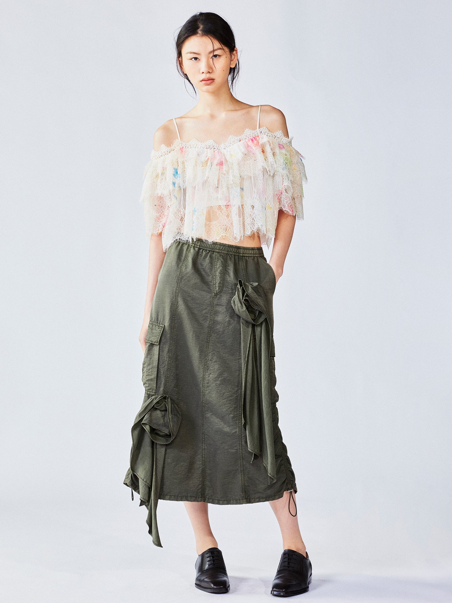Crafted from layered lace with an off-shoulder cut to flatter the arms and express youthful softness.