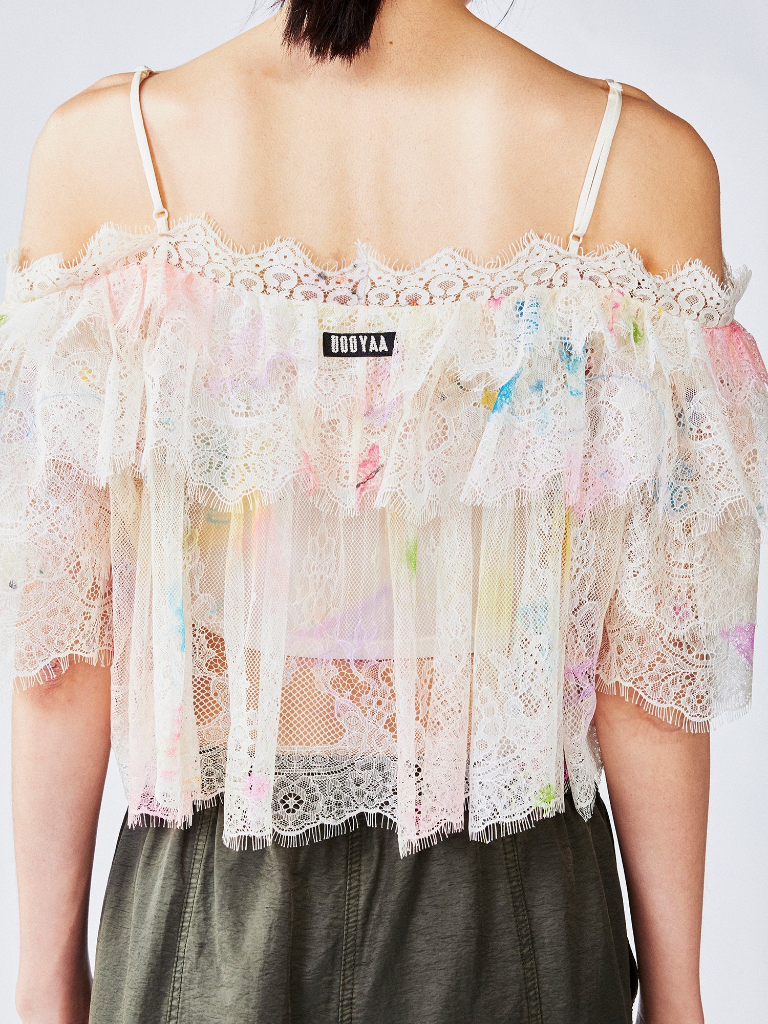 Dreamy spray-painted strokes and soft color bring whimsical fantasy to this lace camisole, full of youthful charm.