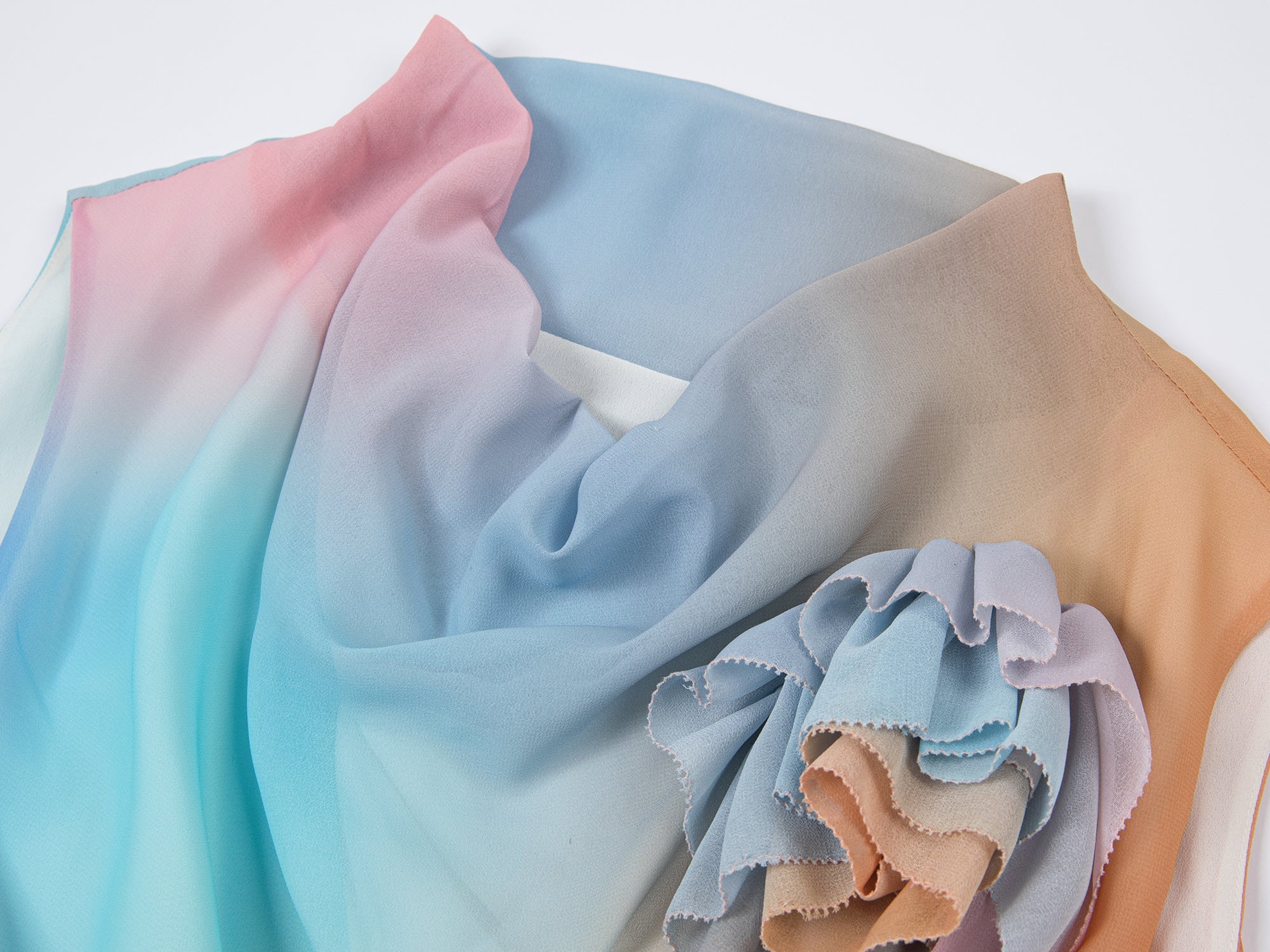 Semi-sheer chiffon with layered floral appliqué. Creates soft movement with delicate charm.