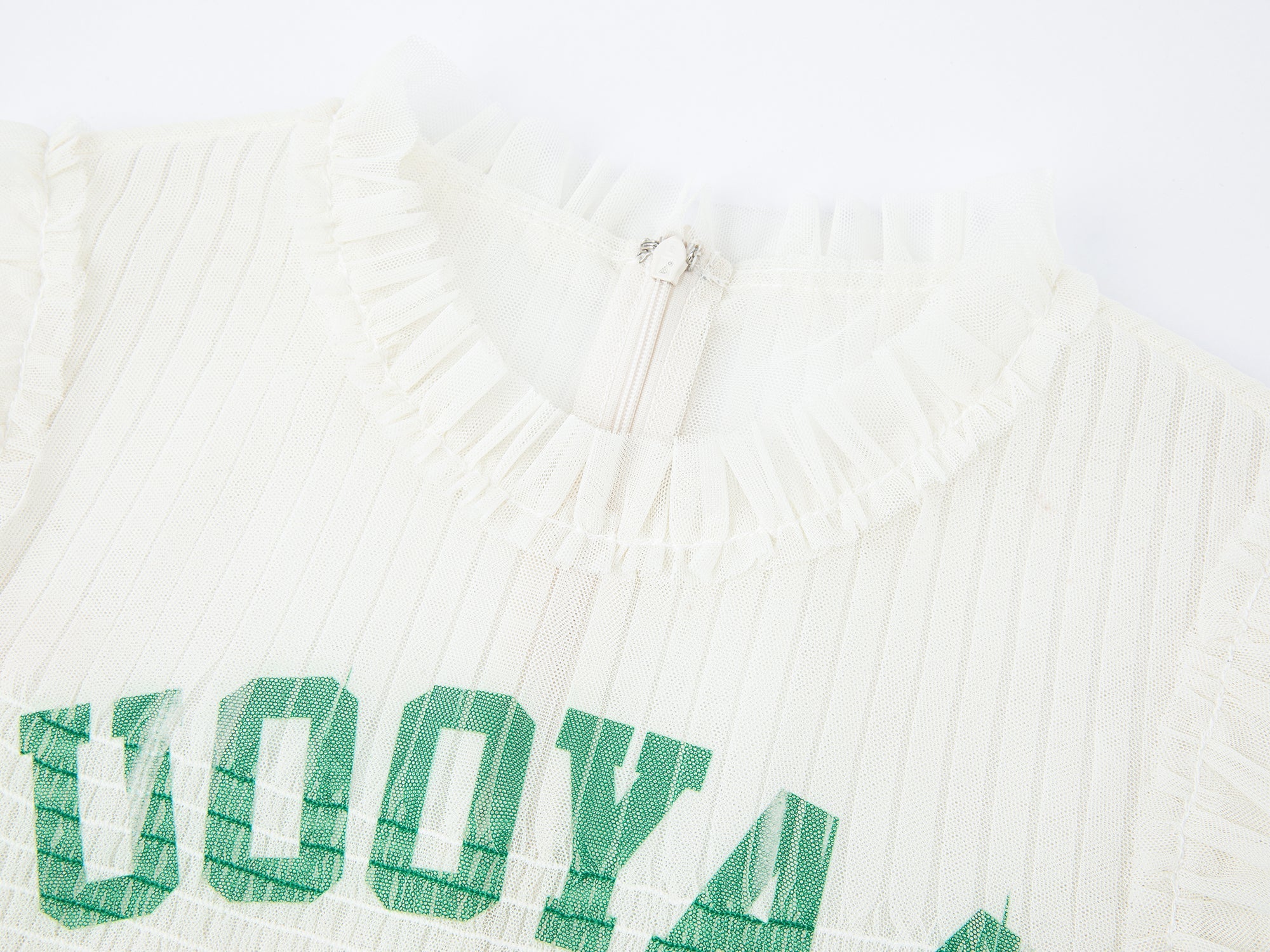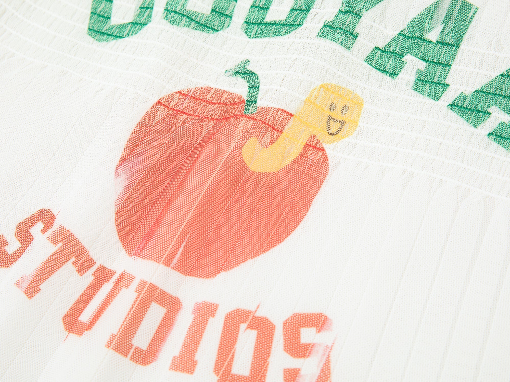 Made with pleated mesh and the signature Apple Bug logo print. Ruffled trims at neck and armholes shape a playful A-line silhouette.