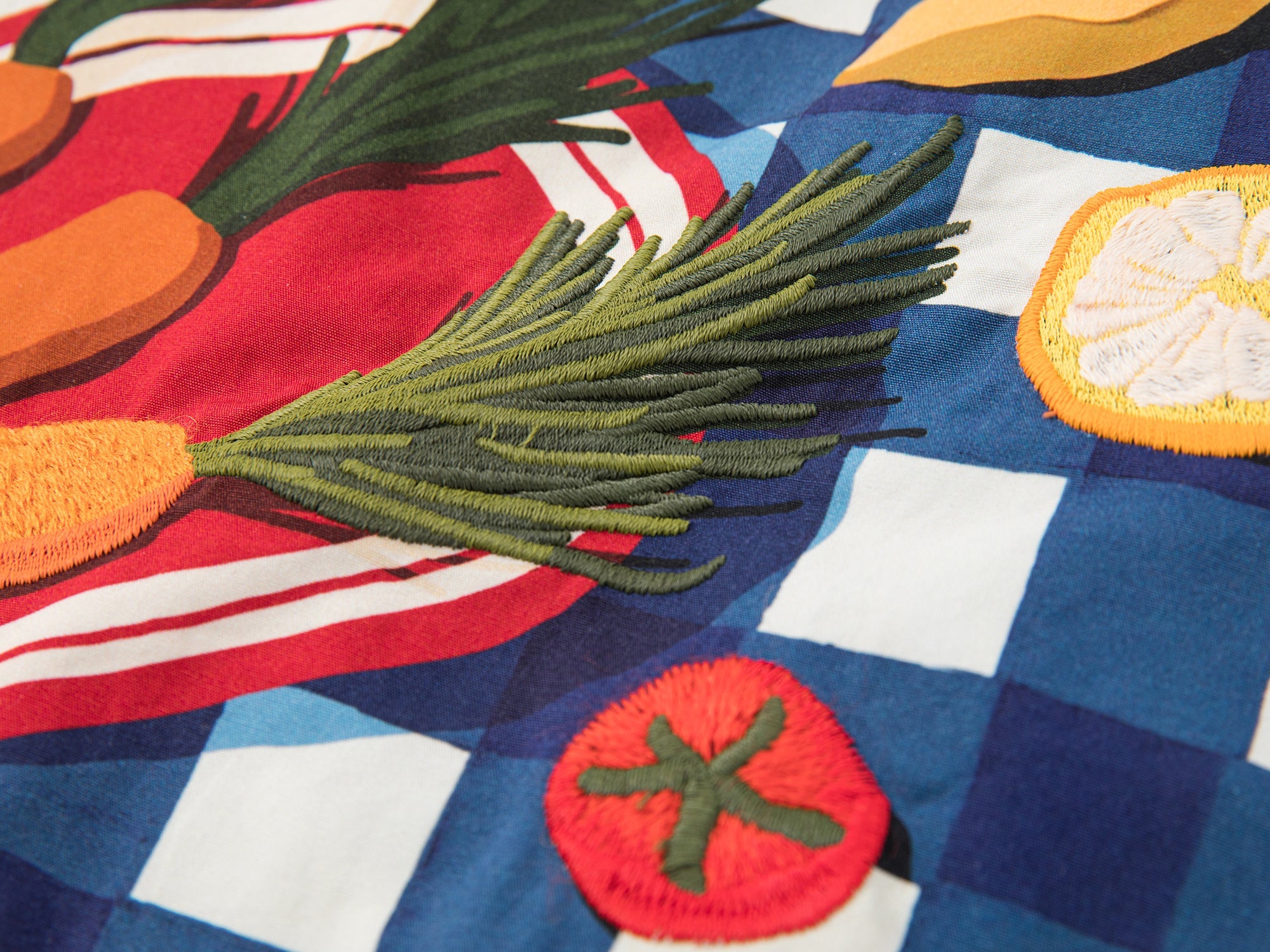 A lively picnic comes to life through embroidered veggies and a gingham mat???frozen in a joyful moment.