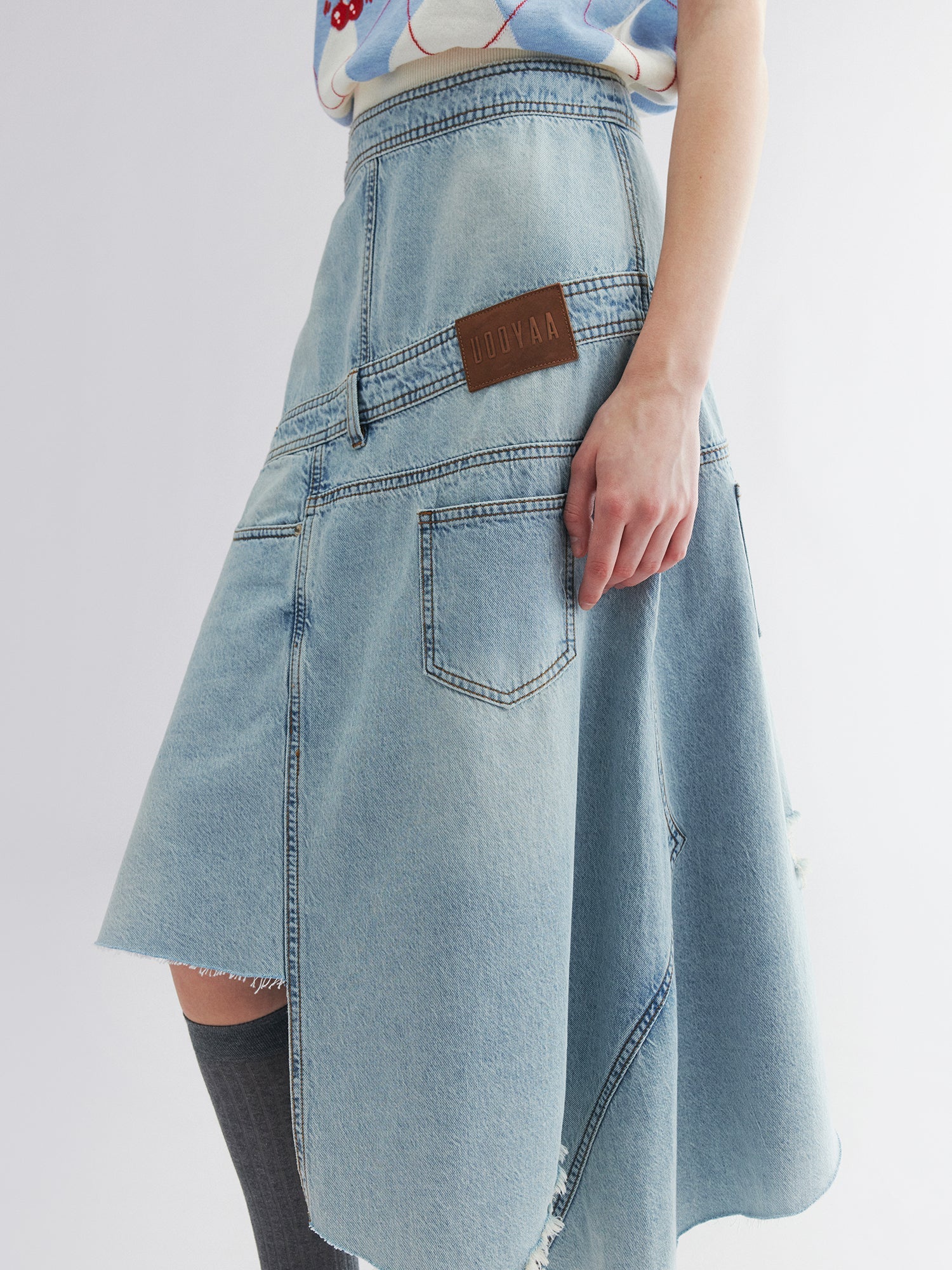 A deconstructed denim skirt with raw diagonal edges and playful asymmetry.