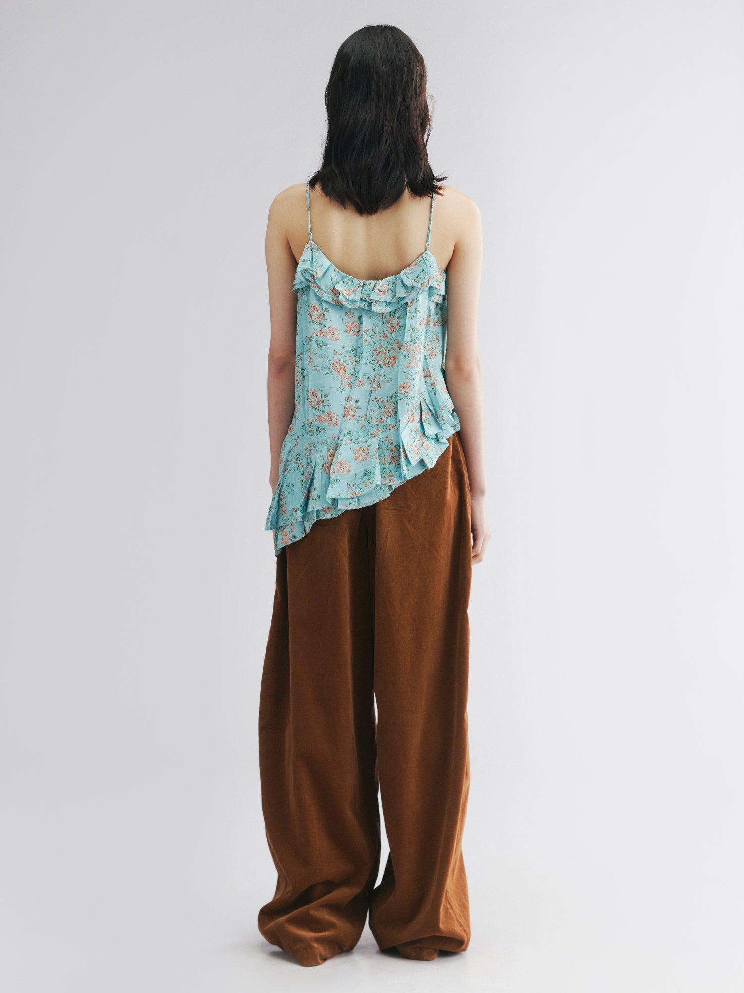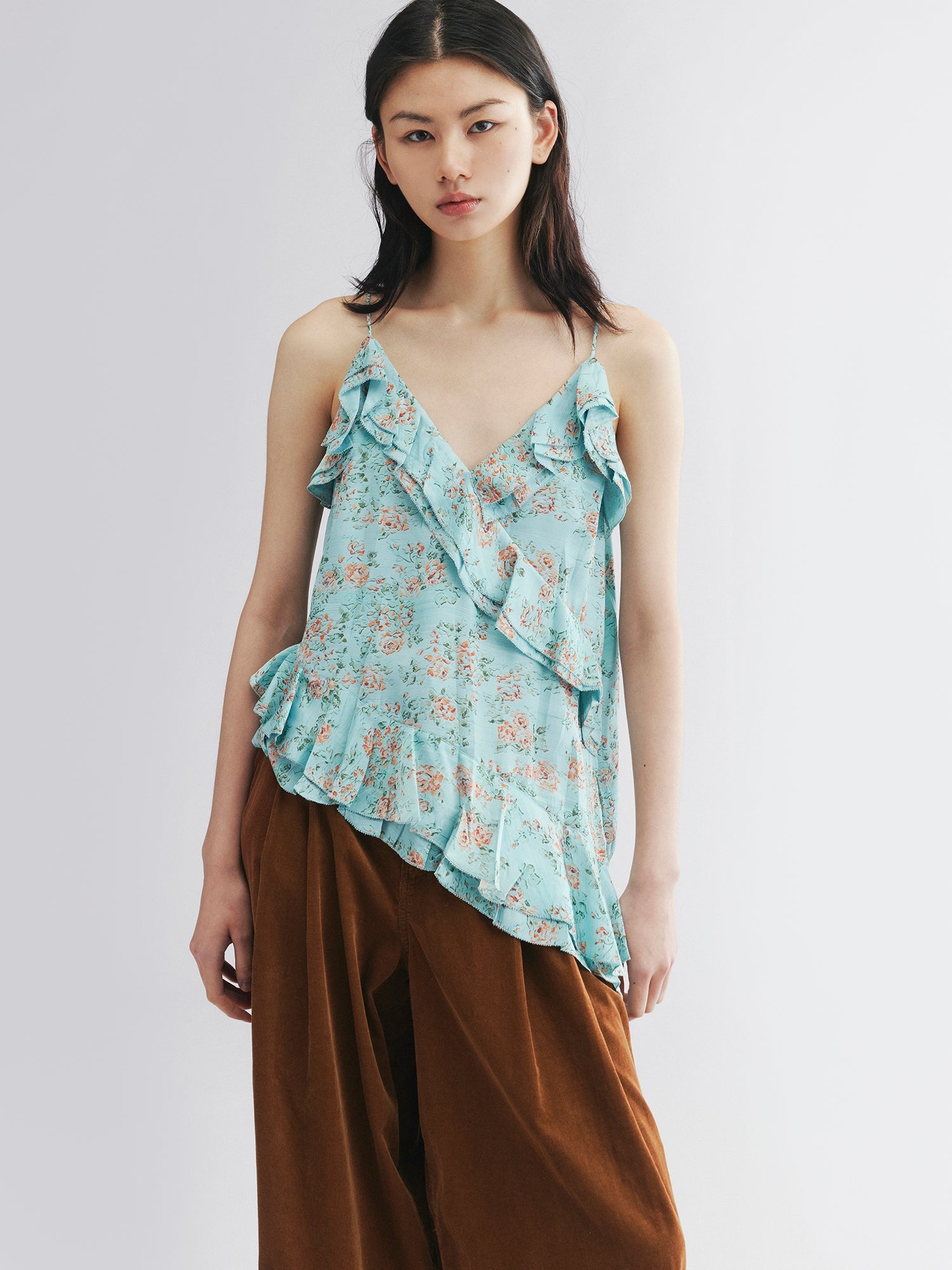 Recreates the unpressed wrinkles of a vintage camisole tucked away for years. The floral print uses palette-knife oil painting textures for a richly artistic feel.