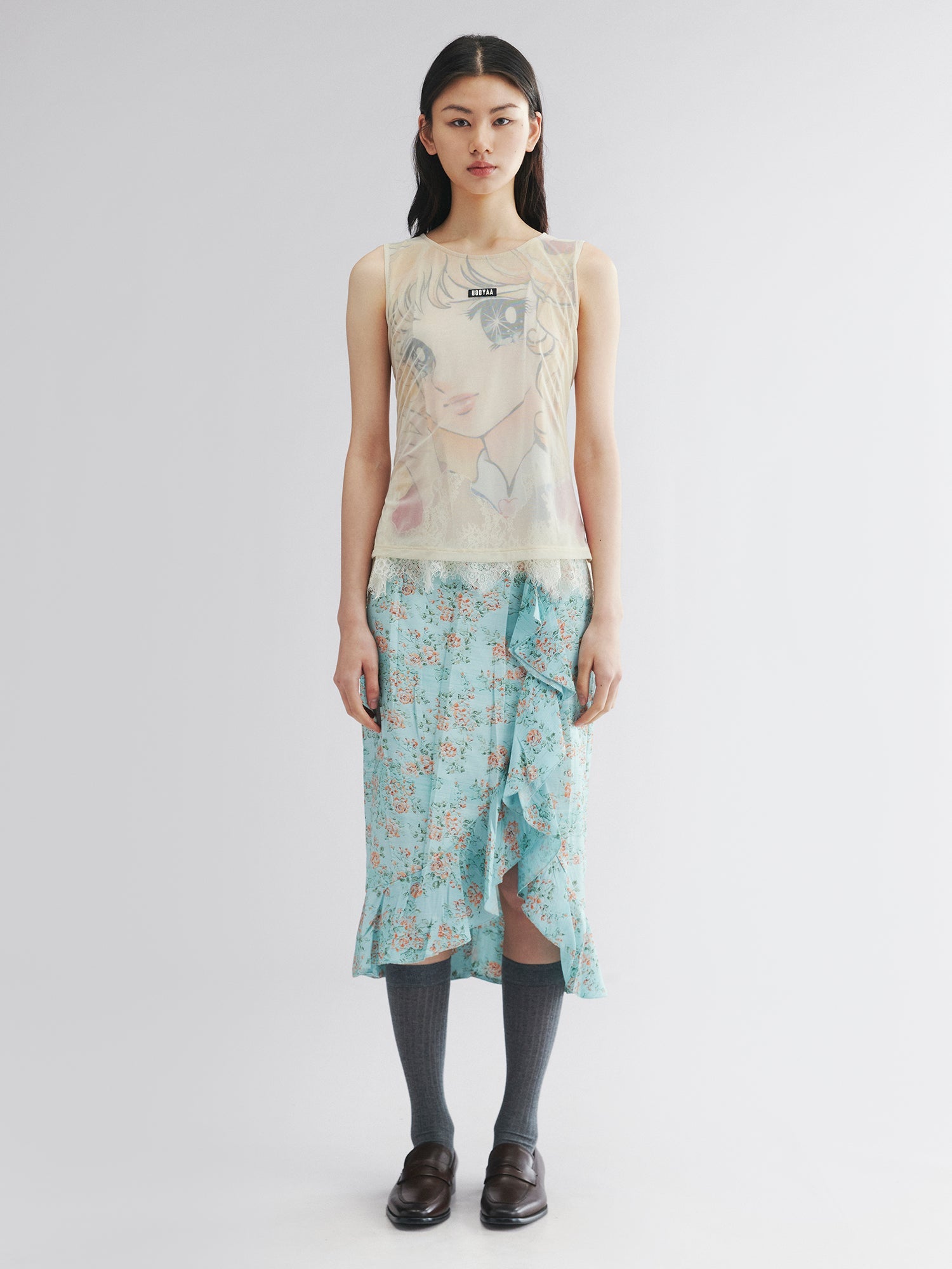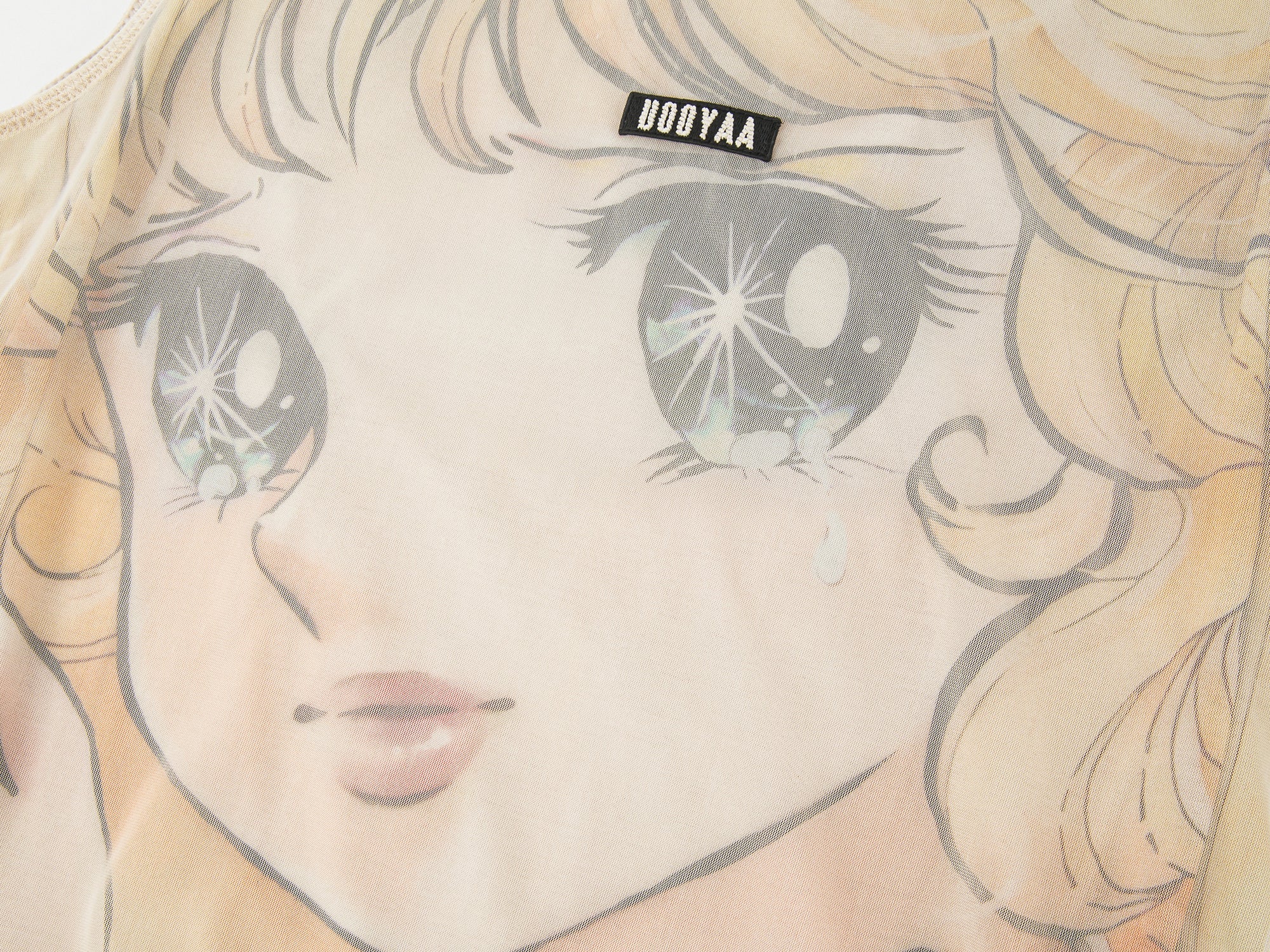 Layered a fitted mesh vest over a loose one to create organic creases. The contrast with the detailed anime girl graphic reflects a relaxed and expressive attitude.