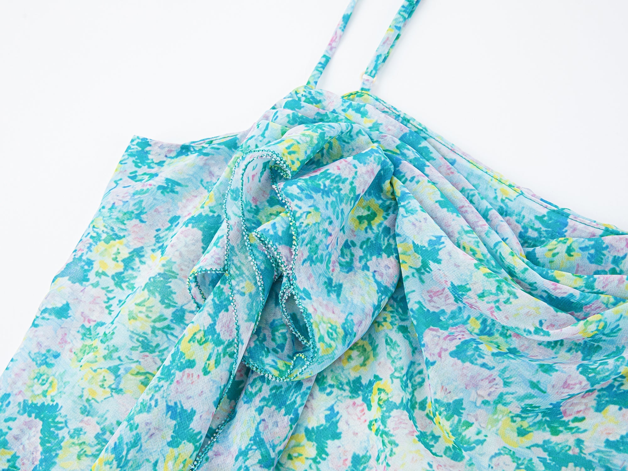 Lightweight chiffon with draped asymmetry and 3D florals captures an artistic take on romance in soft blue-green blooms.