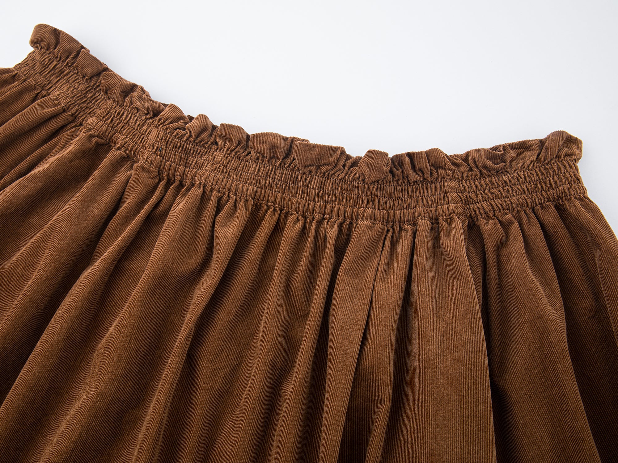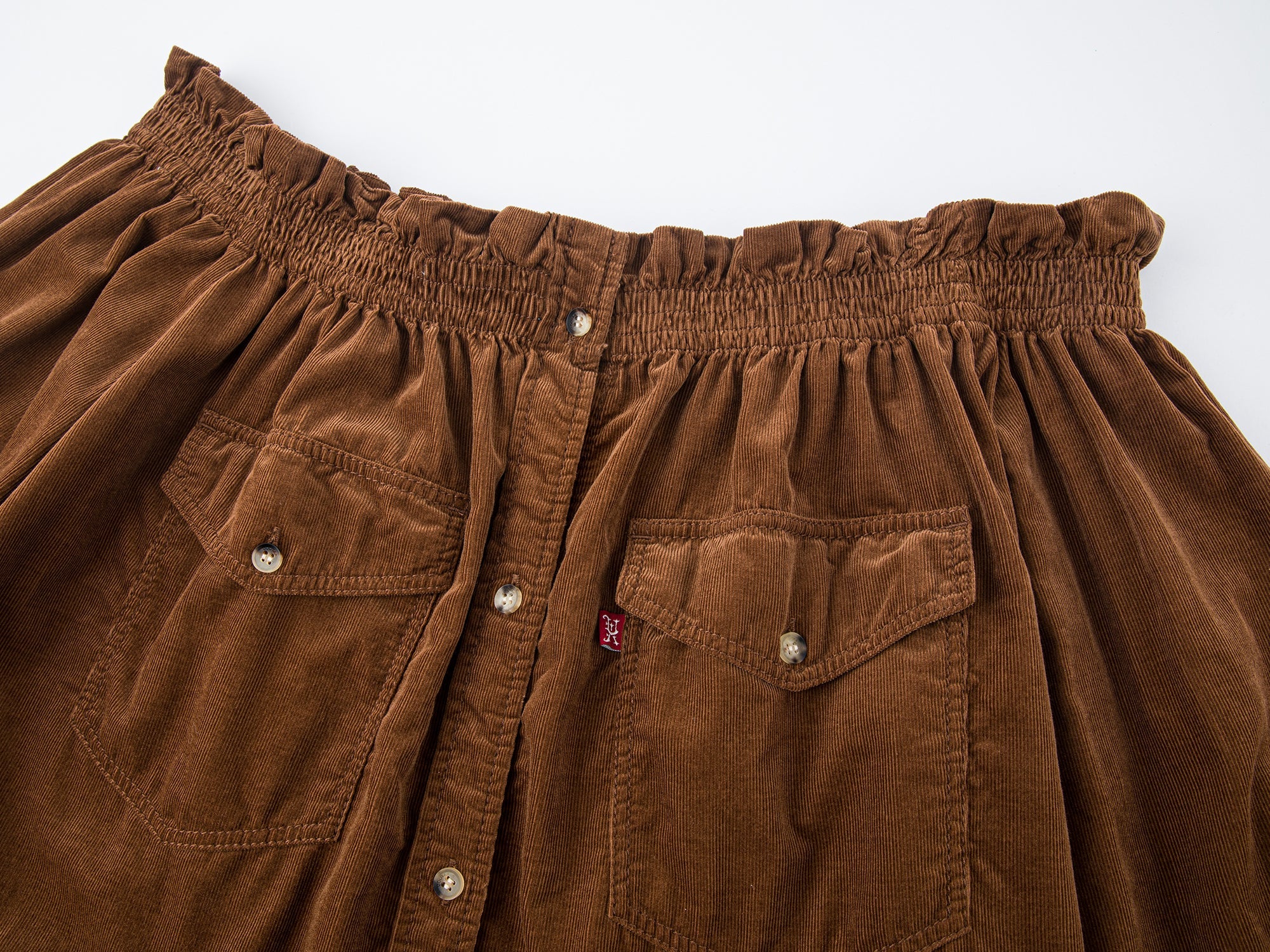 An off-shoulder twist adds sensuality to a rugged utility shirt in warm coffee-tone corduroy.