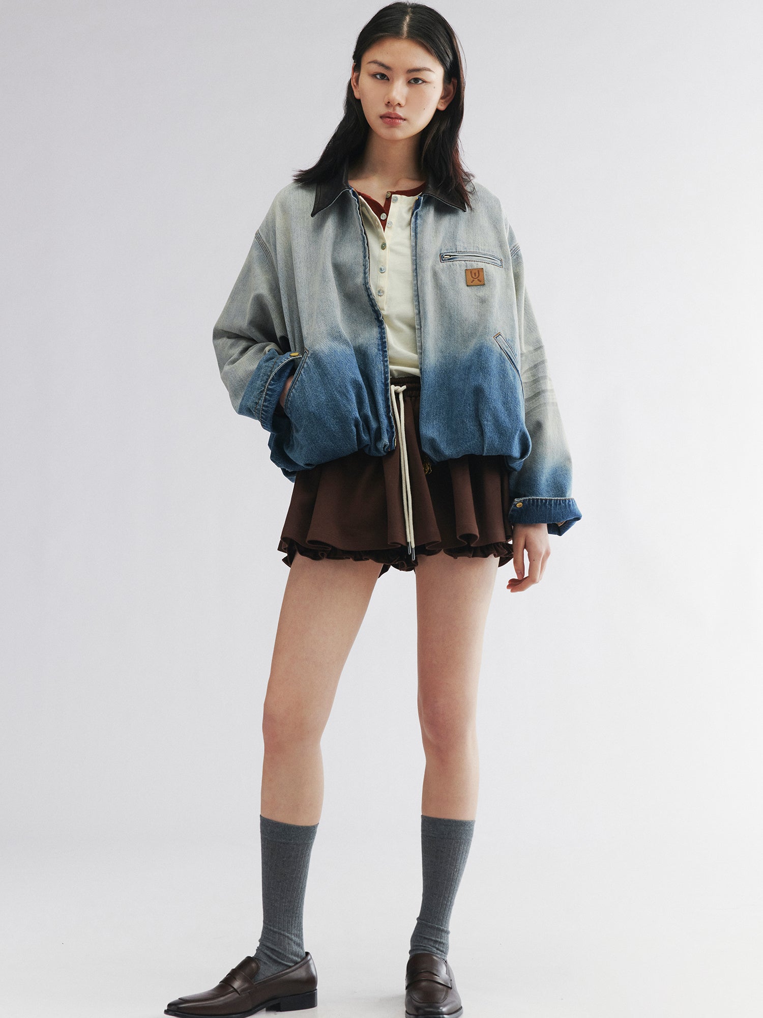 Soft denim and a gathered bubble hem soften the classic Detroit jacket silhouette. The gradient wash adds a youthful mood.