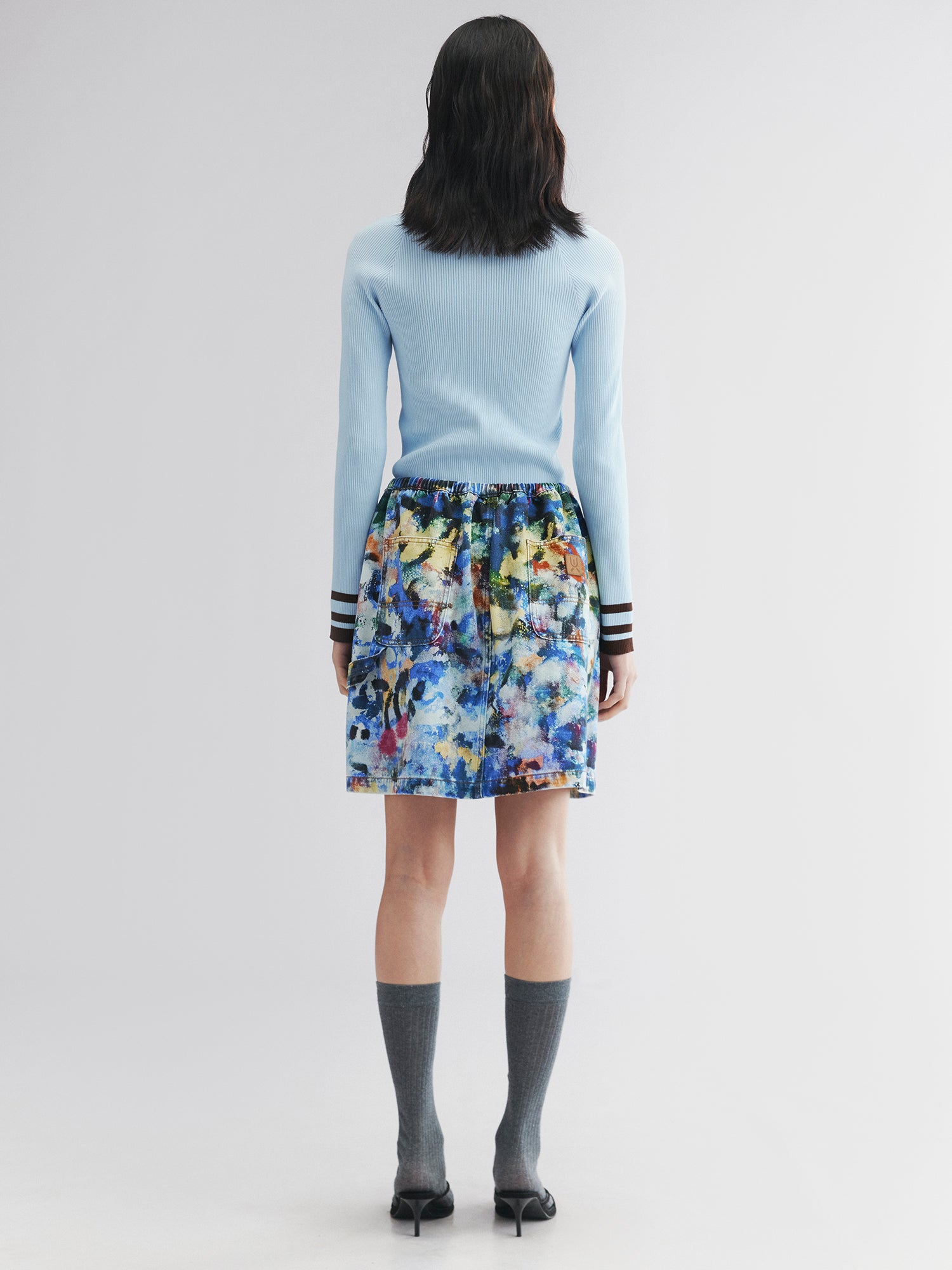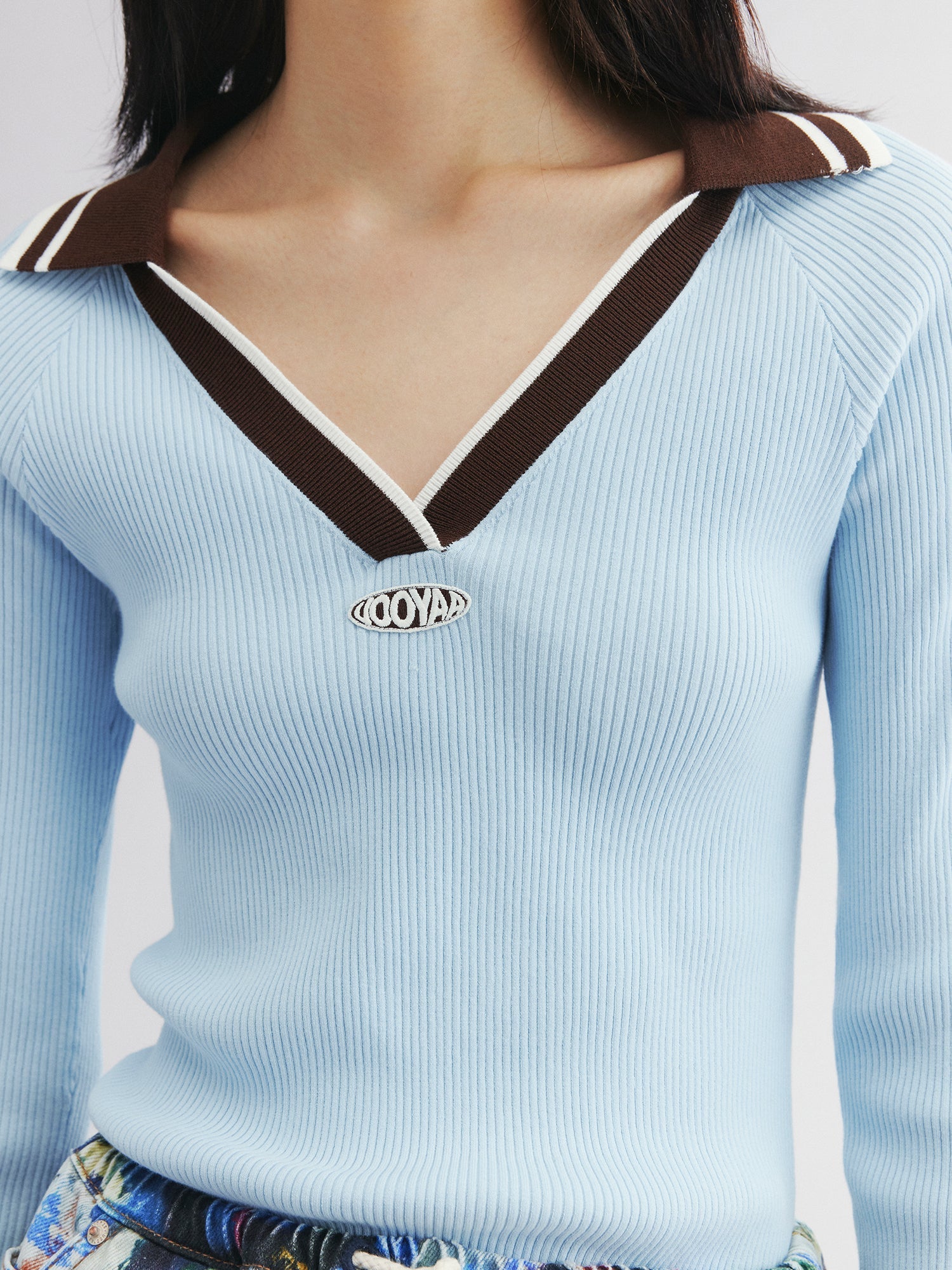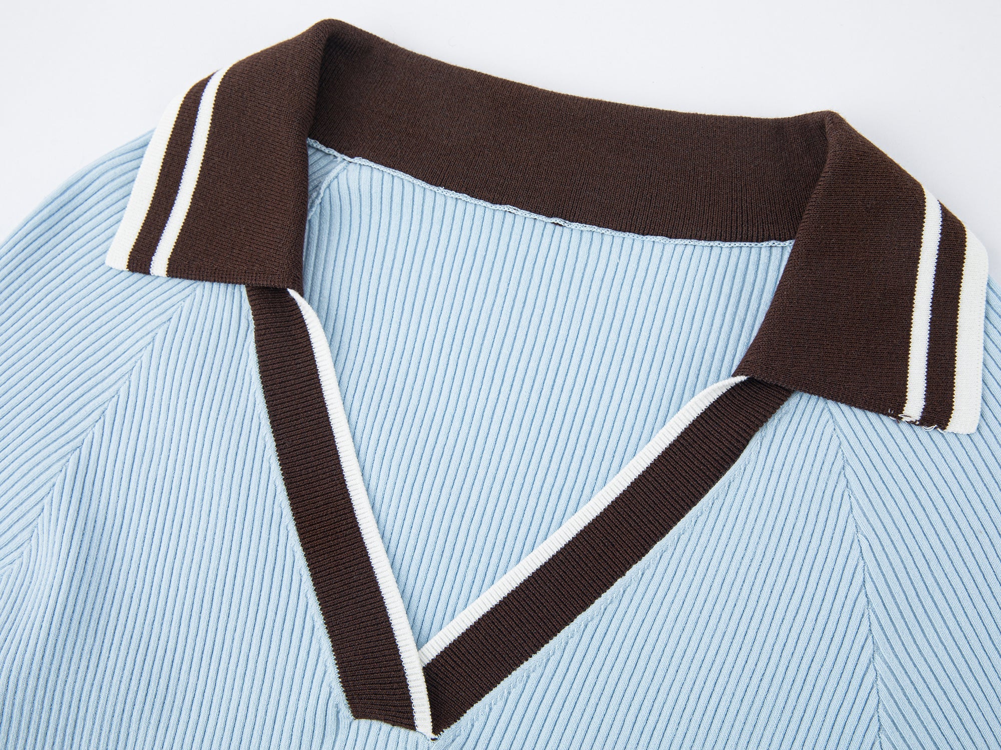 Color-blocked polo collar and stripes bring athletic energy. Boyish blue, fitted cut, and V-neck flatter the neckline.
