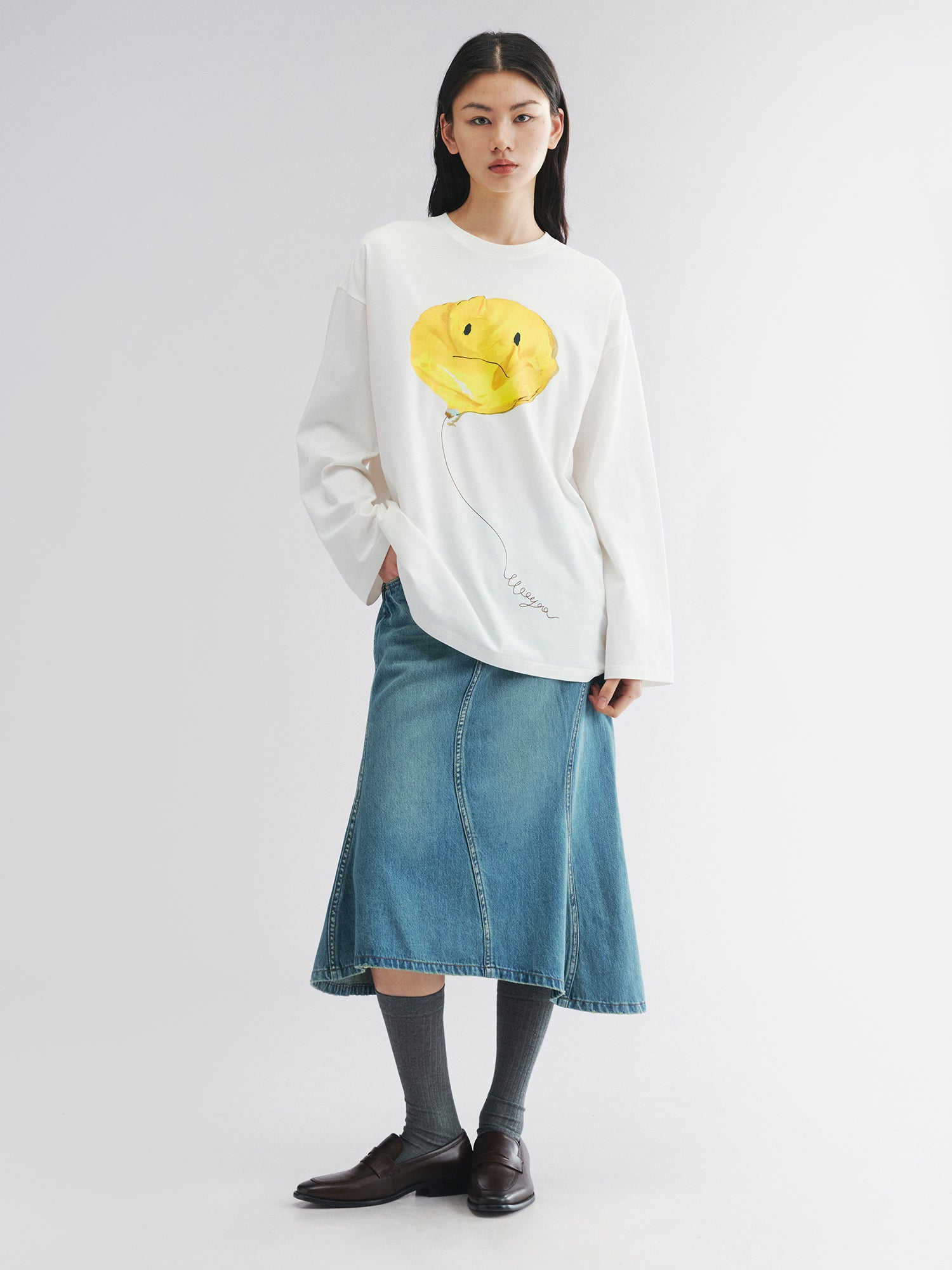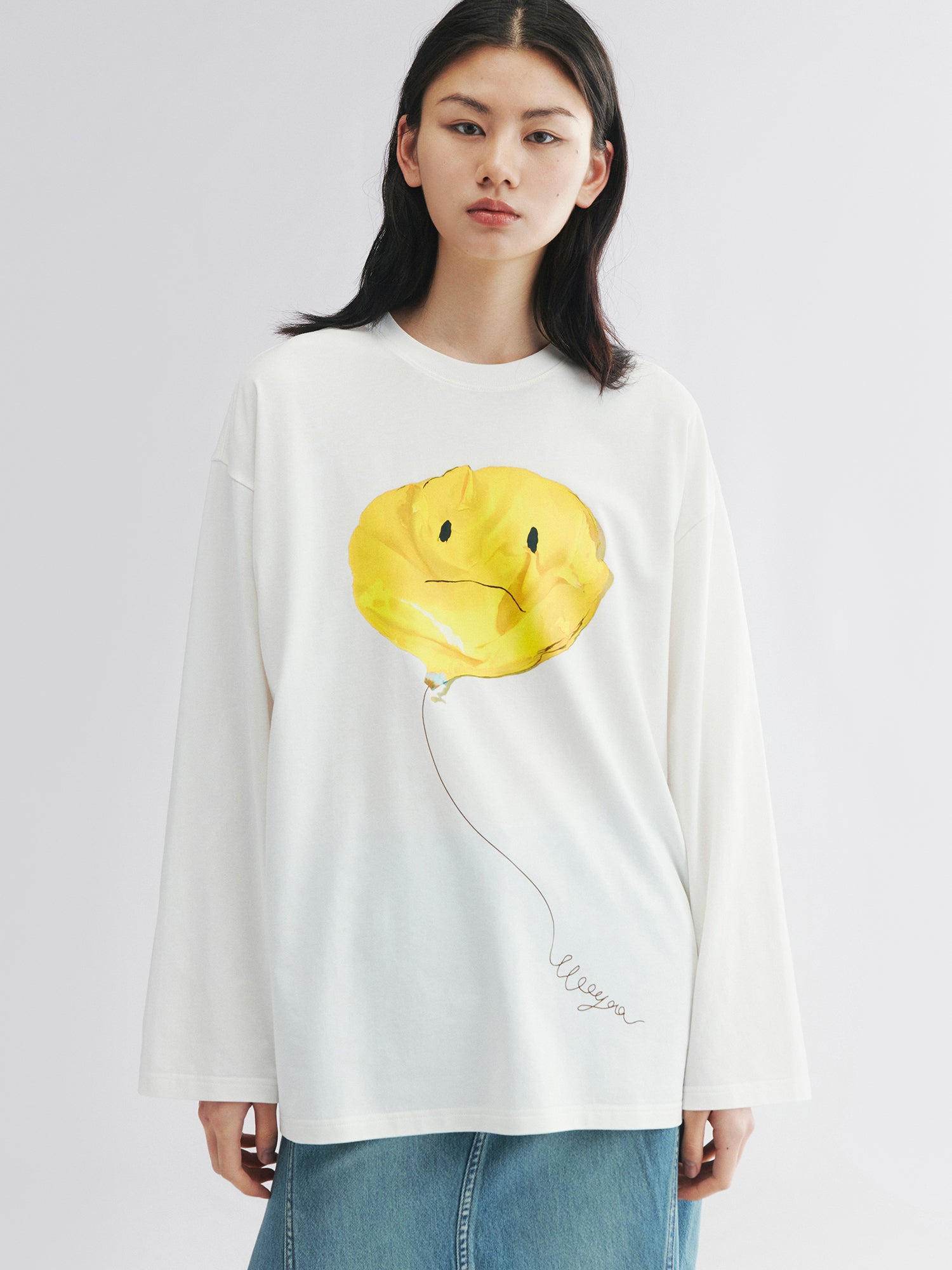 A saggy balloon and sad face graphic humorously say 'Don't Deflate.' The oversized white tee taps into emotional expression with comfort.